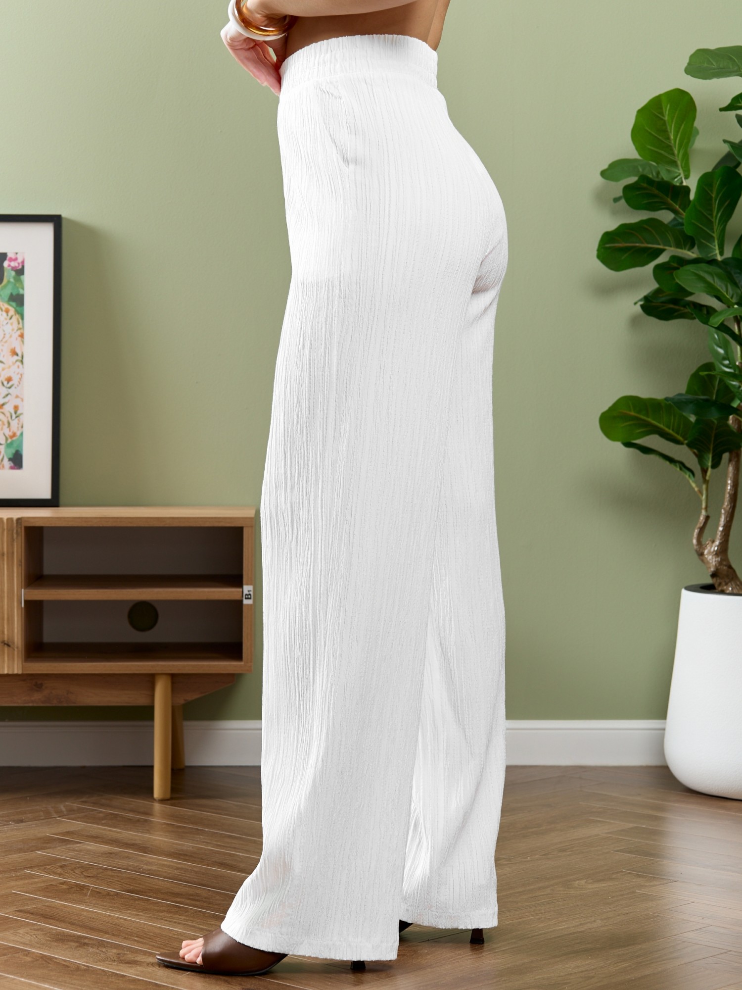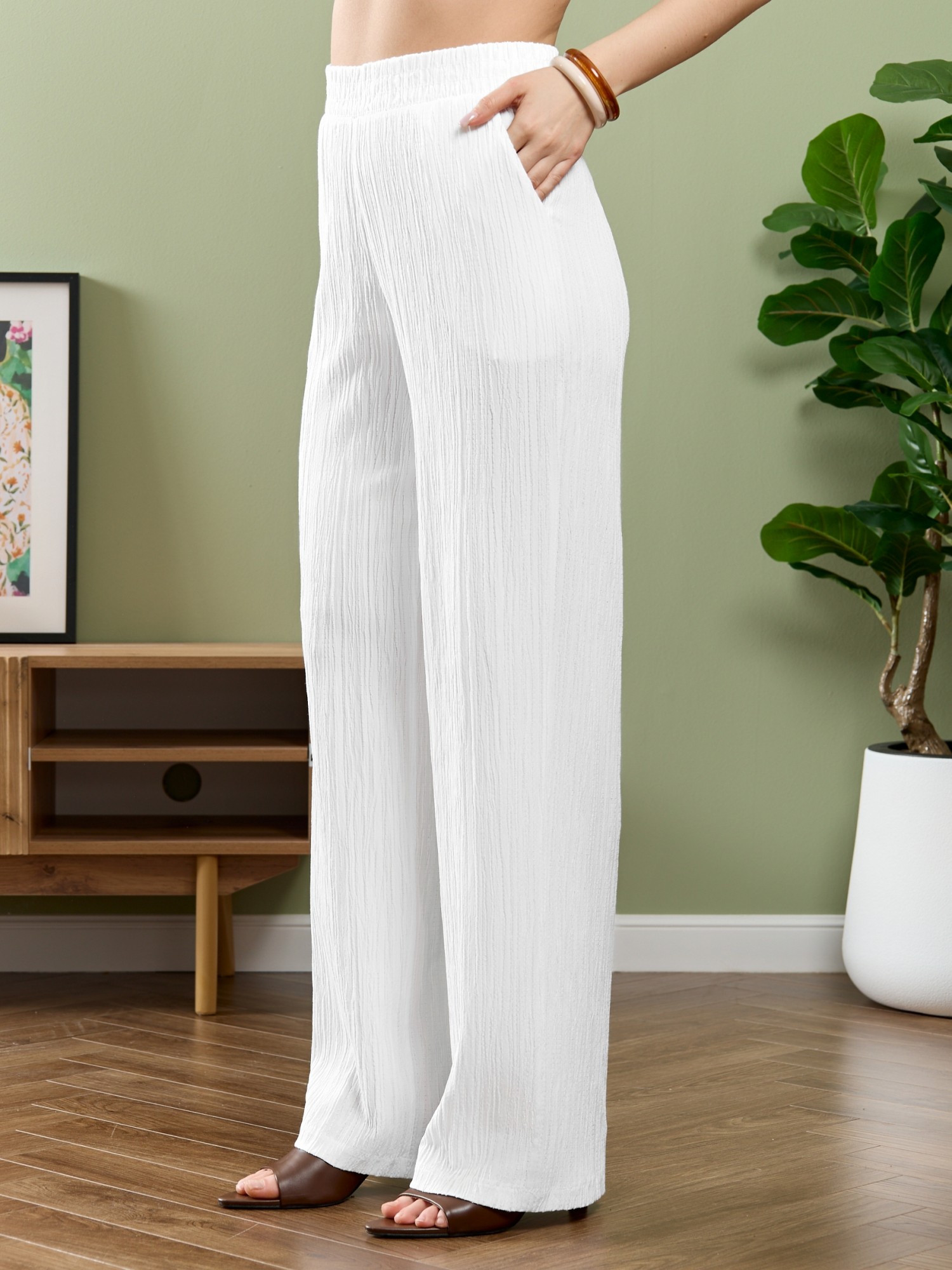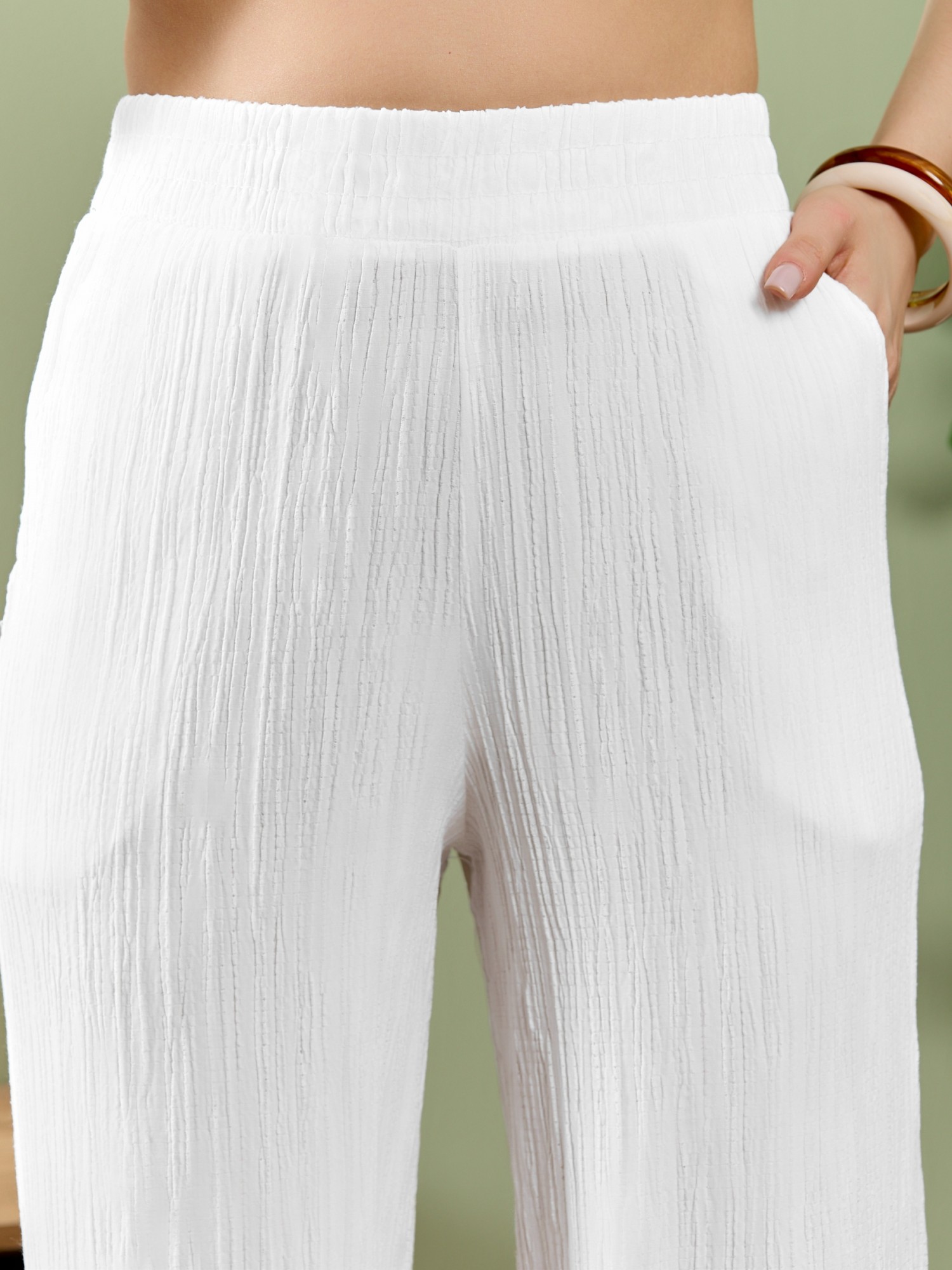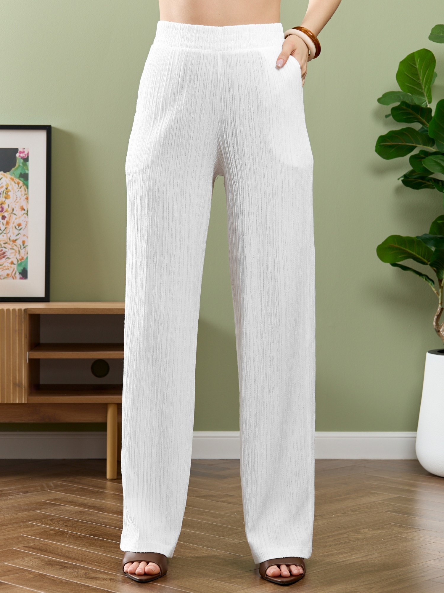 Брюки женские из гладкокрашеного тканого полотна, свободного покроя, с карманами в боковых швах, на притачном поясе с эластичной тесьмой внутри. При выборе изделия в белом цвете идеальным решением будет выбор белья нейтральных оттенков.