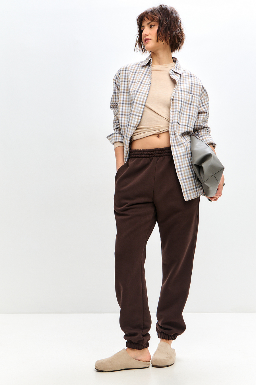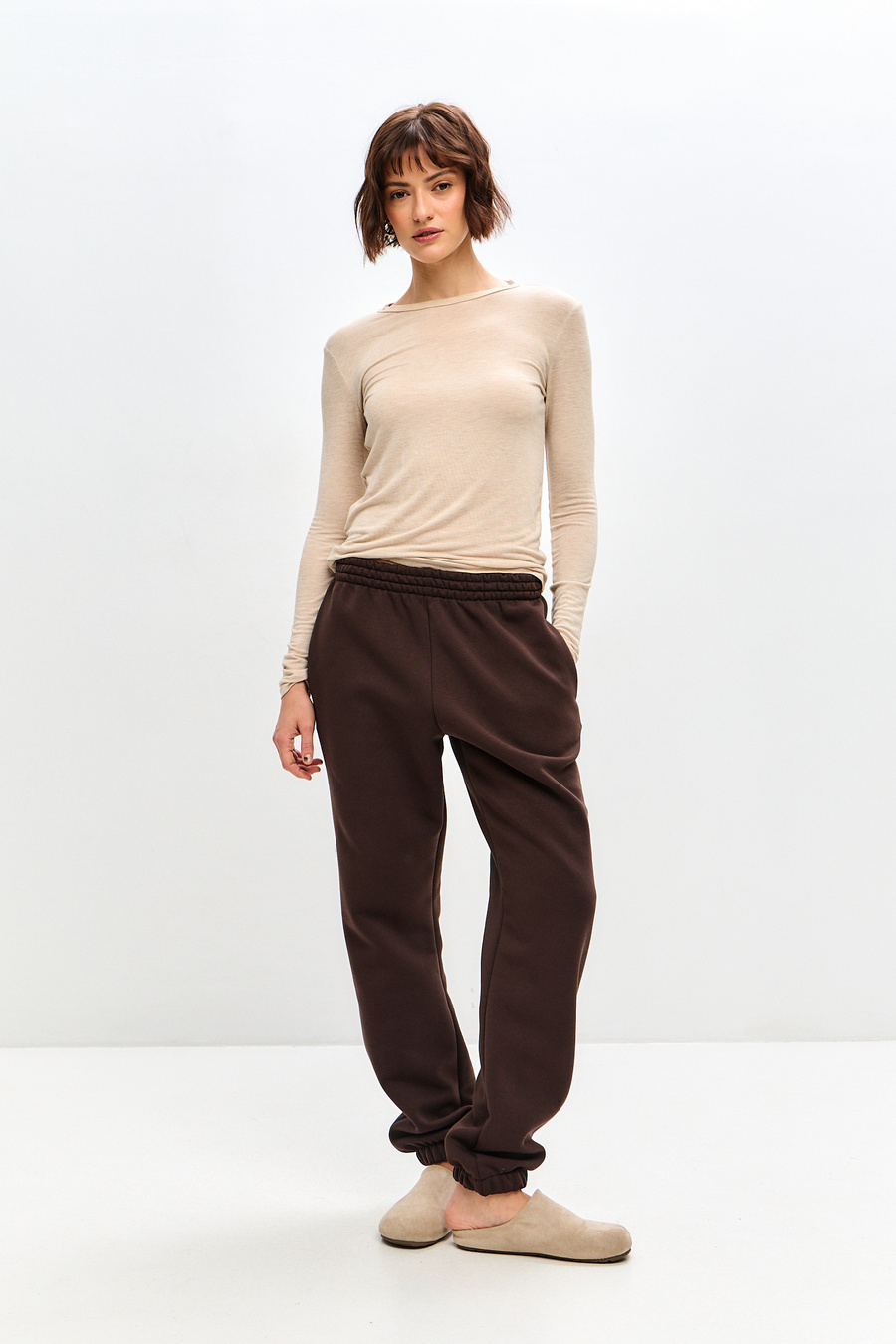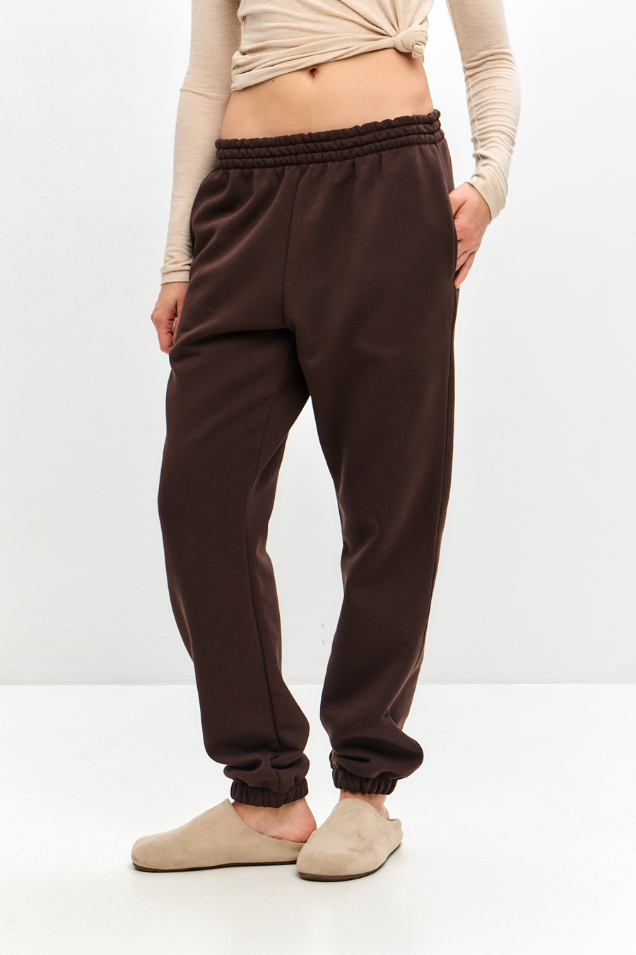 Женские брюки отшиваются из футера с начесом, натуральной хлопковой ткани. Женские брюки на резинке - отличный вариант для занятий спортом, прогулок или в качестве домашней одежды.