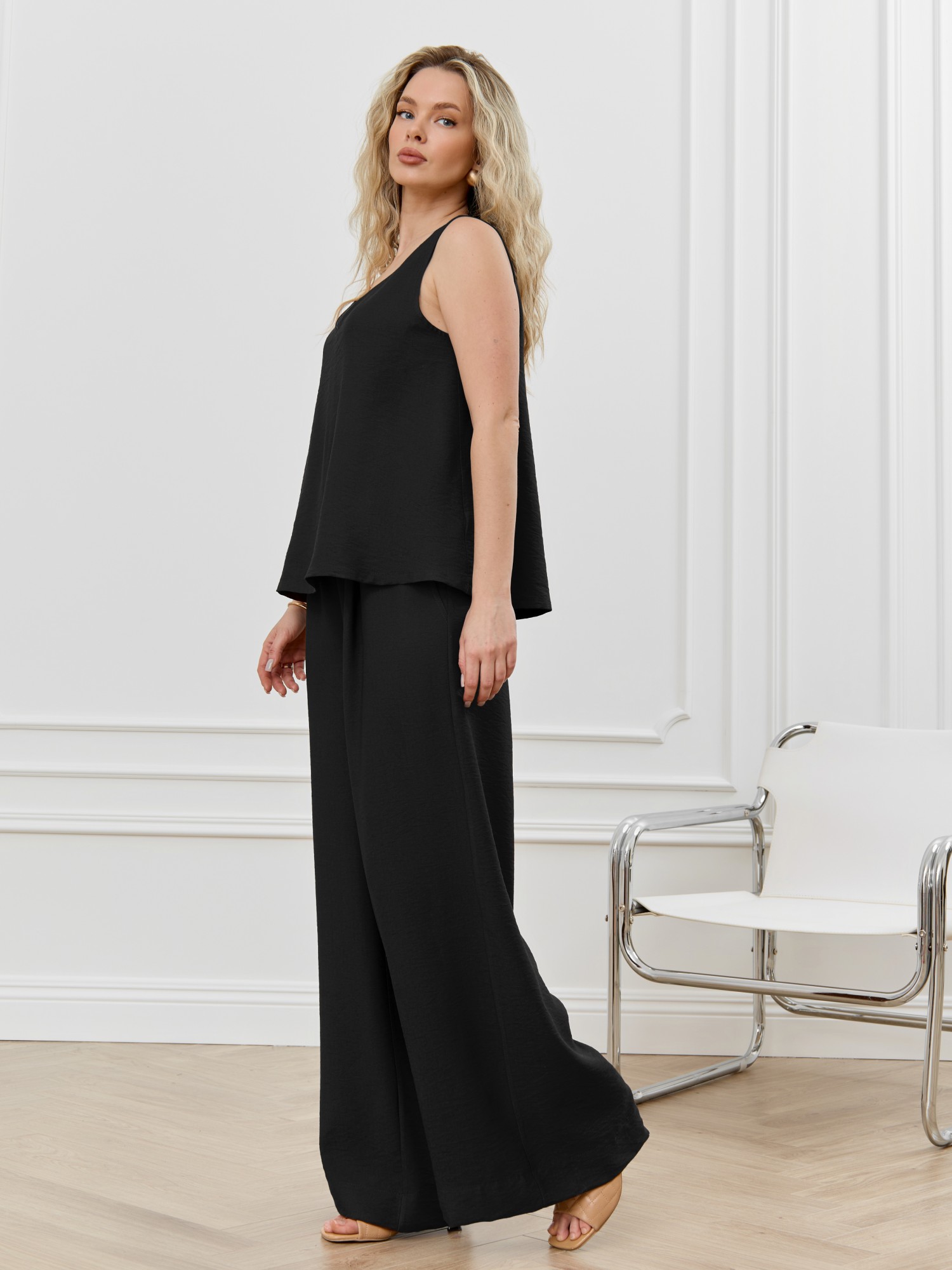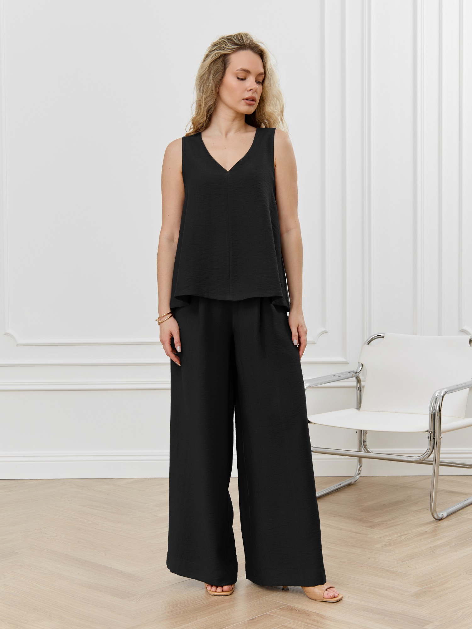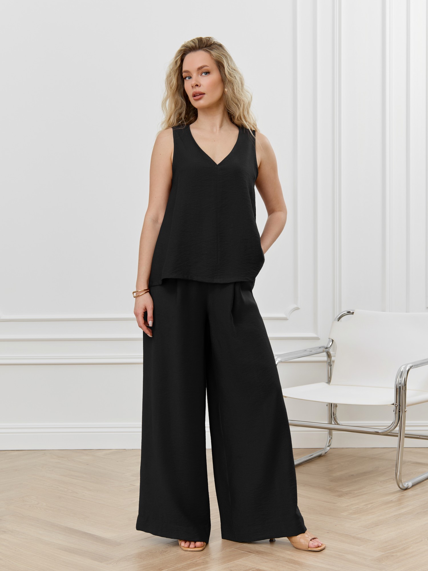 Брюки женские из гладкокрашеного фактурного полотна длинные, широкие по всей длине, на притачном поясе с эластичной тесьмой внутри, с карманами в боковых швах. Модным элементом является широкая подгибка нижних срезов.