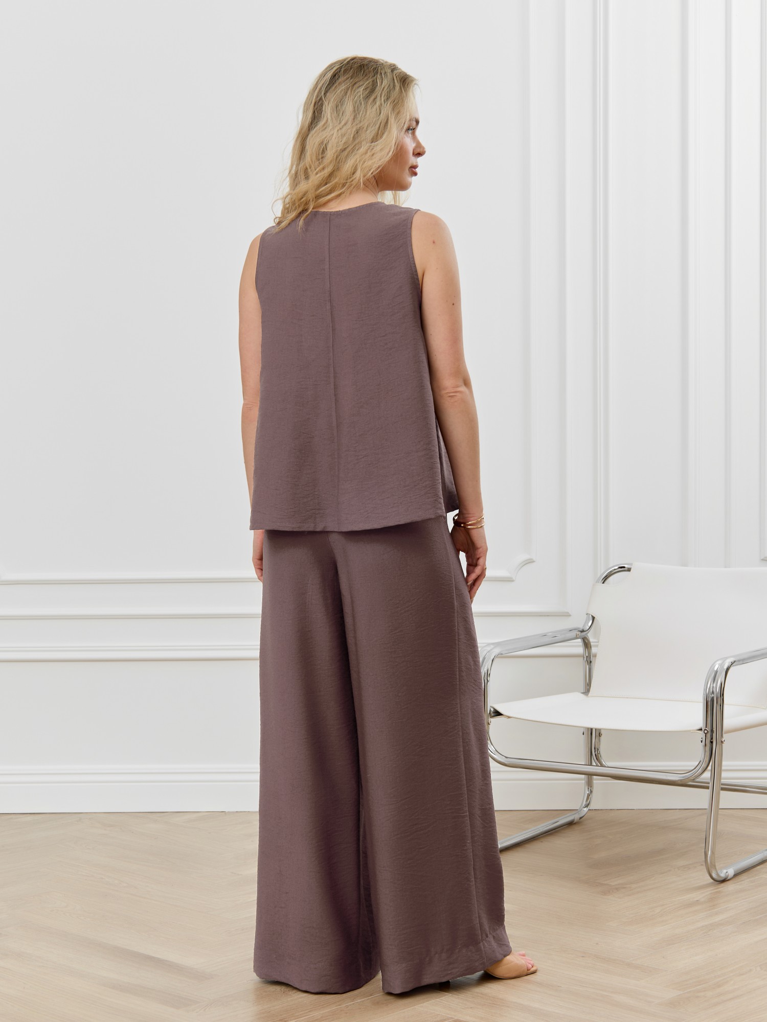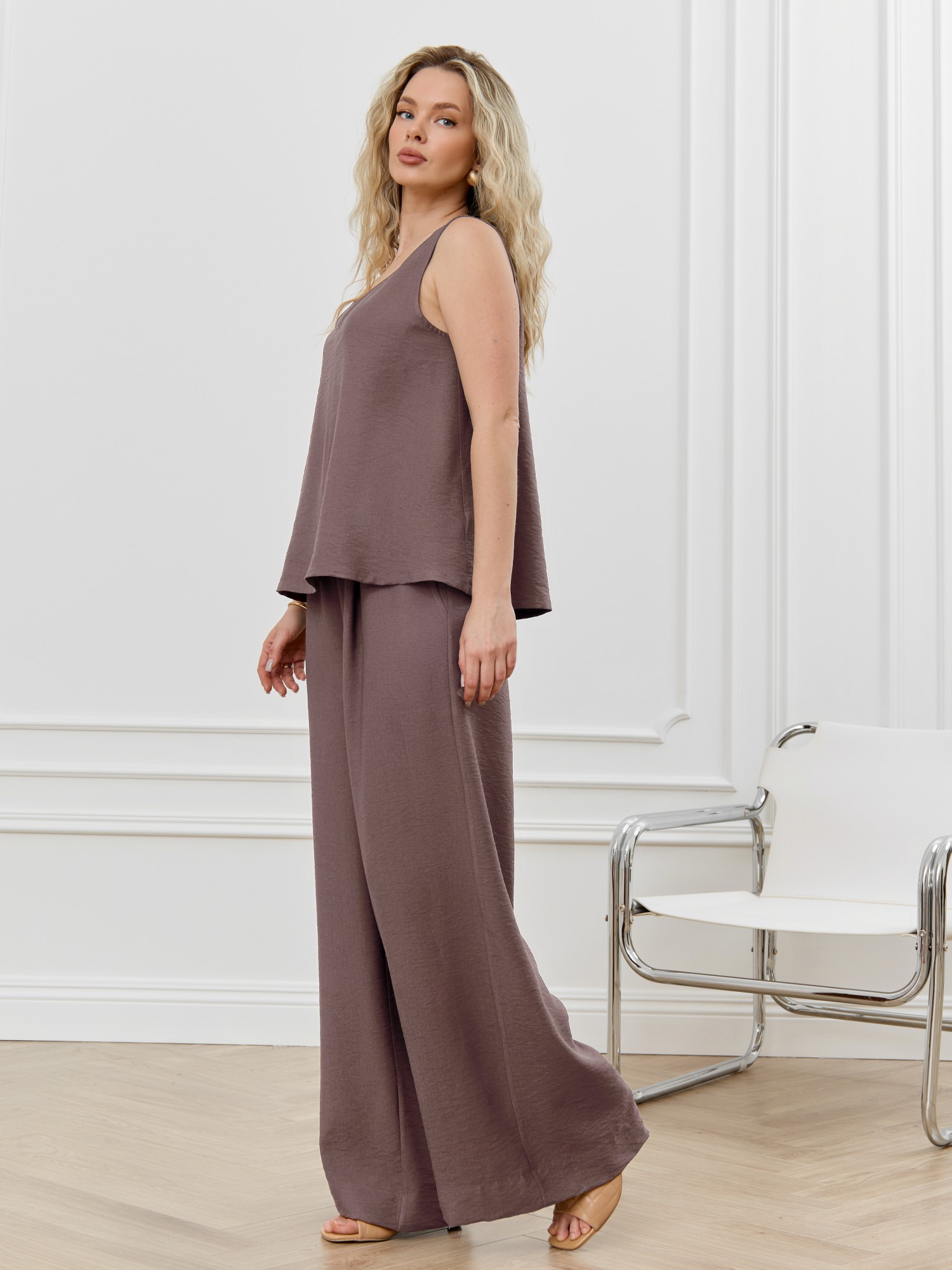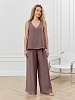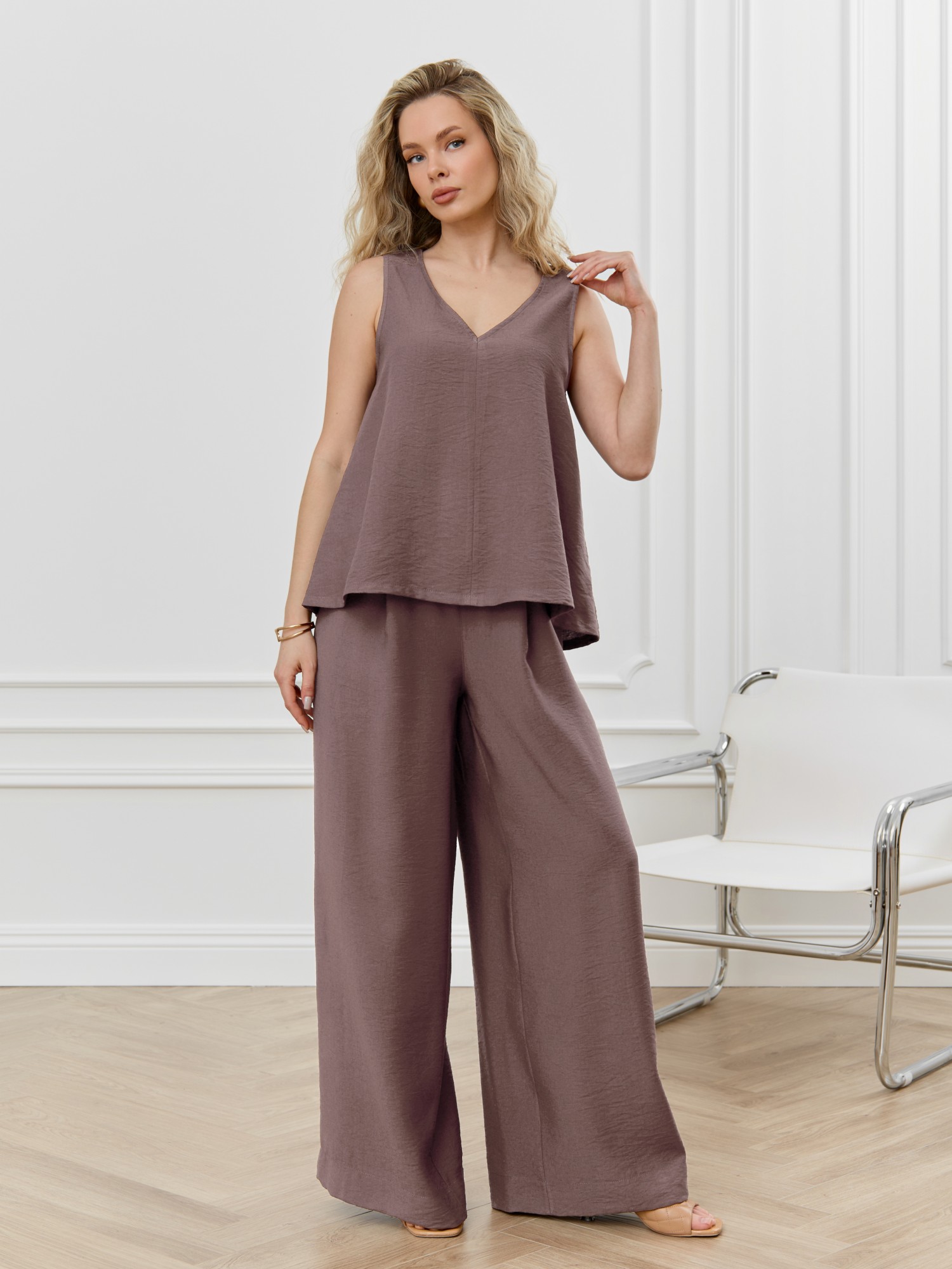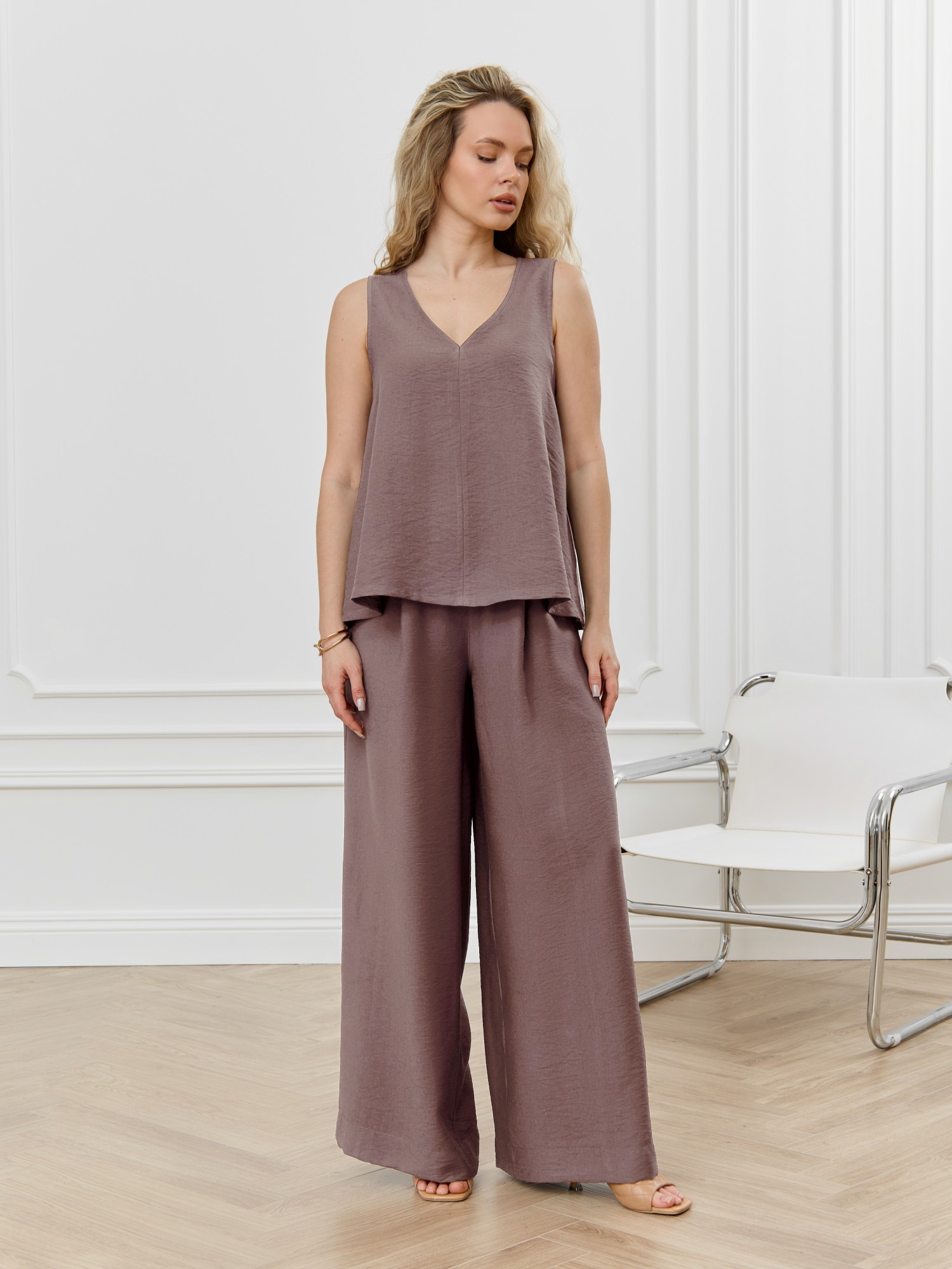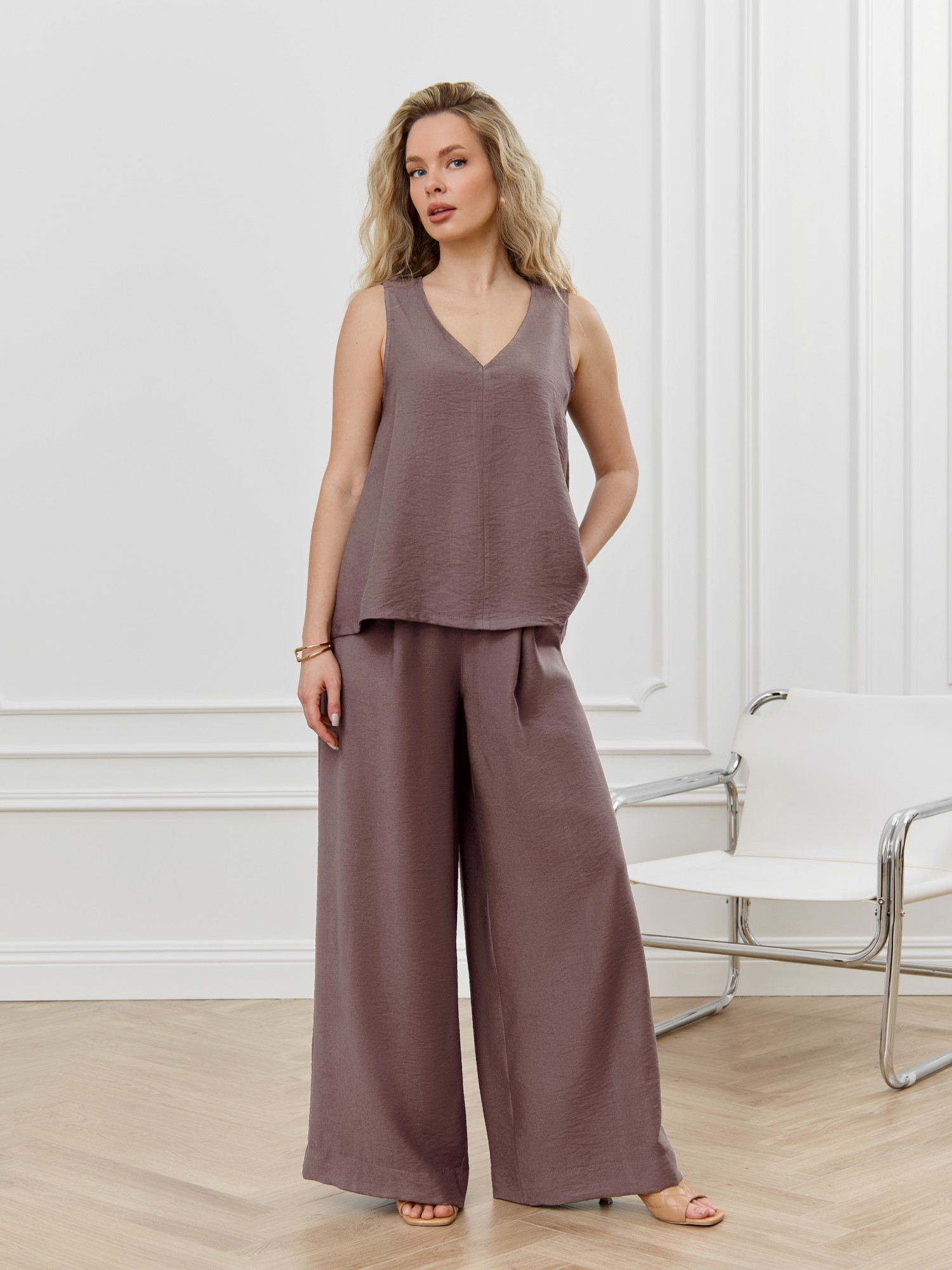 Брюки женские из гладкокрашеного фактурного полотна длинные, широкие по всей длине, на притачном поясе с эластичной тесьмой внутри, с карманами в боковых швах. Модным элементом является широкая подгибка нижних срезов.