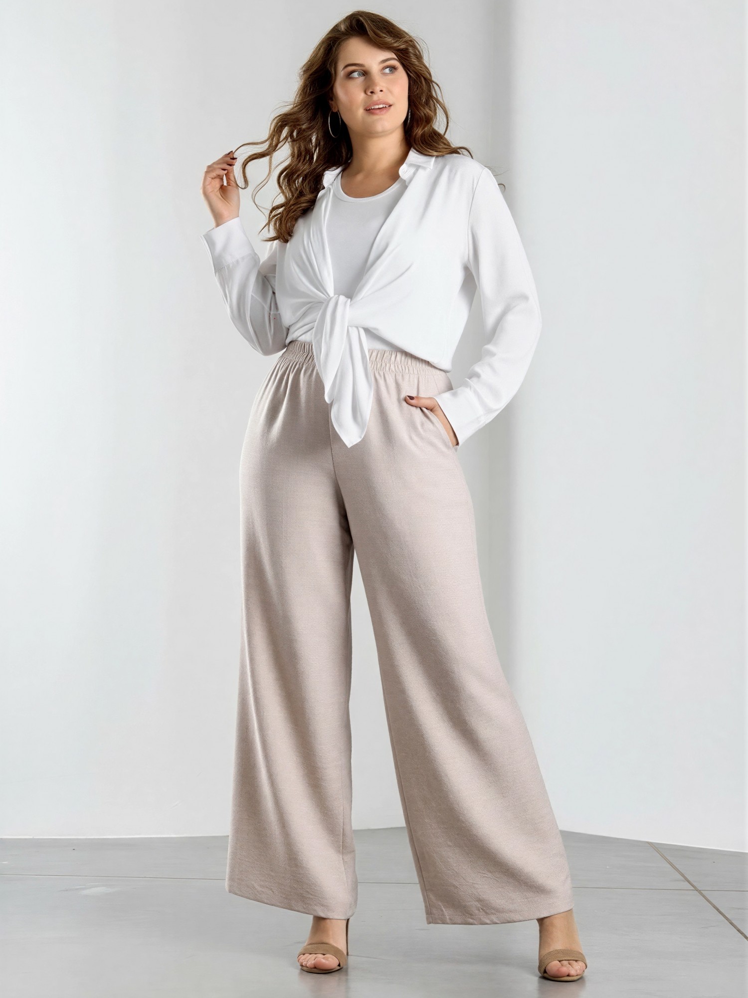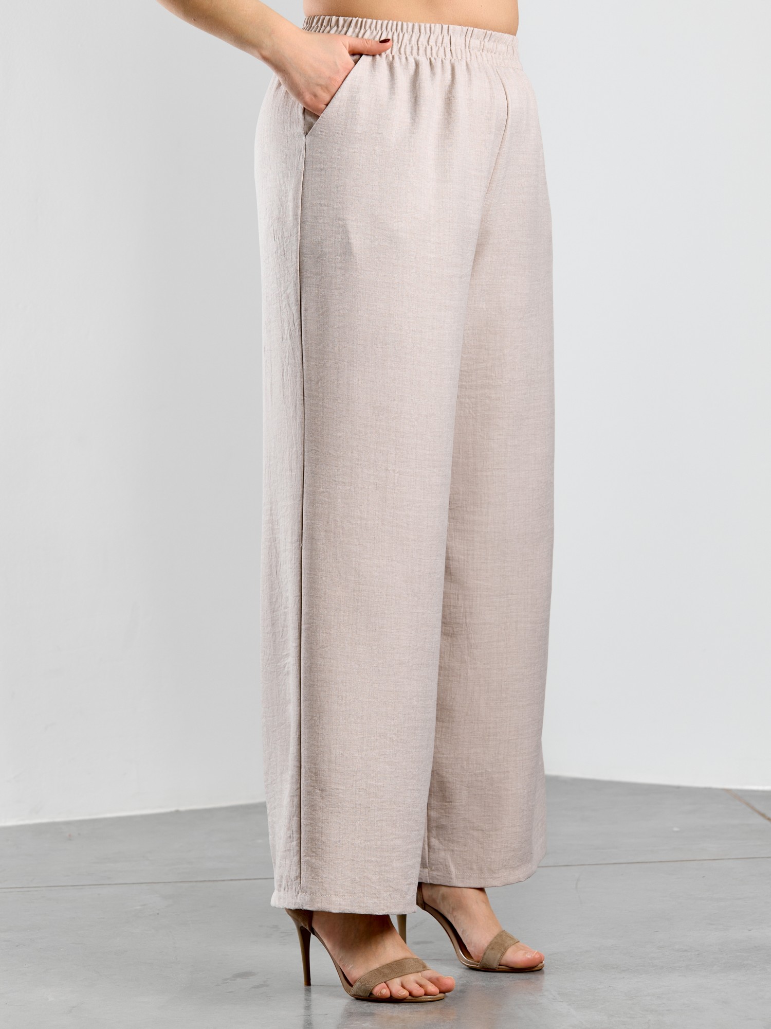 Брюки женские из гладкокрашеного тканого полотна, свободного покроя, с карманами в боковых швах, на притачном поясе с эластичной тесьмой внутри.