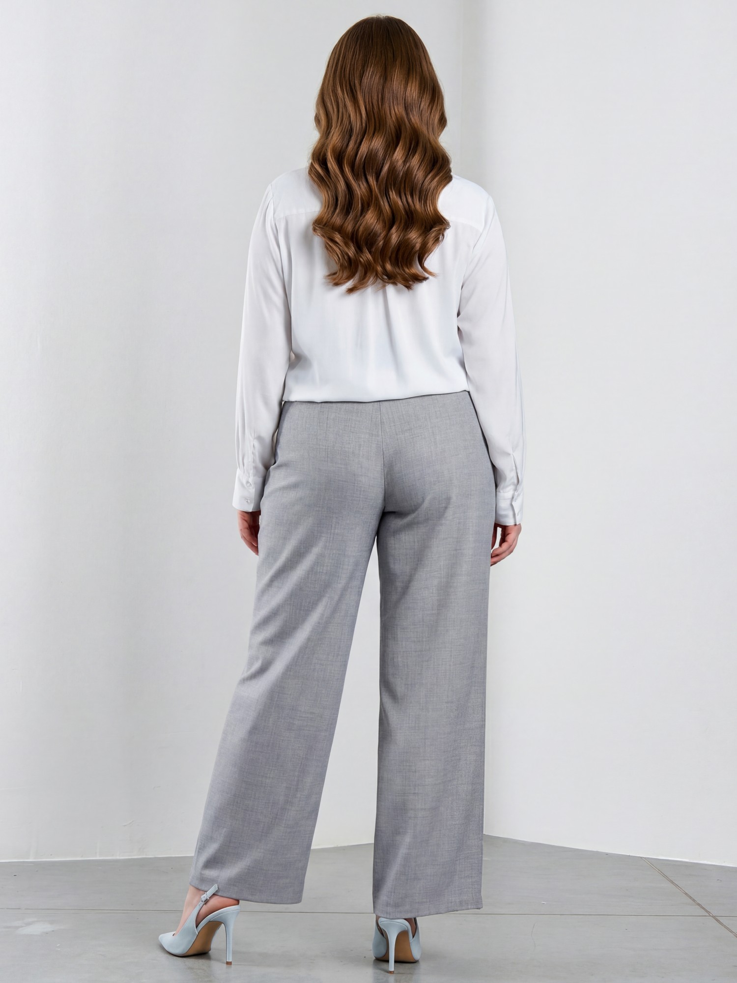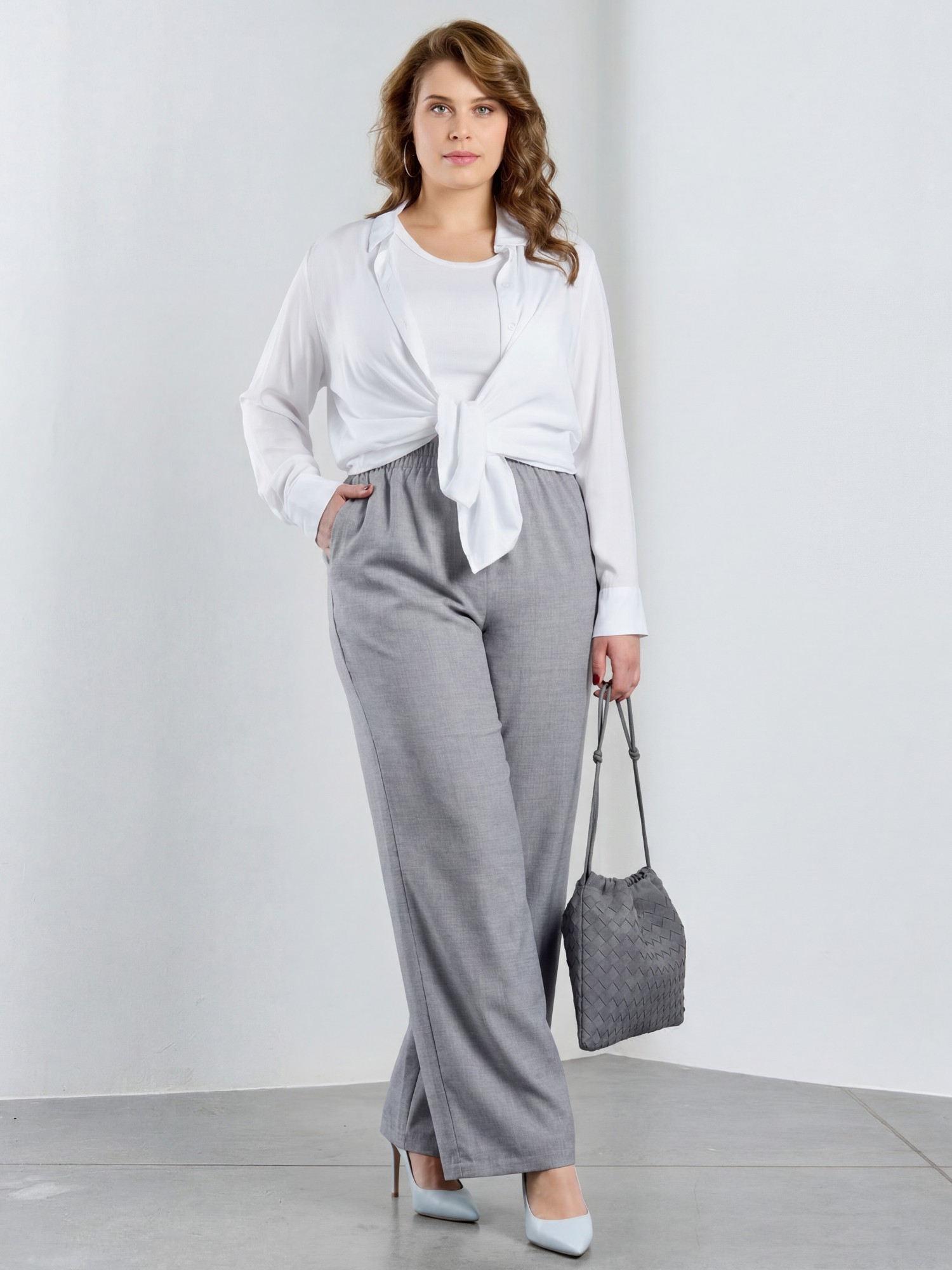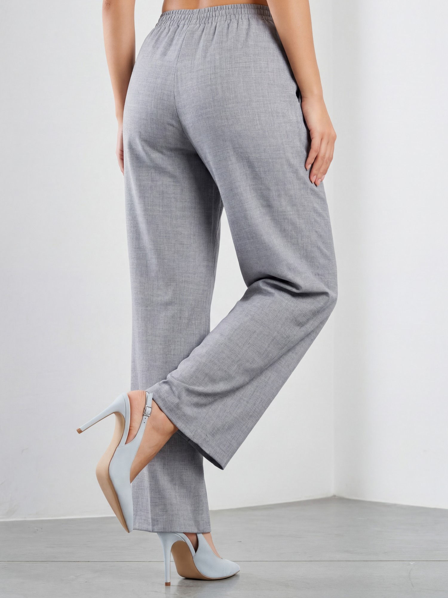 Брюки женские из гладкокрашеного тканого полотна, свободного покроя, с карманами в боковых швах, на притачном поясе с эластичной тесьмой внутри.
