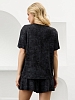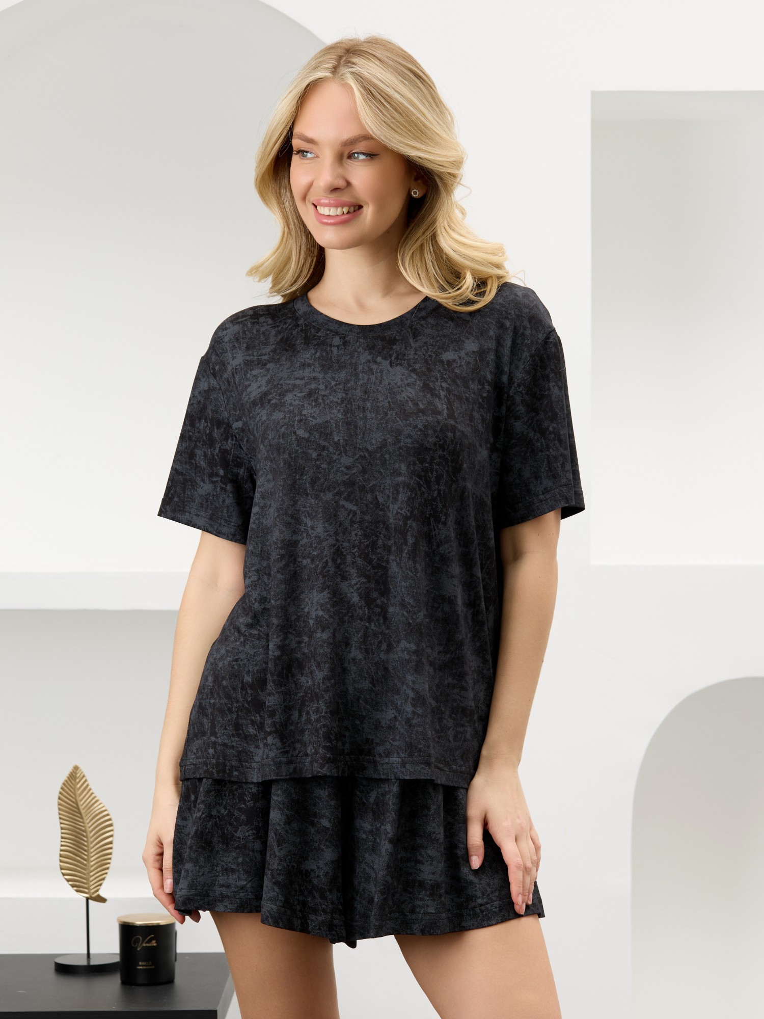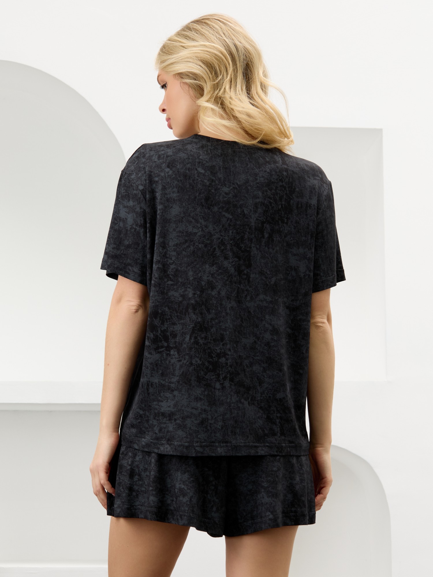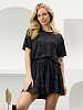 Костюм женский в комбинации двух видов полотен: из гладкокрашенного трикотажного вискозного полотна с эффектом «варенка», состоящий из футболки и шорт. Футболка - классического покроя, с короткими втачными рукавами, горловиной овальной формы, обработанной втачной планкой.Шорты – свободные, средней длины, с эластичной тесьмой по талии.