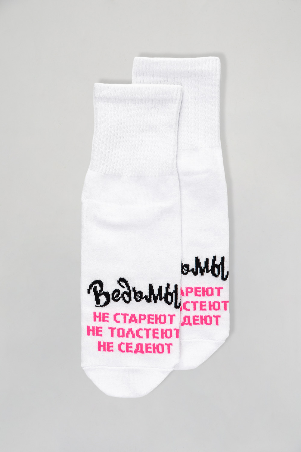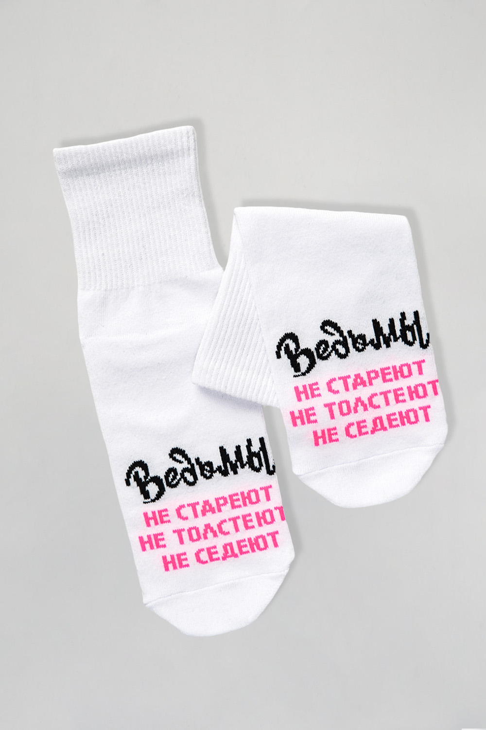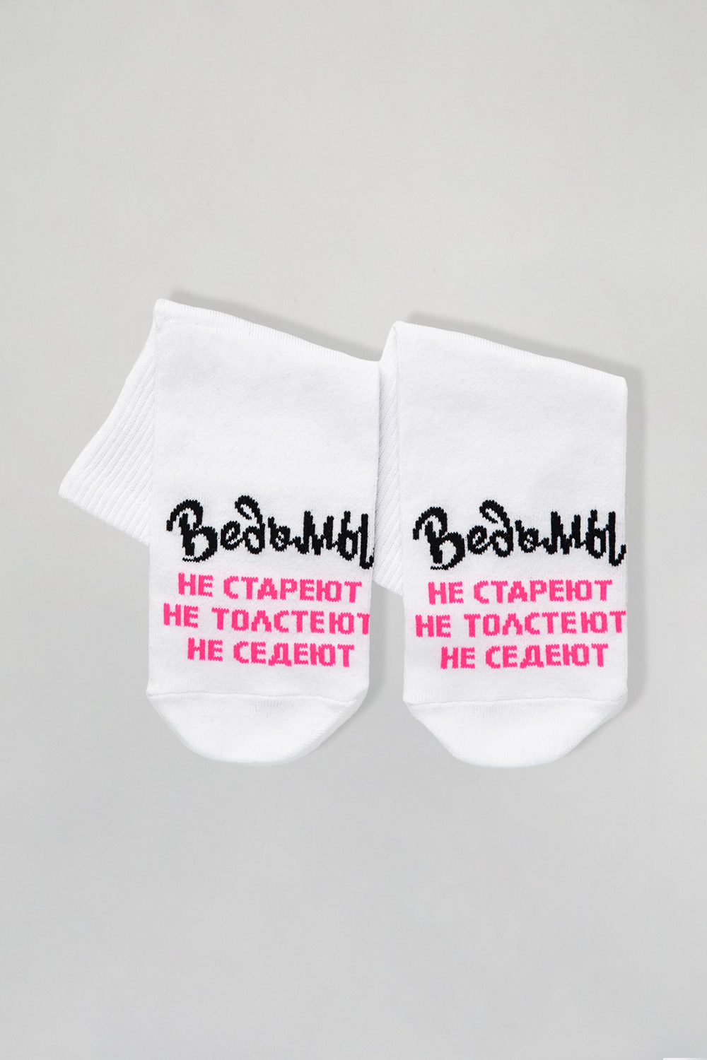 Добавьте в свой образ чуточку магии и юмора с этими стильными носками! Белые носки с яркой надписью Ведьмы не стареют, не толстеют, не седеют созданы для тех, кто любит быть в центре внимания и всегда верит в маленькие чудеса. Мягкий и приятный к телу материал подарит комфорт на весь день, а оригинальный дизайн подчеркнёт вашу индивидуальность. Отличный подарок для себя или подруги, которая уверена: всё волшебство в ней самой!