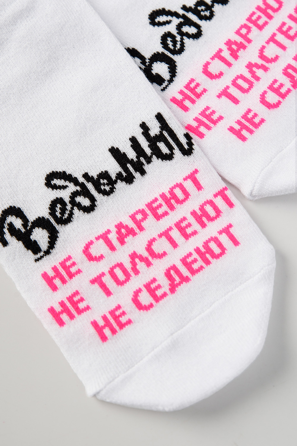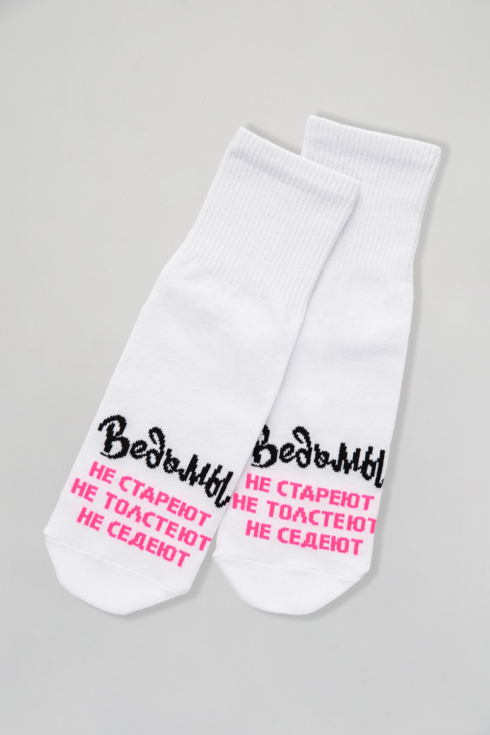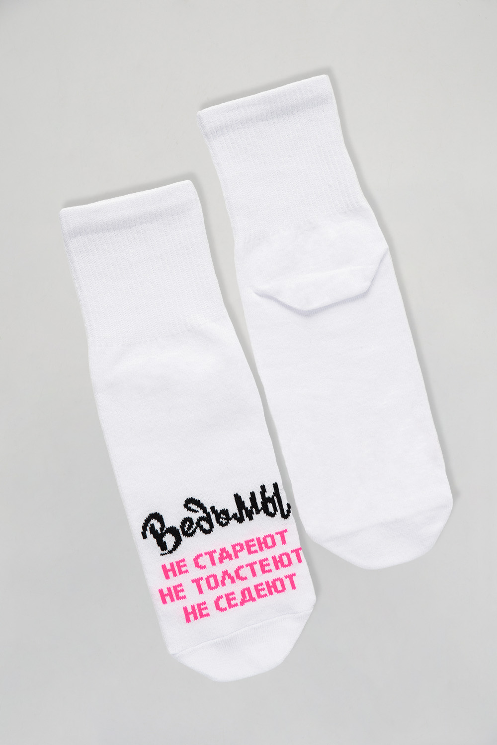 Добавьте в свой образ чуточку магии и юмора с этими стильными носками! Белые носки с яркой надписью Ведьмы не стареют, не толстеют, не седеют созданы для тех, кто любит быть в центре внимания и всегда верит в маленькие чудеса. Мягкий и приятный к телу материал подарит комфорт на весь день, а оригинальный дизайн подчеркнёт вашу индивидуальность. Отличный подарок для себя или подруги, которая уверена: всё волшебство в ней самой!