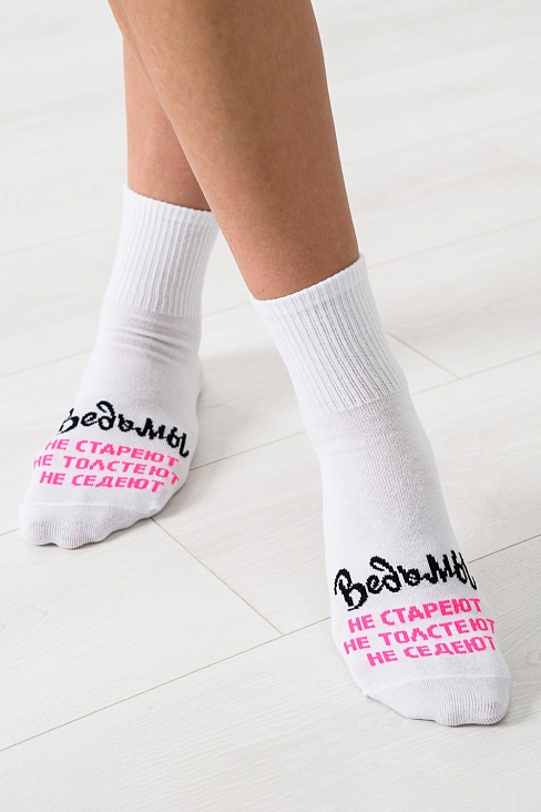 Добавьте в свой образ чуточку магии и юмора с этими стильными носками! Белые носки с яркой надписью Ведьмы не стареют, не толстеют, не седеют созданы для тех, кто любит быть в центре внимания и всегда верит в маленькие чудеса. Мягкий и приятный к телу материал подарит комфорт на весь день, а оригинальный дизайн подчеркнёт вашу индивидуальность. Отличный подарок для себя или подруги, которая уверена: всё волшебство в ней самой!