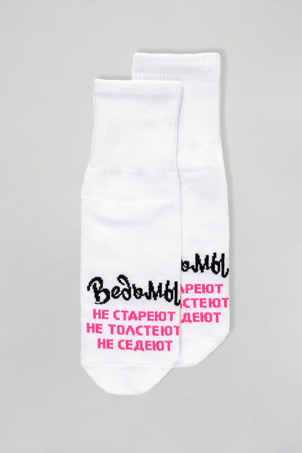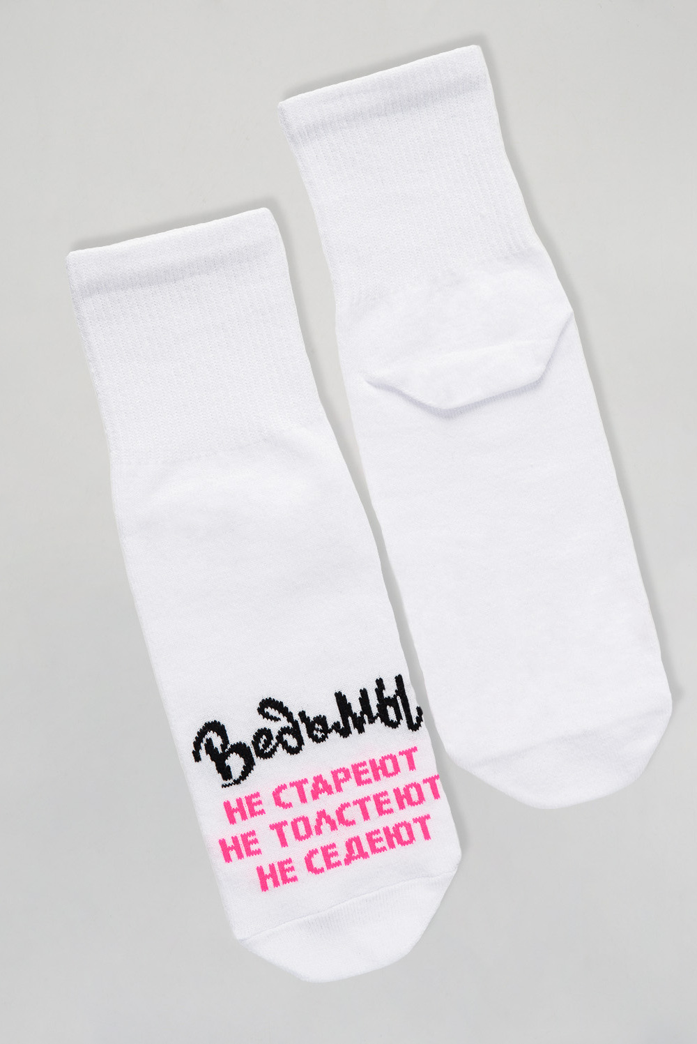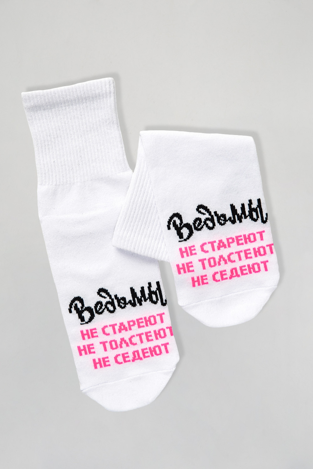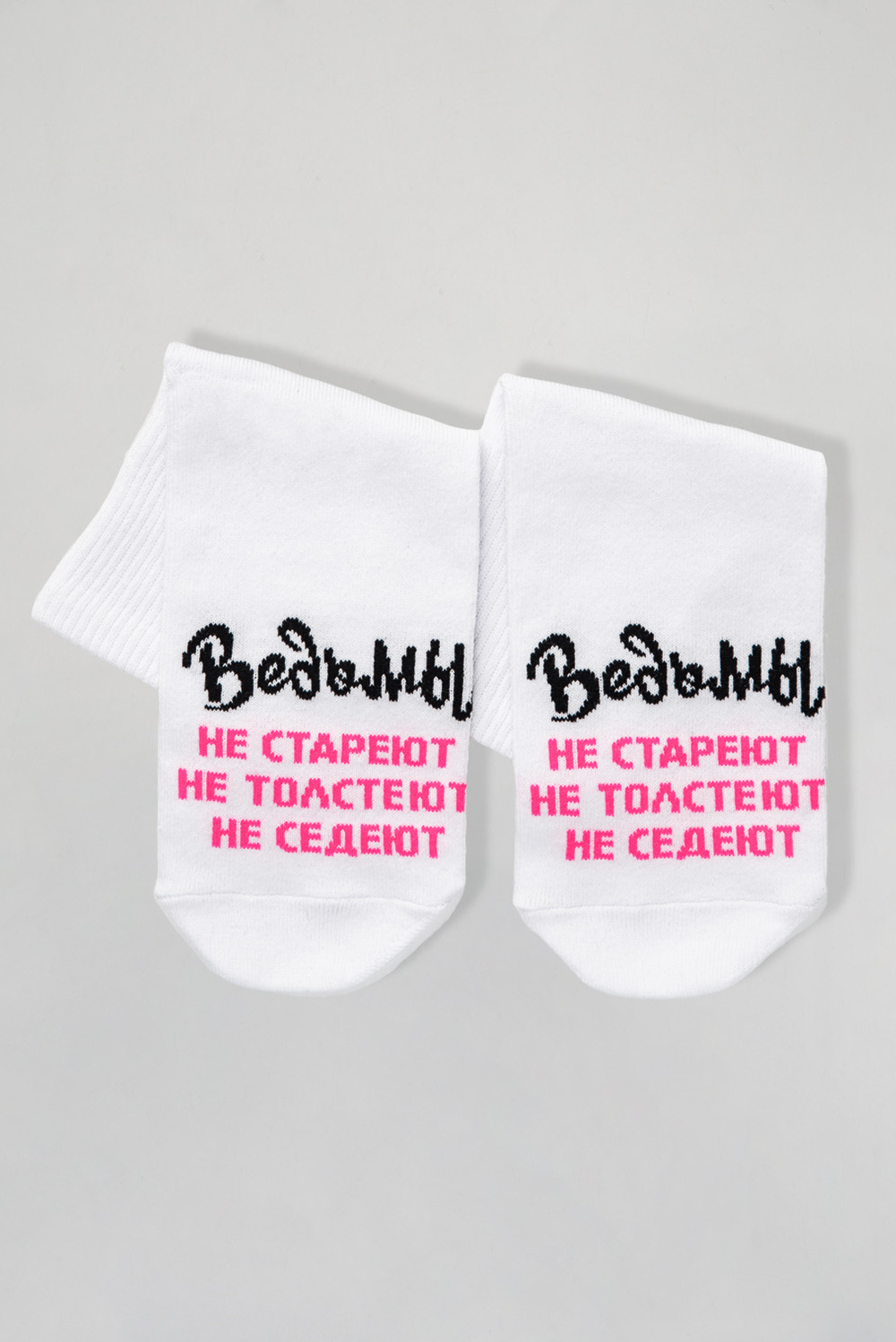 Добавьте в свой образ чуточку магии и юмора с этими стильными носками! Белые носки с яркой надписью Ведьмы не стареют, не толстеют, не седеют созданы для тех, кто любит быть в центре внимания и всегда верит в маленькие чудеса. Мягкий и приятный к телу материал подарит комфорт на весь день, а оригинальный дизайн подчеркнёт вашу индивидуальность. Отличный подарок для себя или подруги, которая уверена: всё волшебство в ней самой!