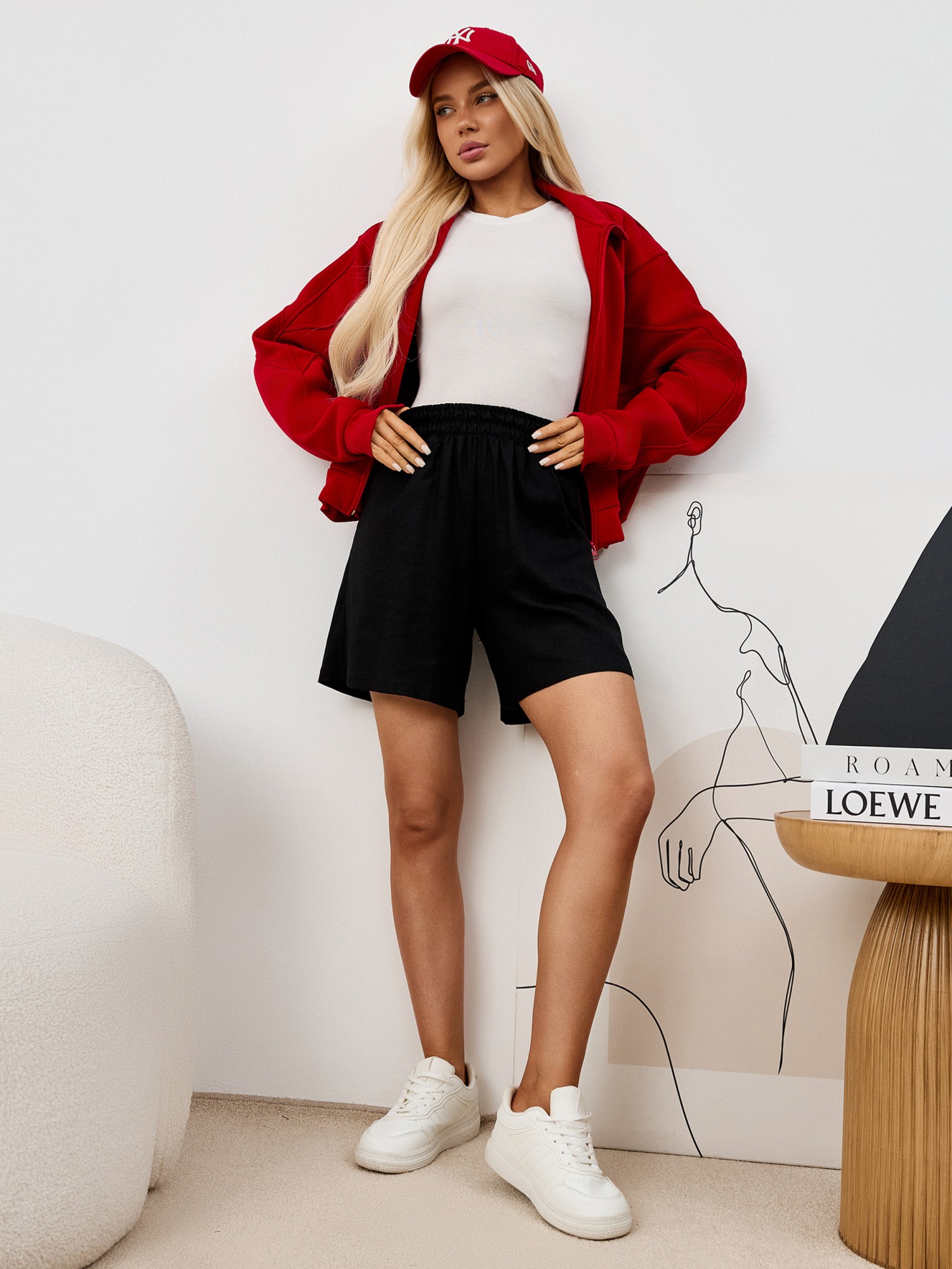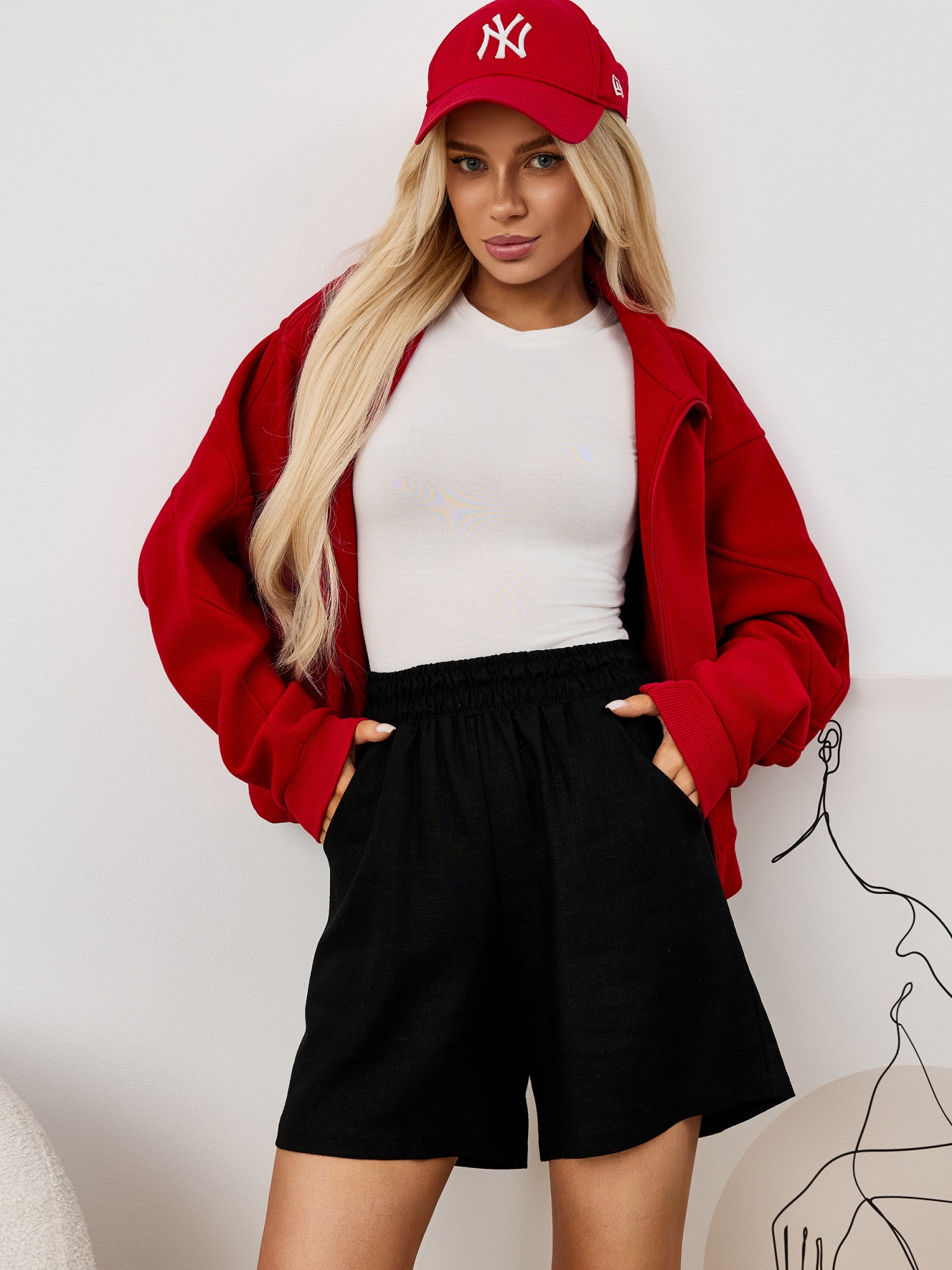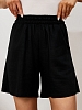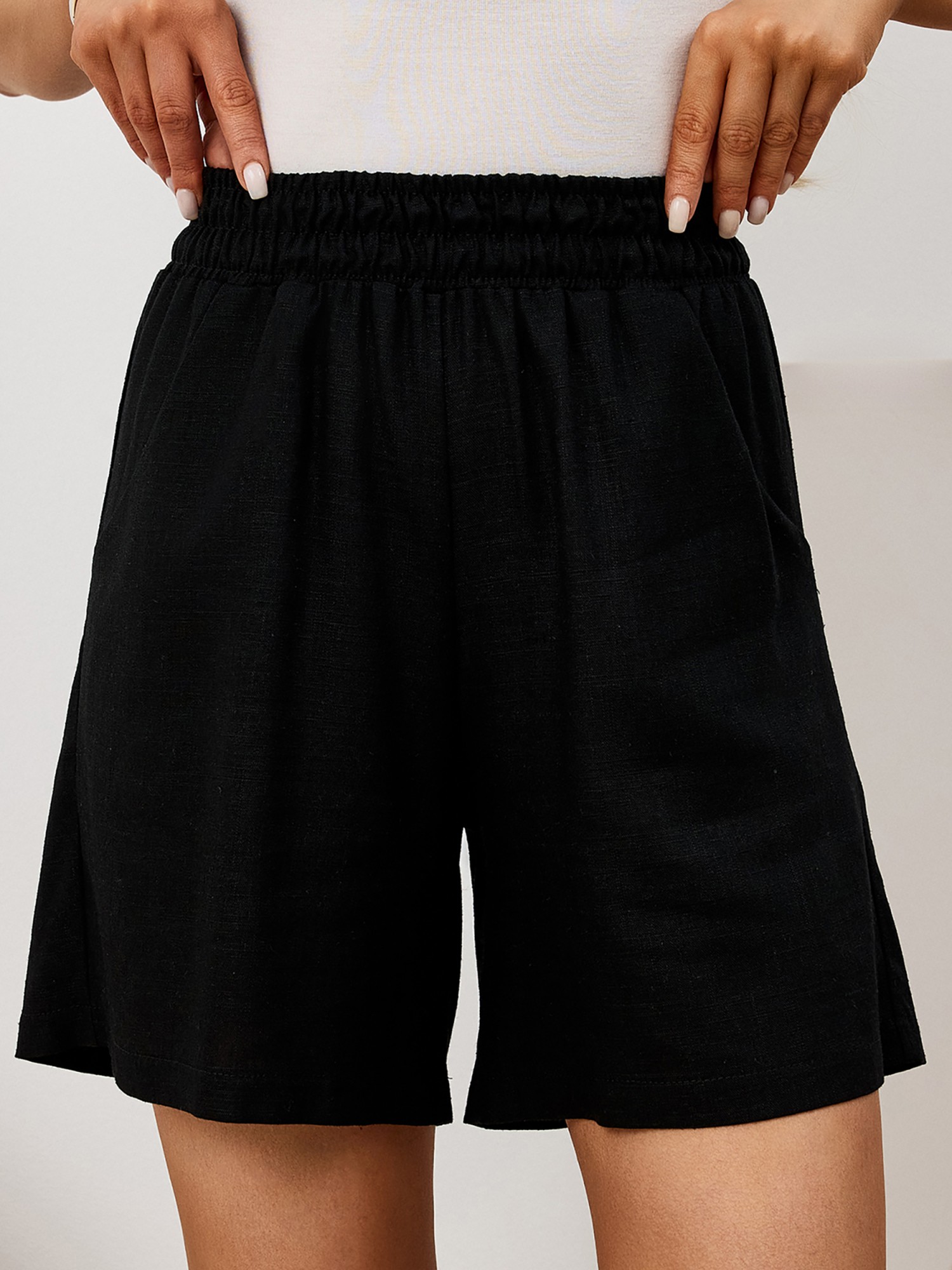 Шорты молодежные из гладкокрашеного тканого полотна «лен-вискоза», свободные, средней длины, на притачном поясе с эластичной тесьмой внутри, карманами в боковых швах.