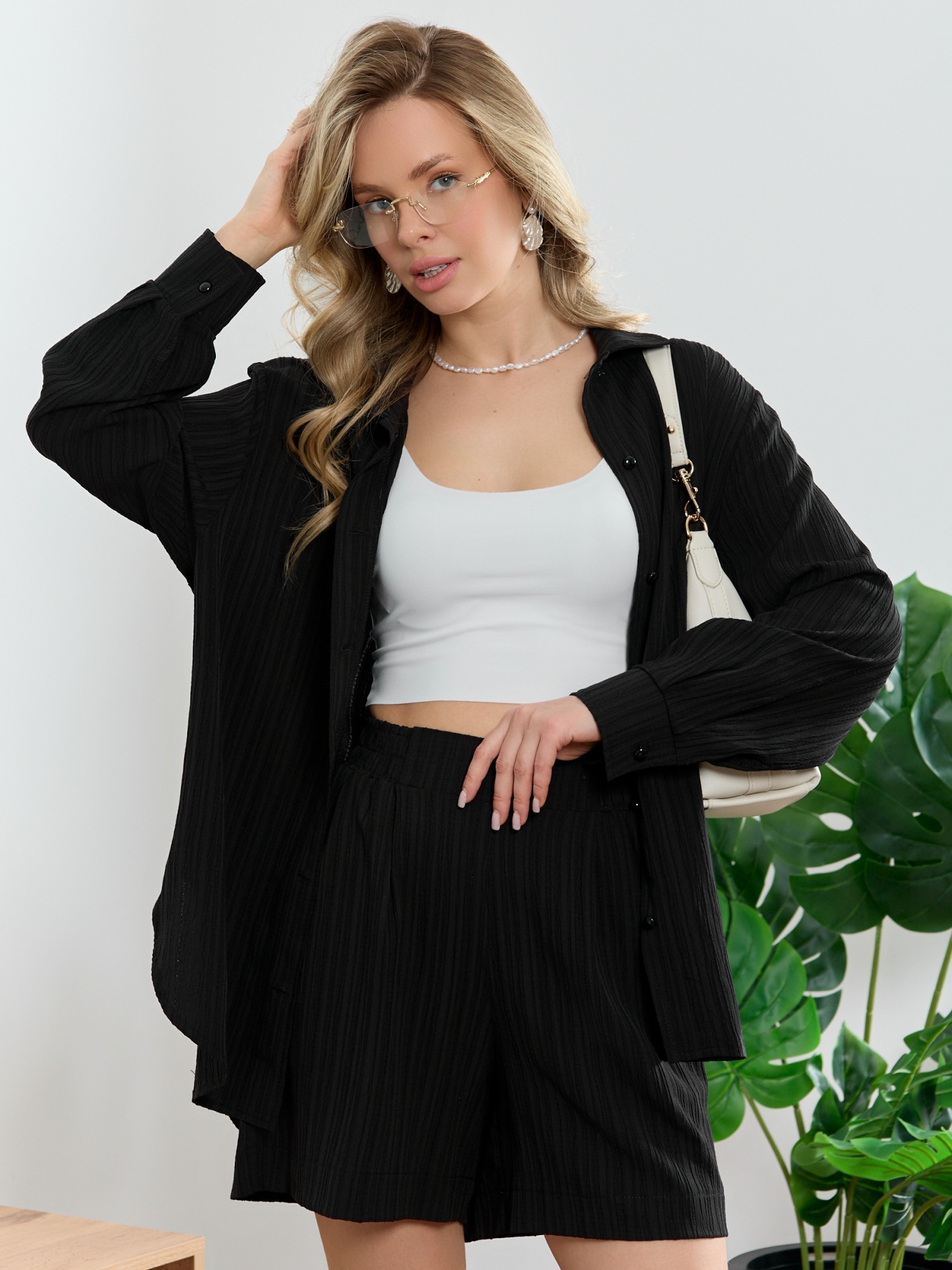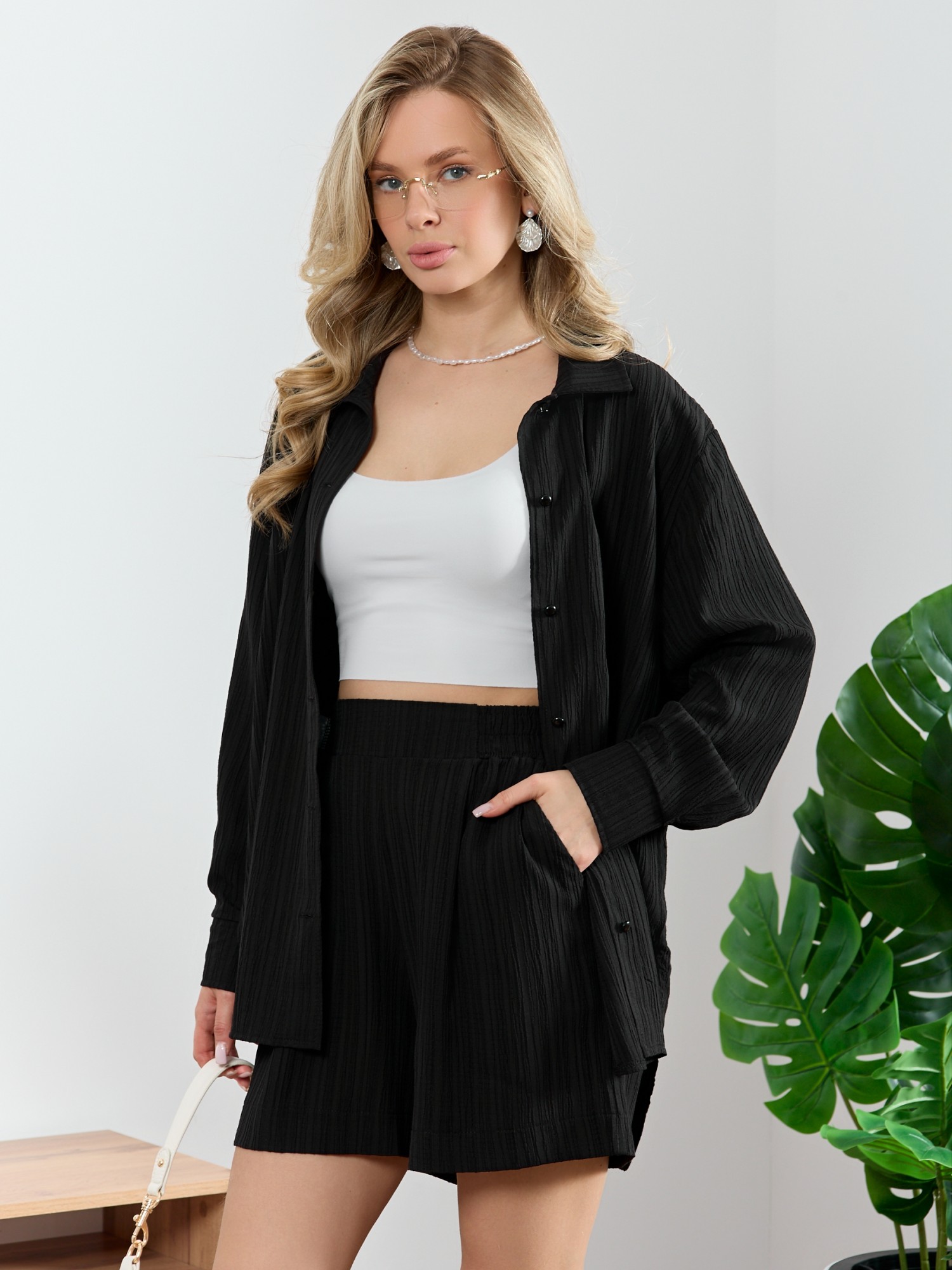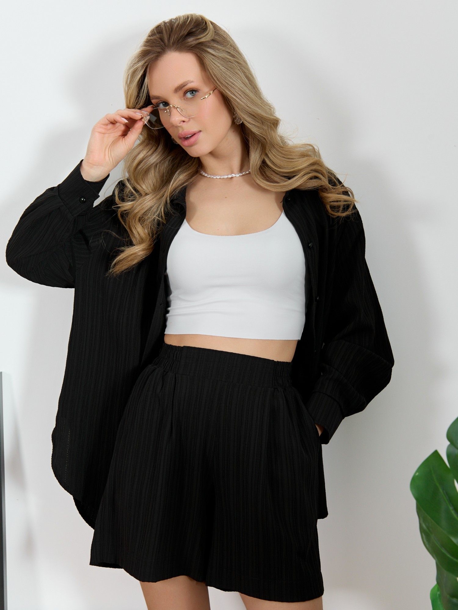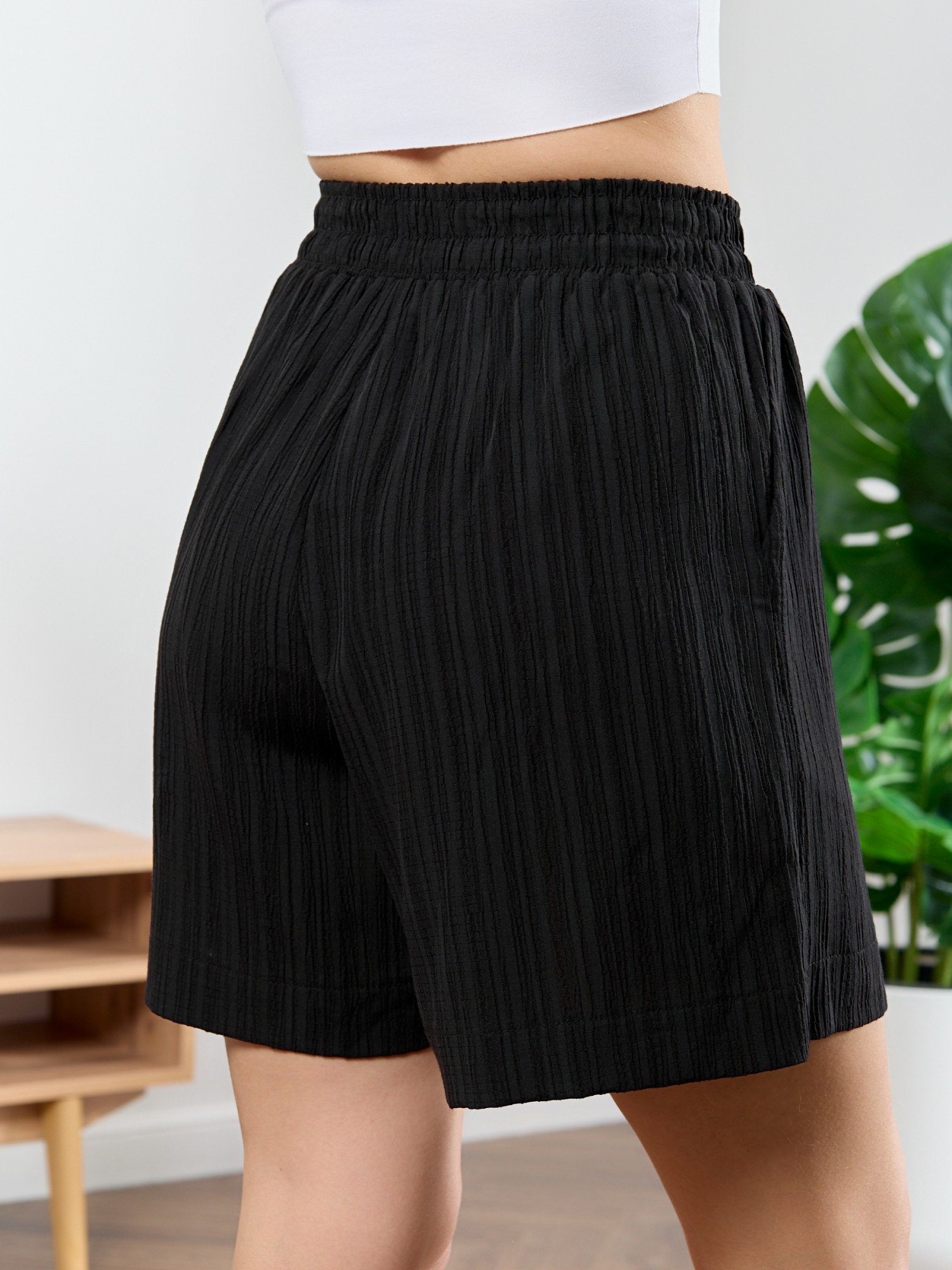 Шорты женские из гладкокрашеного тканого полотна, свободного покроя, укороченные, с карманами в боковых швах, на притачном поясе с эластичной тесьмой внутри. При выборе изделия в белом цвете идеальным решением будет выбор белья нейтральных оттенков.