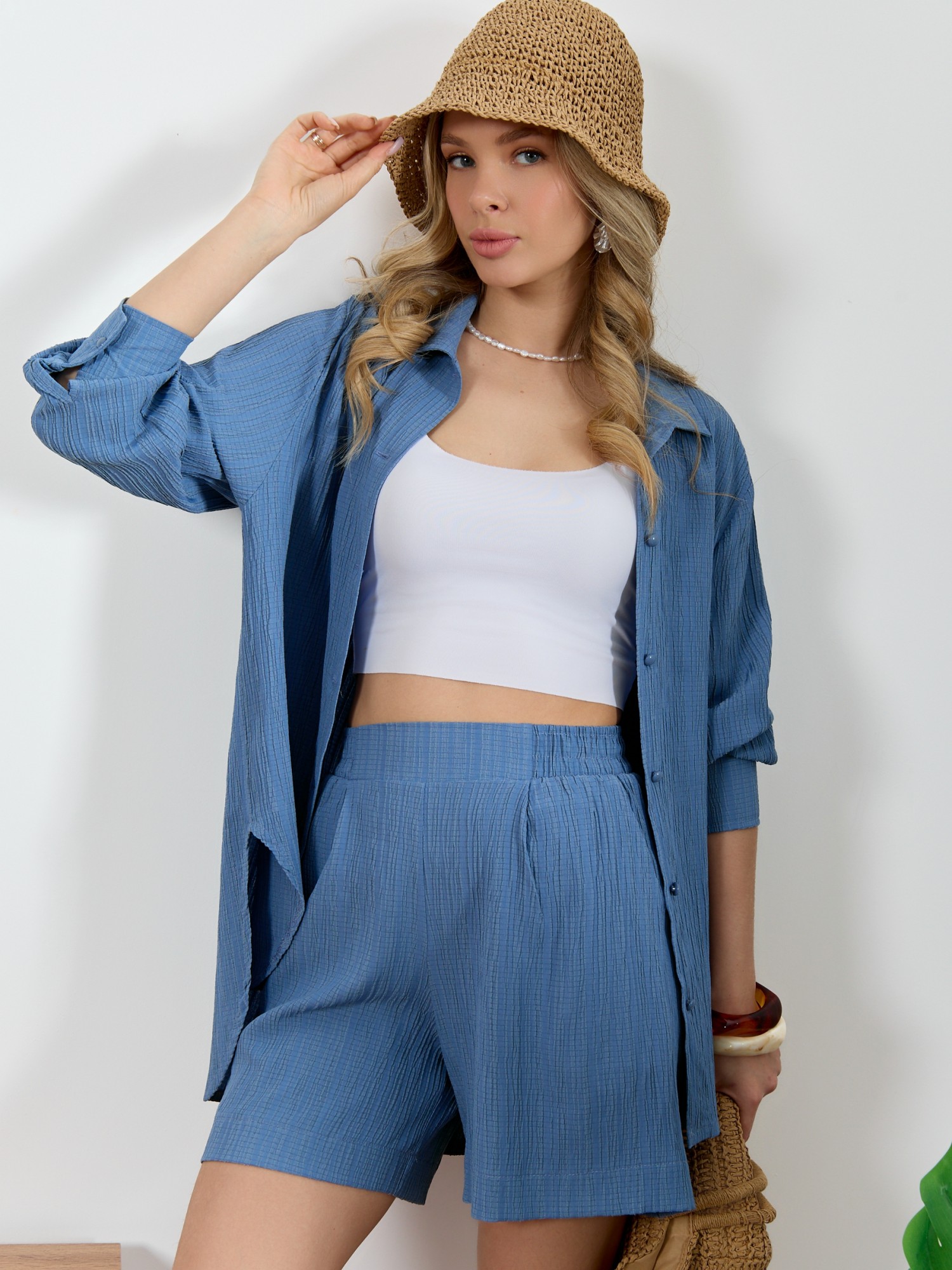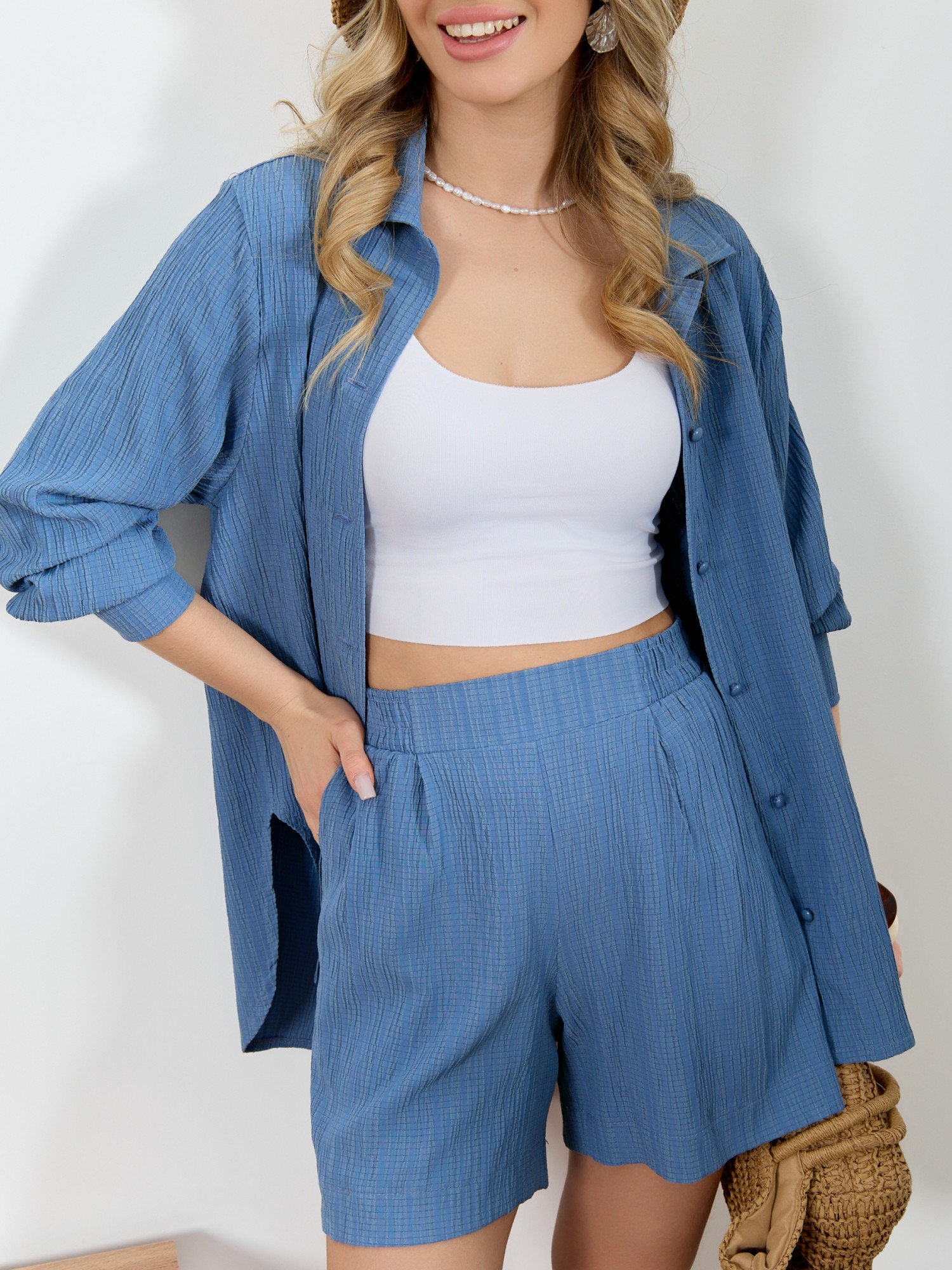 Шорты женские из гладкокрашеного тканого полотна, свободного покроя, укороченные, с карманами в боковых швах, на притачном поясе с эластичной тесьмой внутри. При выборе изделия в белом цвете идеальным решением будет выбор белья нейтральных оттенков.