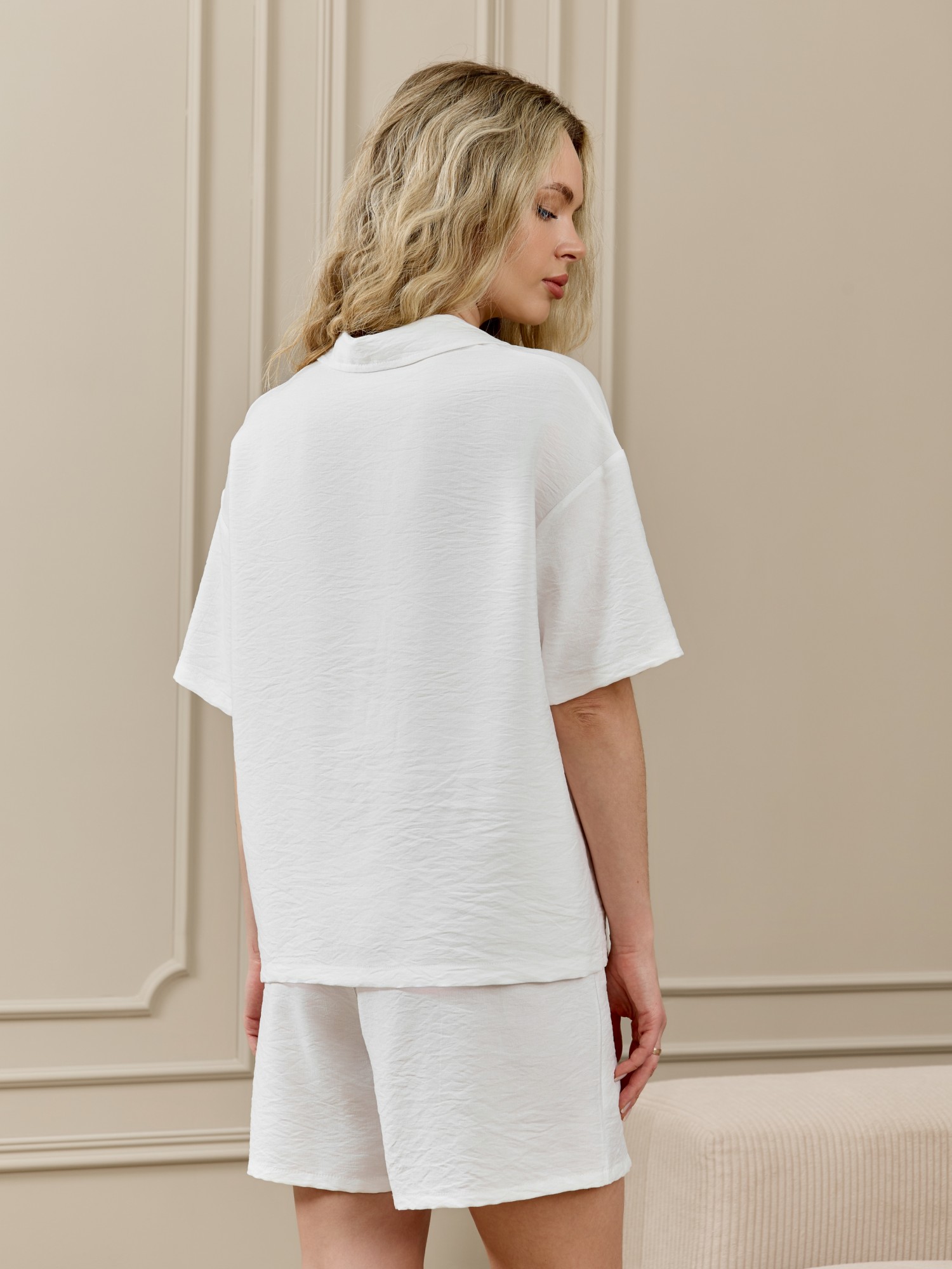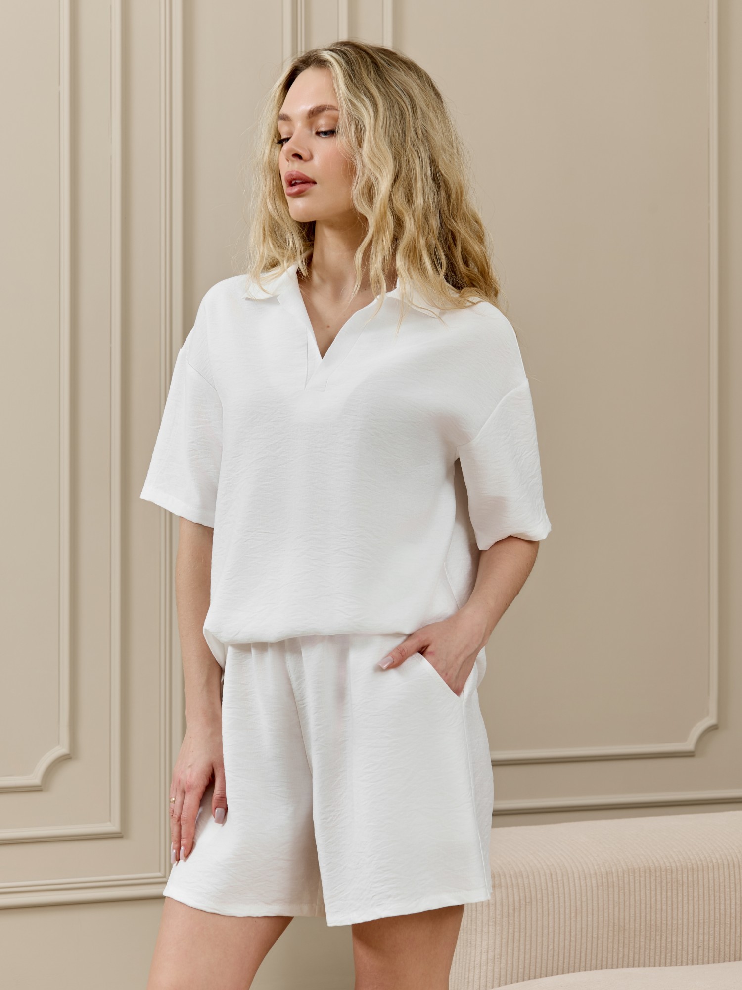 Шорты женские из фактурного полотна средней длины, на притачном поясе с эластичной тесьмой внутри, с карманами в боковых швах. По входам в карманы настрочены отделочные строчки. Нижние срезы обработаны подгибкой.