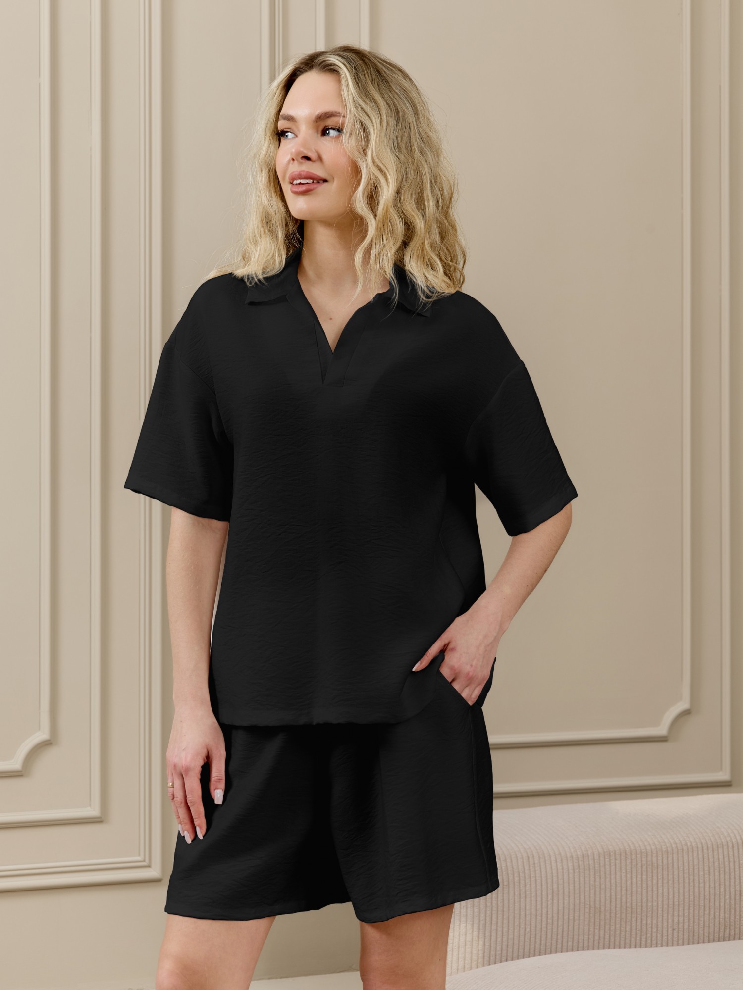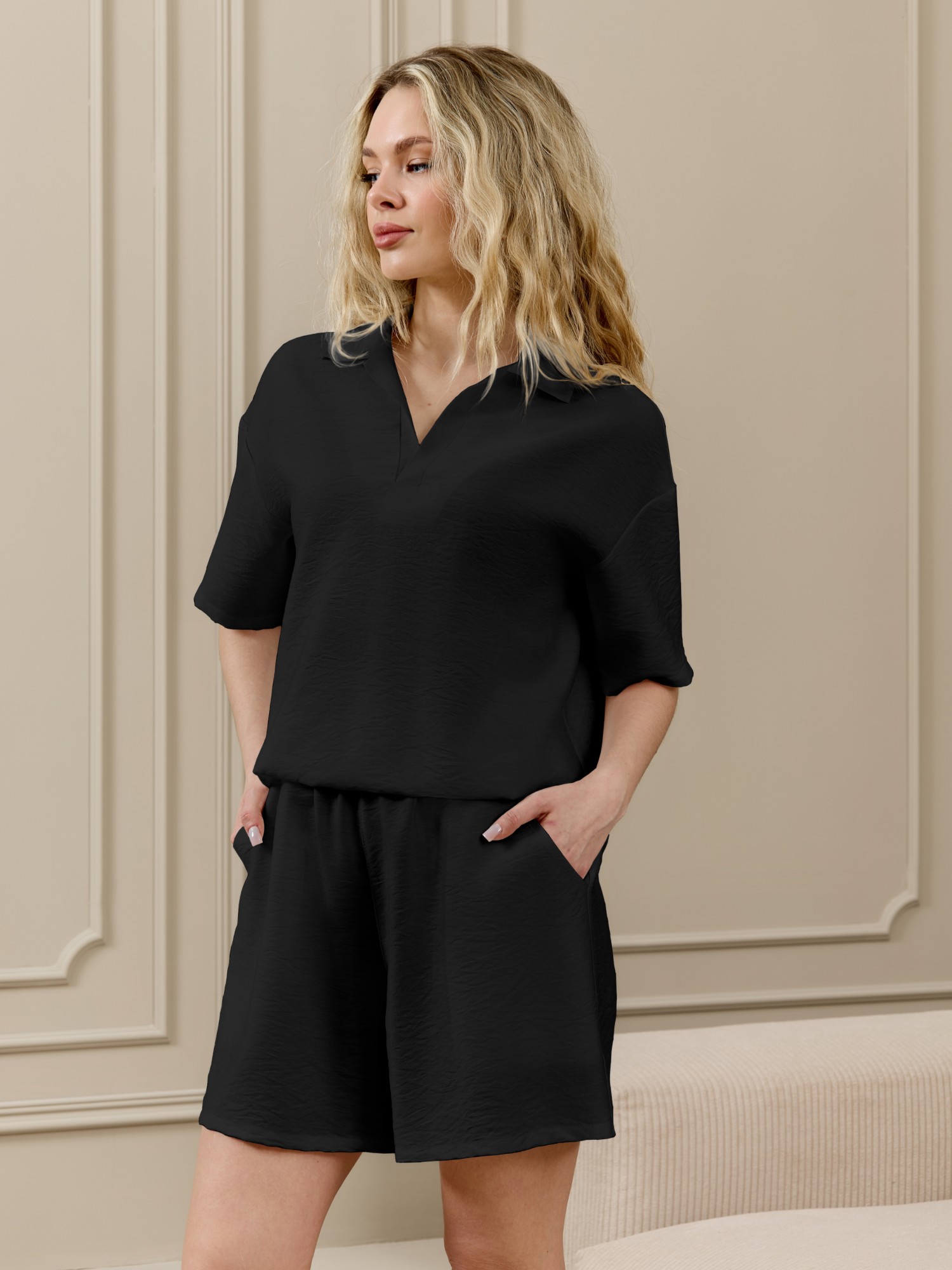 Шорты женские из фактурного полотна средней длины, на притачном поясе с эластичной тесьмой внутри, с карманами в боковых швах. По входам в карманы настрочены отделочные строчки. Нижние срезы обработаны подгибкой.
