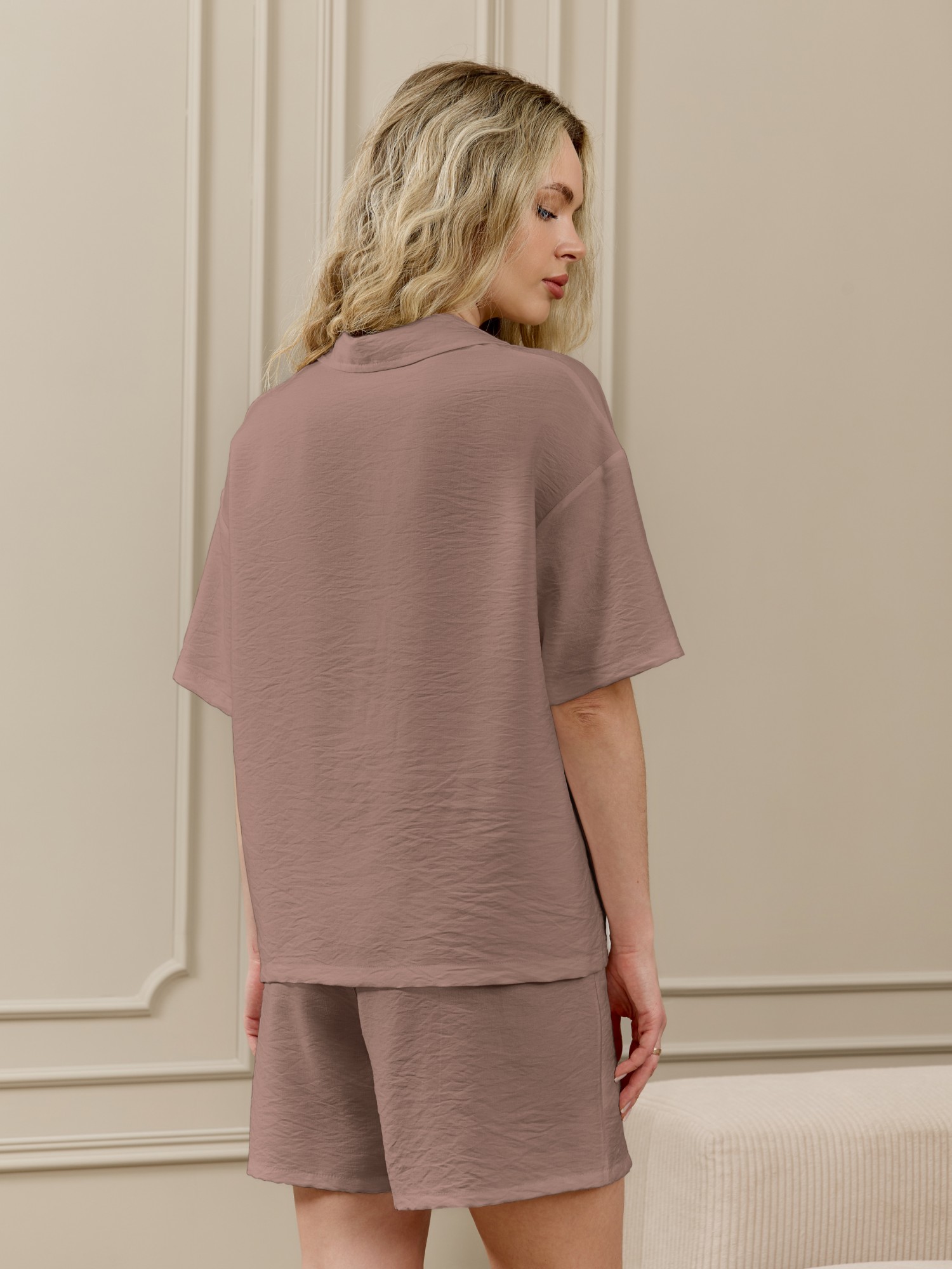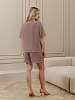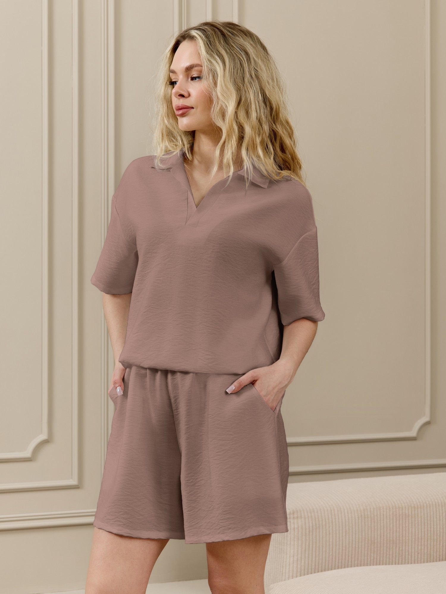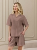 Шорты женские из фактурного полотна средней длины, на притачном поясе с эластичной тесьмой внутри, с карманами в боковых швах. По входам в карманы настрочены отделочные строчки. Нижние срезы обработаны подгибкой.