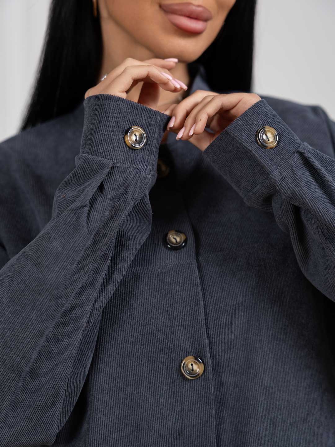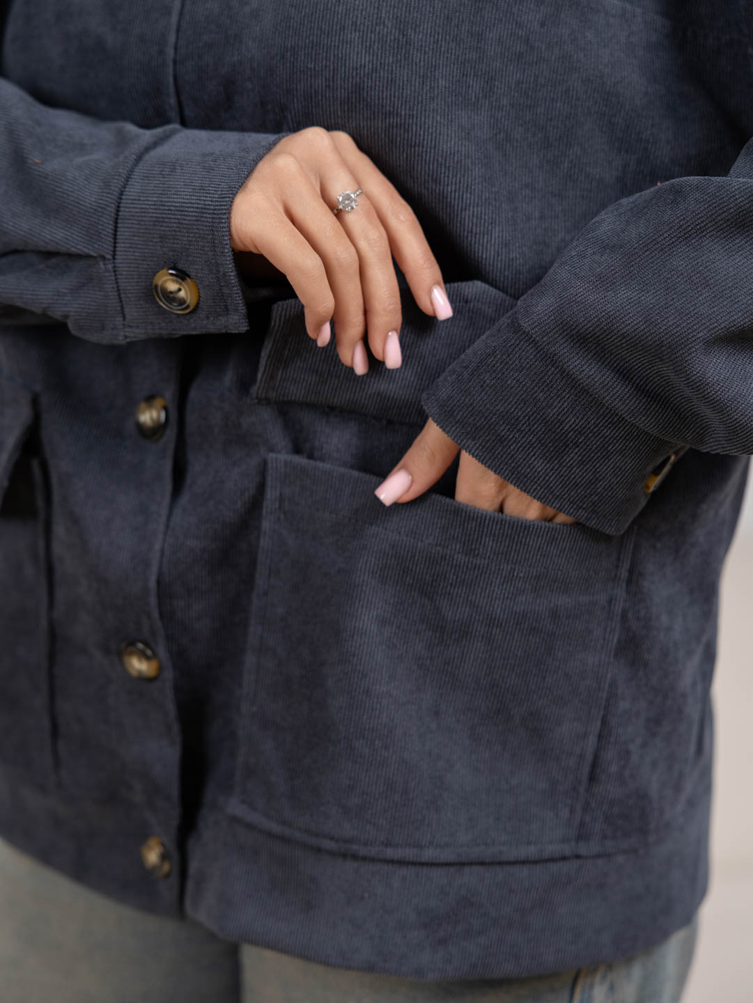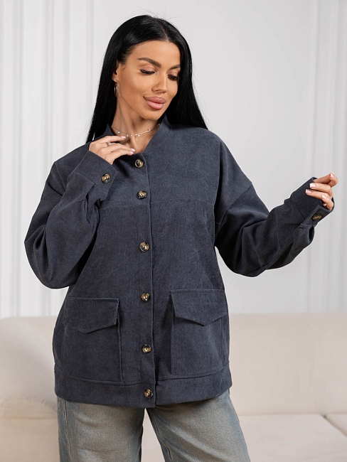 Бомбер из микровельвета, на пуговицах с большими накладными карманами, длинным рукавом и манжетой. Рост модели 165см.