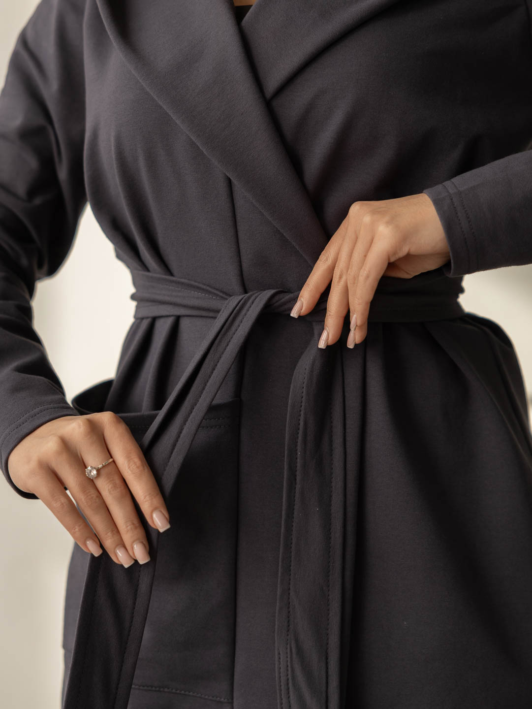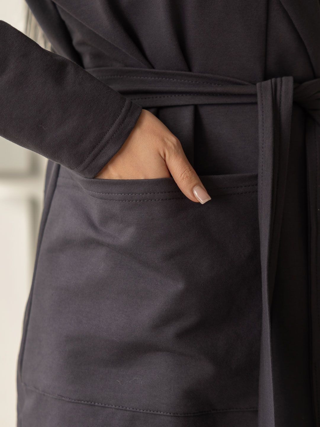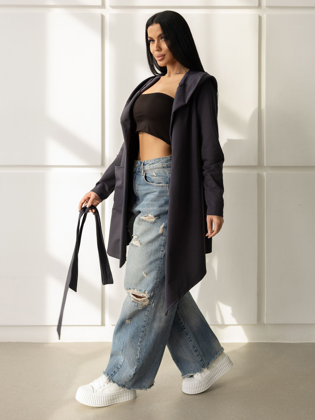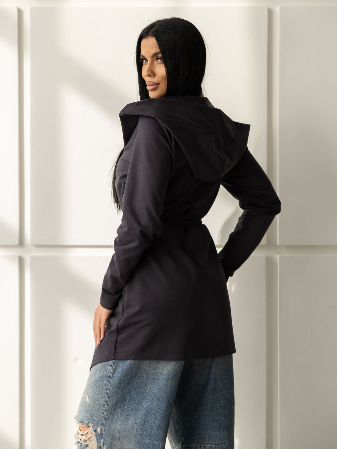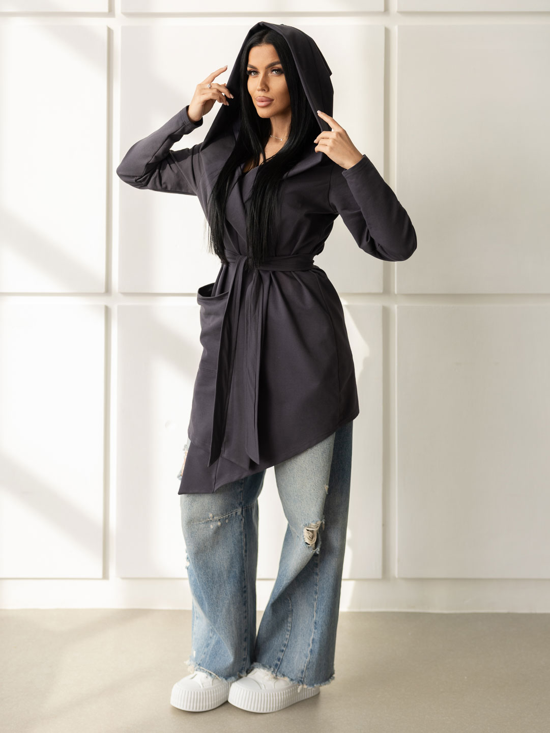 Женский ассиметричный кардиган с глубоким капюшоном и ассиметричной линией низа. Свободный крой не сковывает движения и подходит для любого типа фигуры. Приятный к телу материал обеспечит Вам комфорт в любое время года.