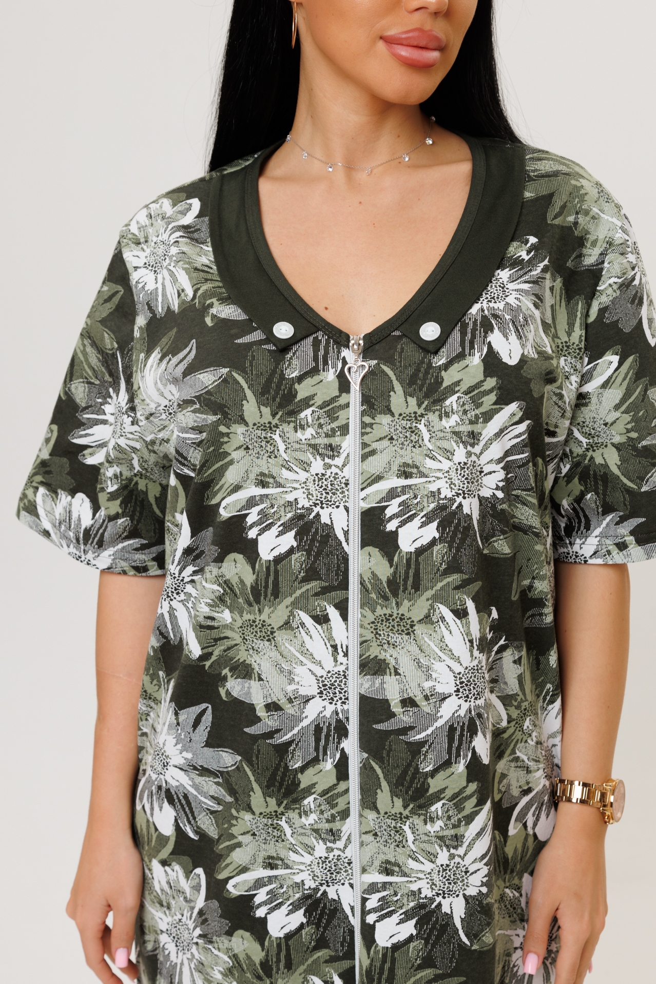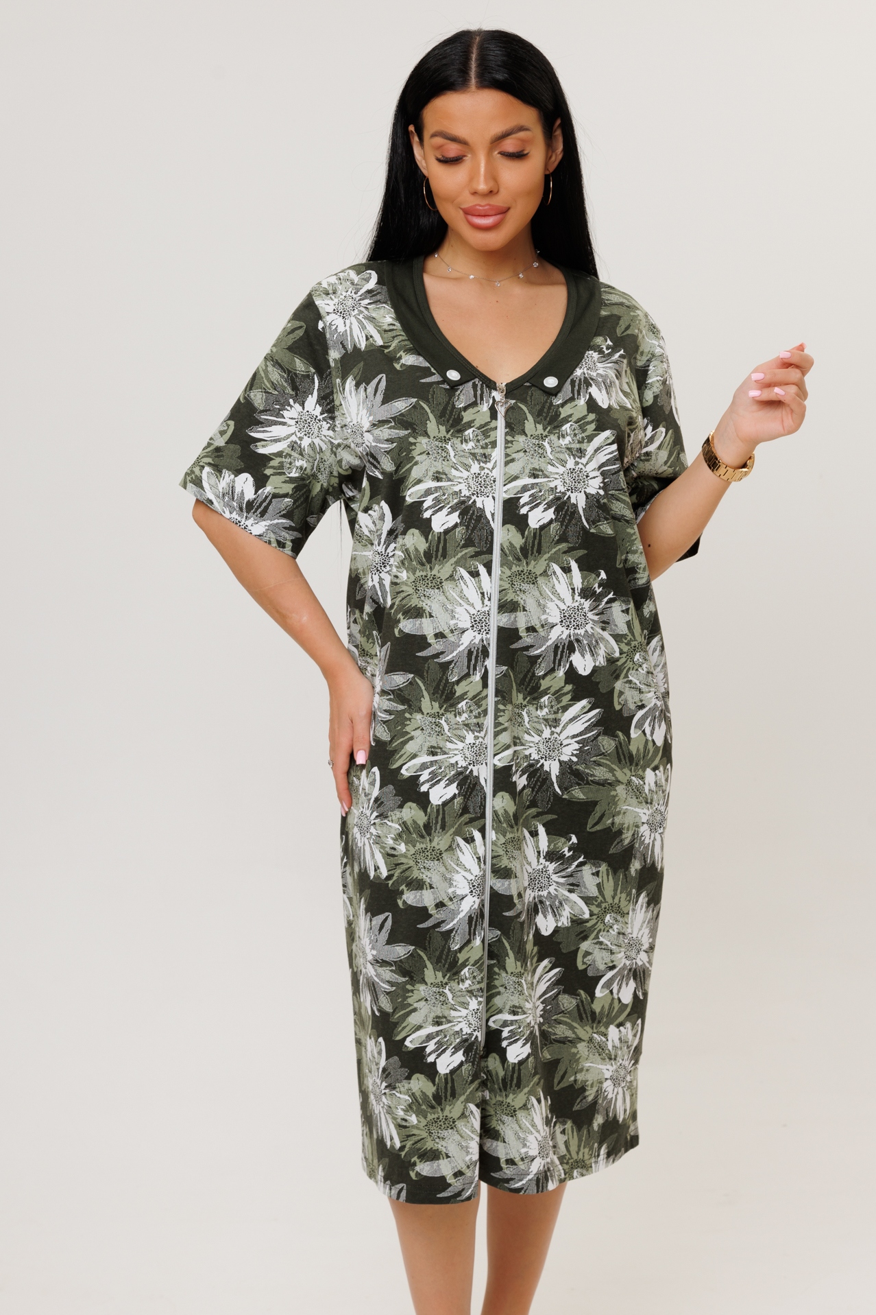 Женский халат на молнии сшит из качественного хлопкового трикотажа (кулирки). Ткань прекрасно выдерживает многократные стирки, не закатывается, а цвет остаётся ярким и насыщенным. Она подходит для людей с чувствительной кожей.