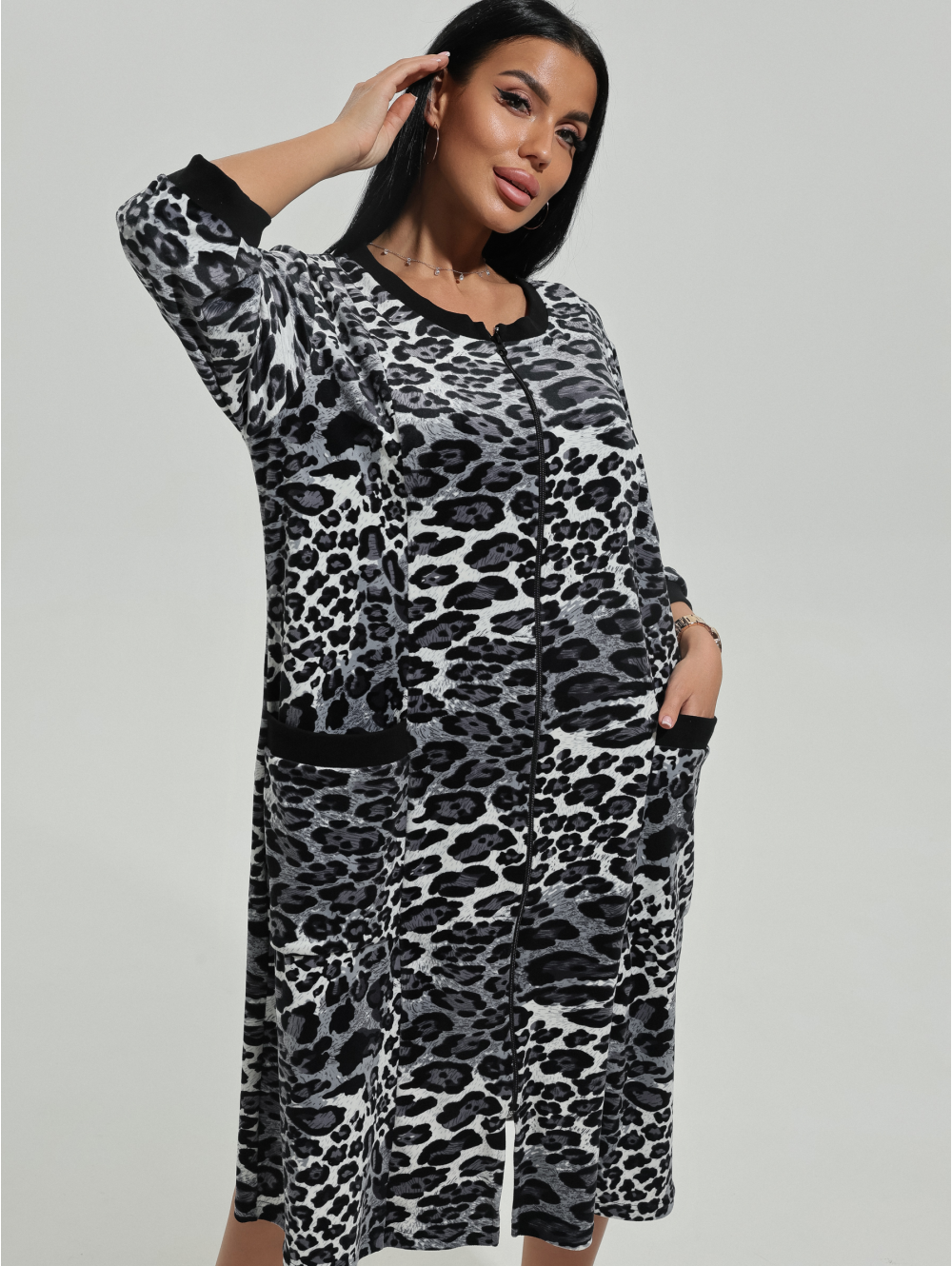 Женственность и элегантность должна сопутствовать не только деловой или уличной одежде, но и домашней в первую очередь. Женские велюровые халаты – это красота и комфорт в одном флаконе. Они очень практичные. Изделия из этой ткани долго сохраняют свой первоначальный вид. Велюр устойчив к износу и не теряет яркость цвета. Велюровый халат БАГИРА представлен без воротника, с центральной застежкой молнией, с рельефами от плеча и боковыми карманами. Длина рукавов создает удобство при носке.