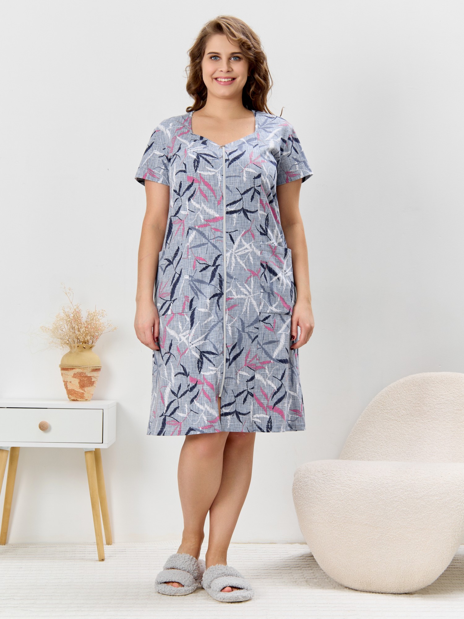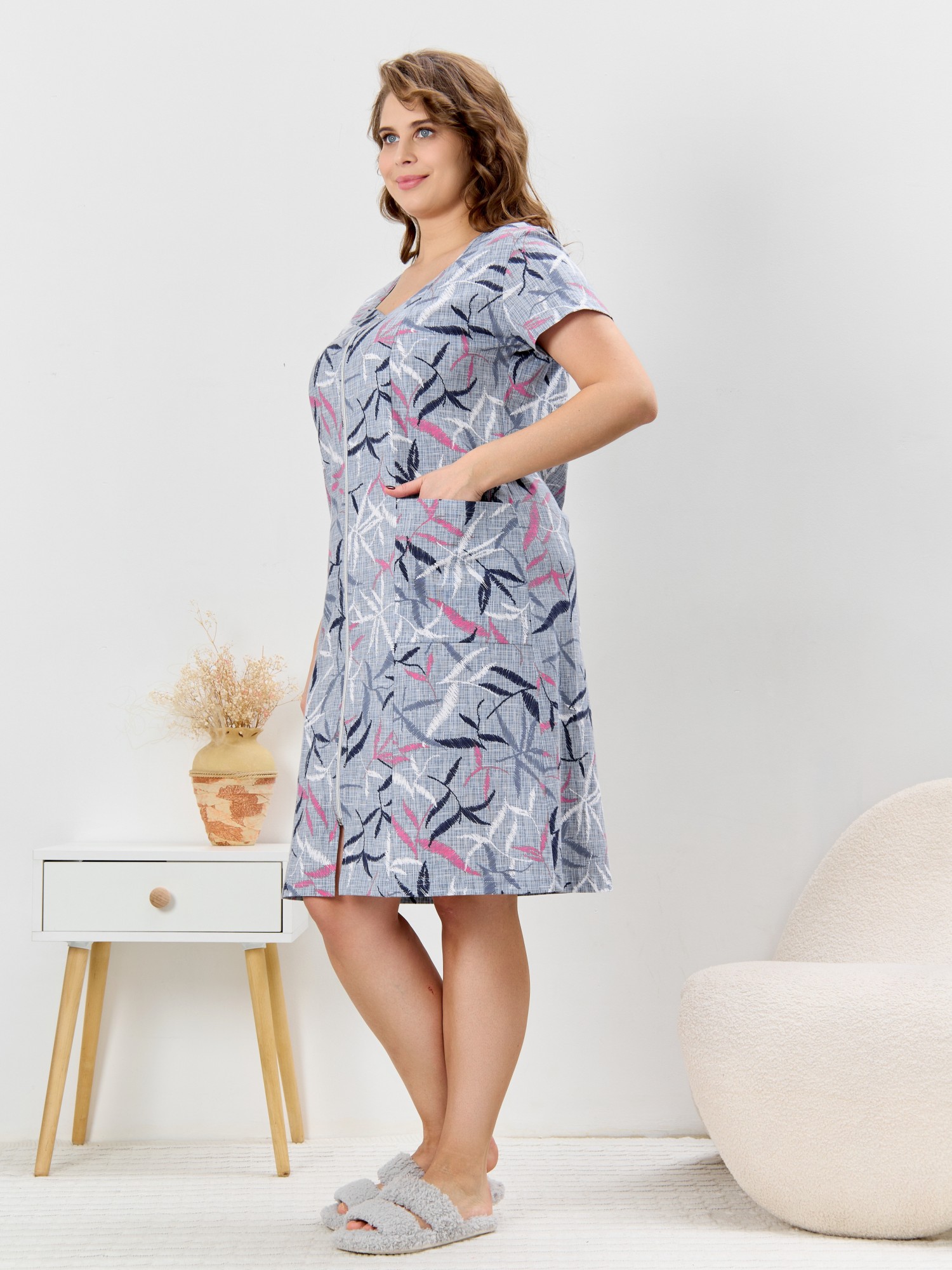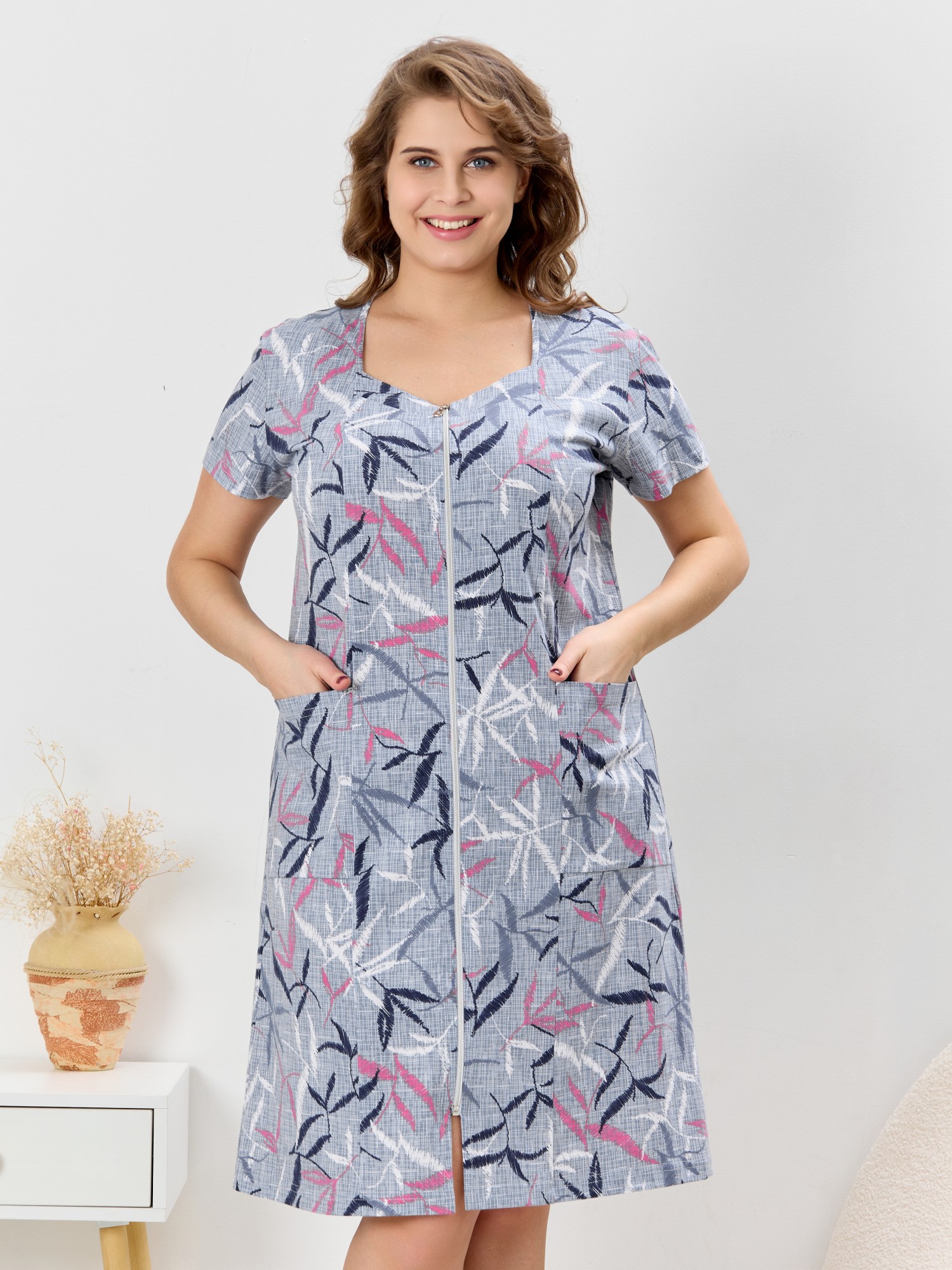 Халат женский из трикотажного полотна «кулирка» с набивным рисунком, прямого силуэта, с короткими втачными рукавами, горловиной фигурной формы, двумя накладными карманами на уровне бедер и центральной бортовой застежкой на тесьму «молния». Полочка – с рельефными швами, выходящими из горловины. Нижние срезы горловины обработаны притачными планками. Остальная часть горловины окантована основным материалом.