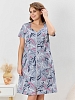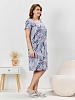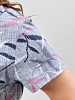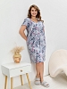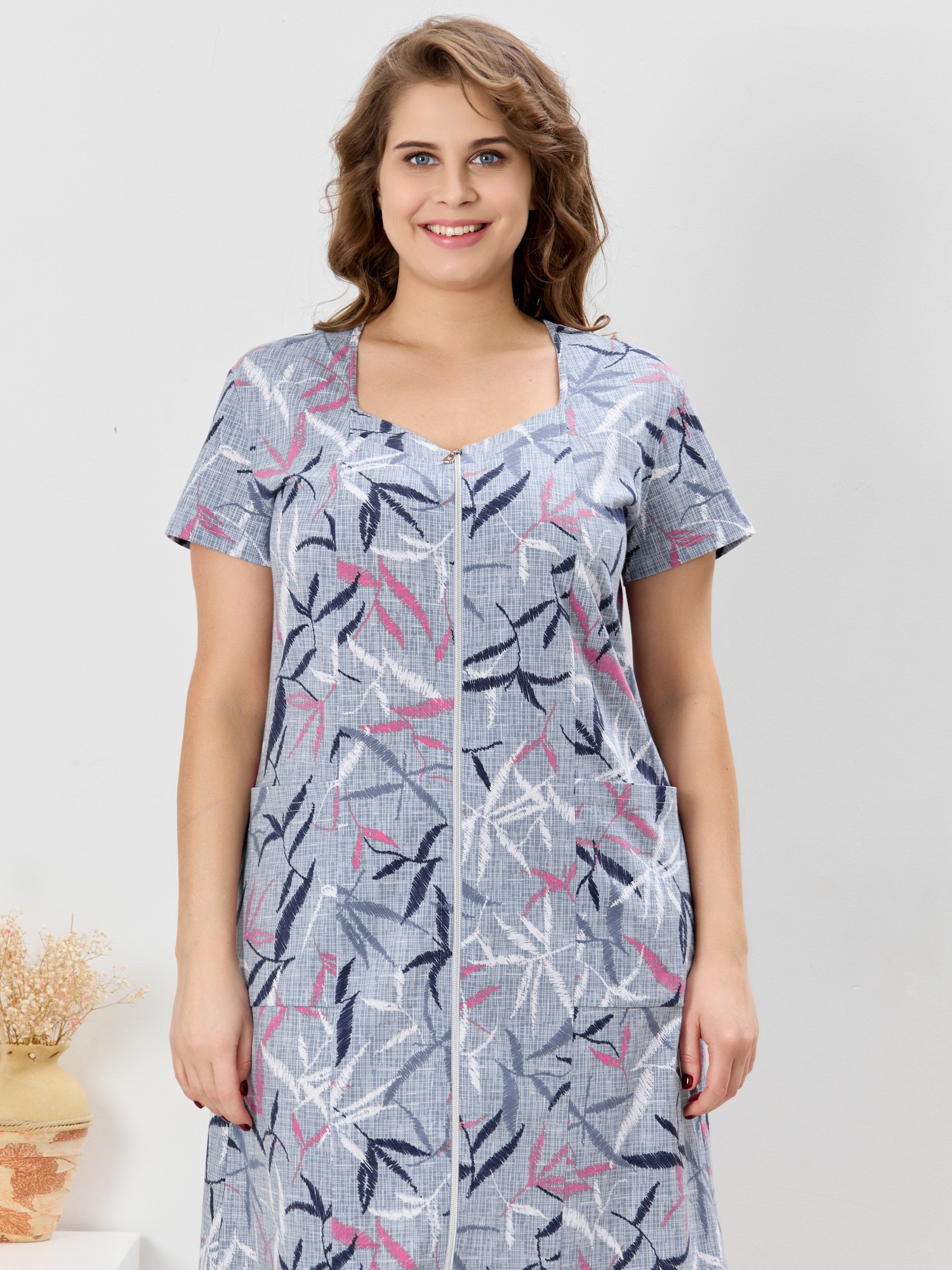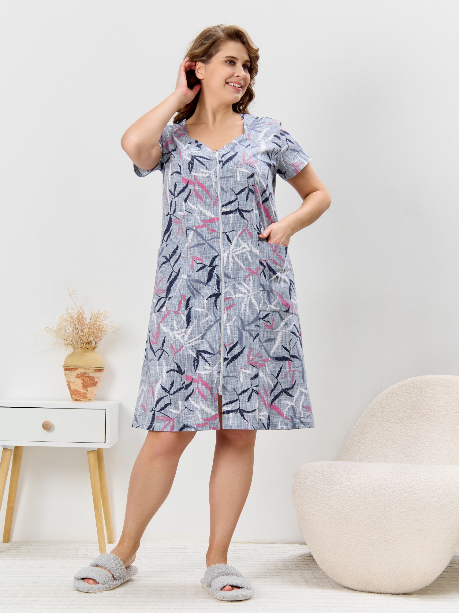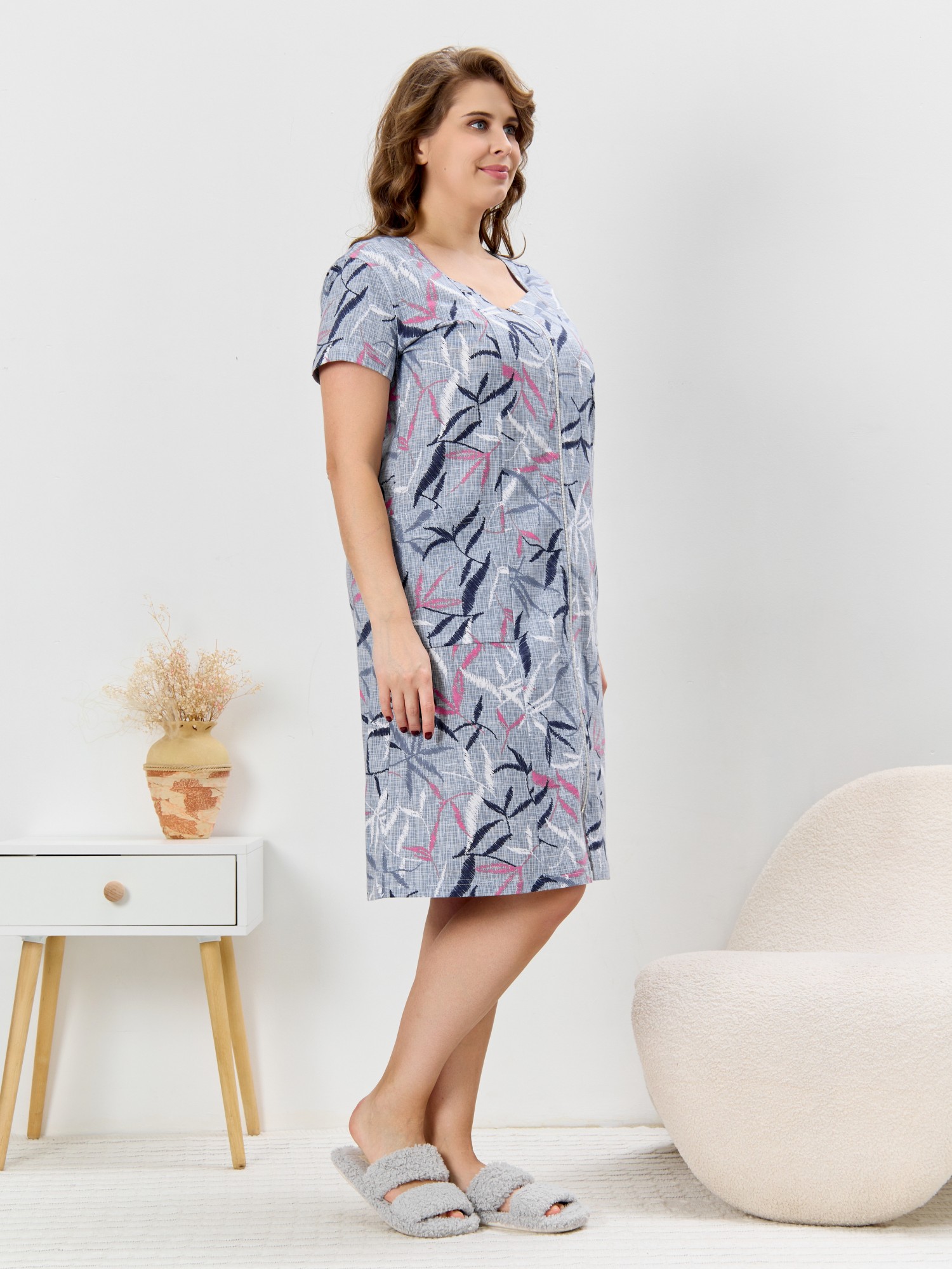 Халат женский из трикотажного полотна «кулирка» с набивным рисунком, прямого силуэта, с короткими втачными рукавами, горловиной фигурной формы, двумя накладными карманами на уровне бедер и центральной бортовой застежкой на тесьму «молния». Полочка – с рельефными швами, выходящими из горловины. Нижние срезы горловины обработаны притачными планками. Остальная часть горловины окантована основным материалом.