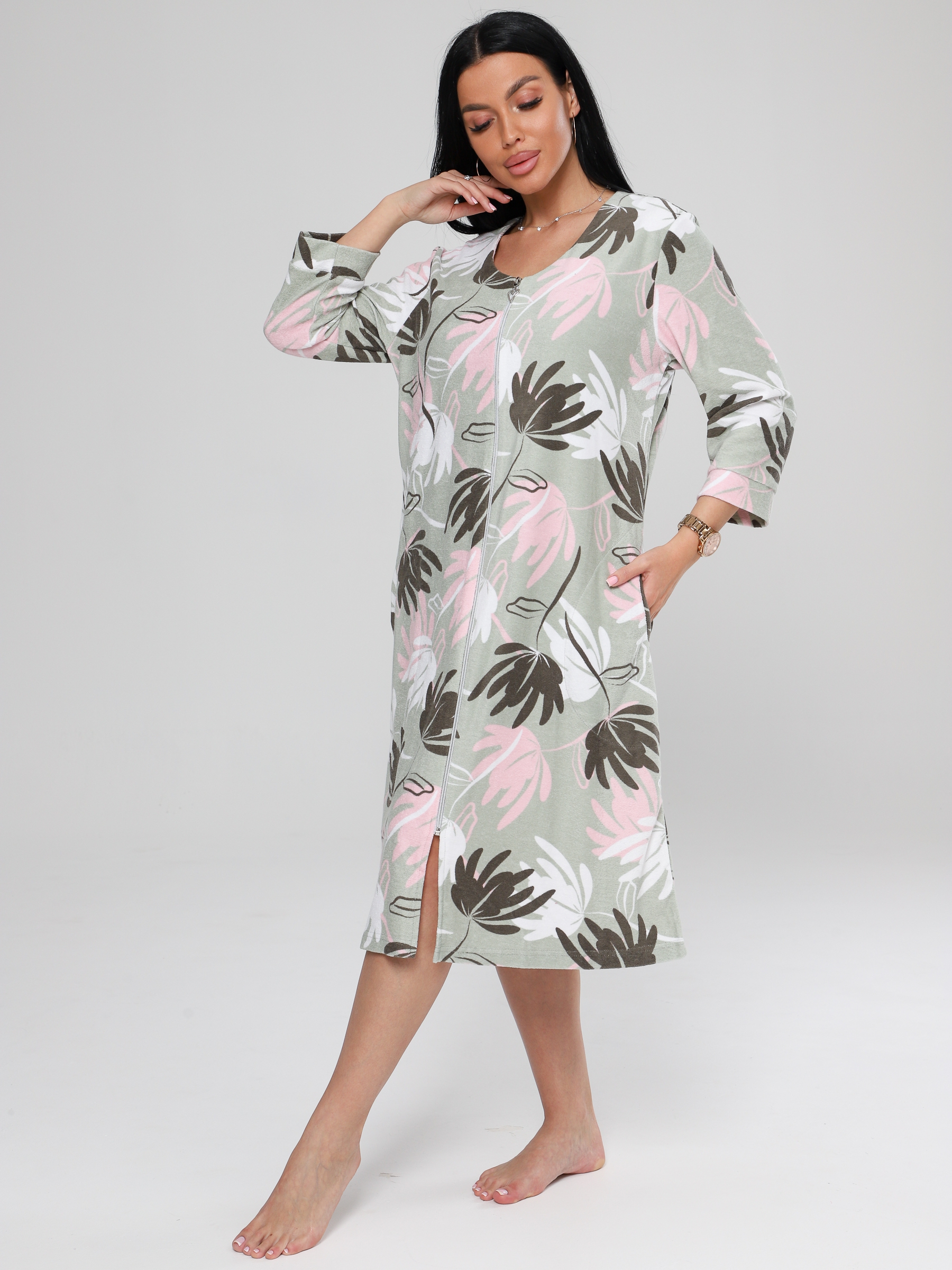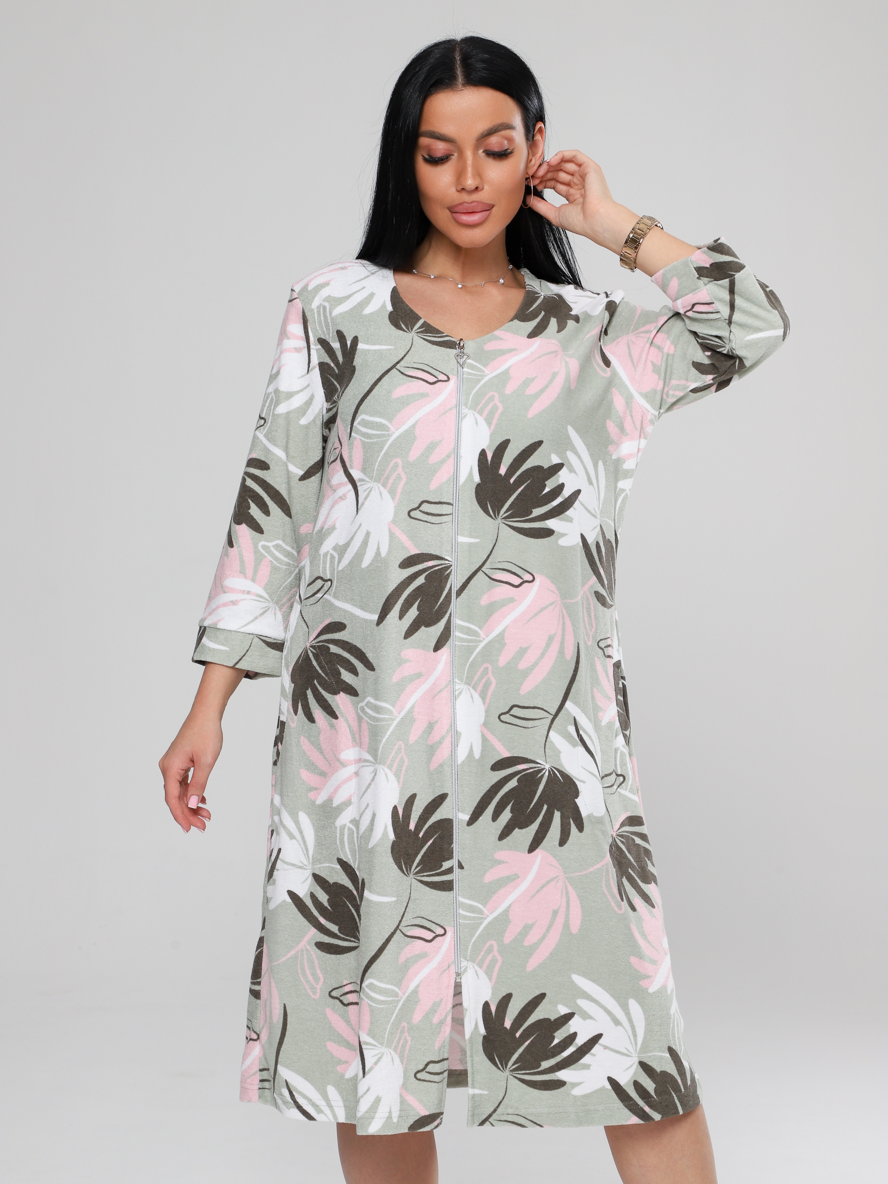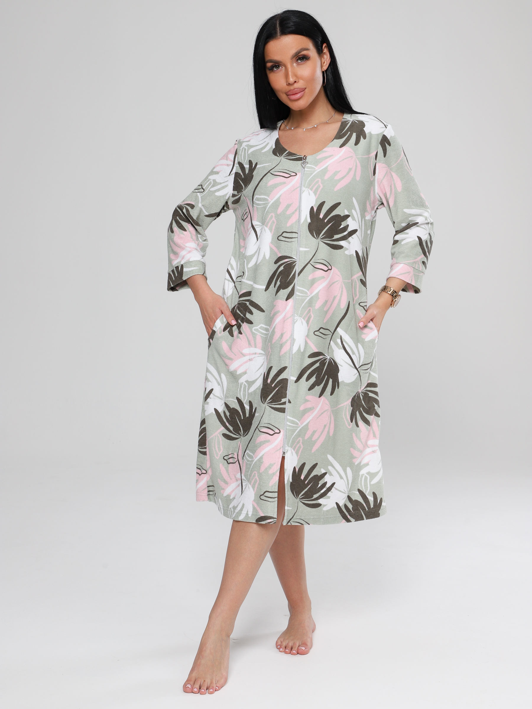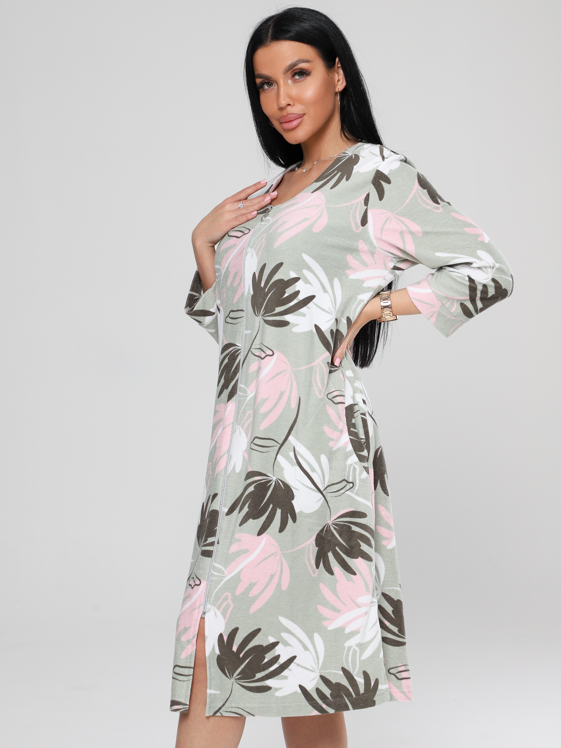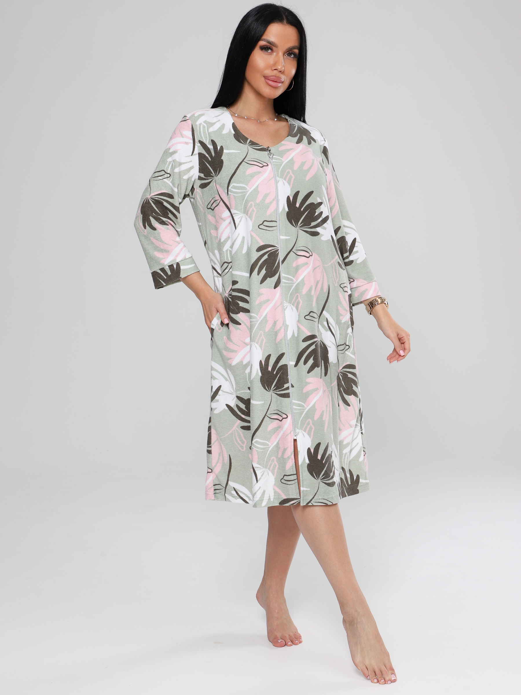Женский халат Х-80(М) из махры на молнии. Женский махровый халат имеет удобную застежку на молнии, рукав 3/4 с манжетами. Хлопковая махровая ткань халата подарит тепло и уют прохладными днями.