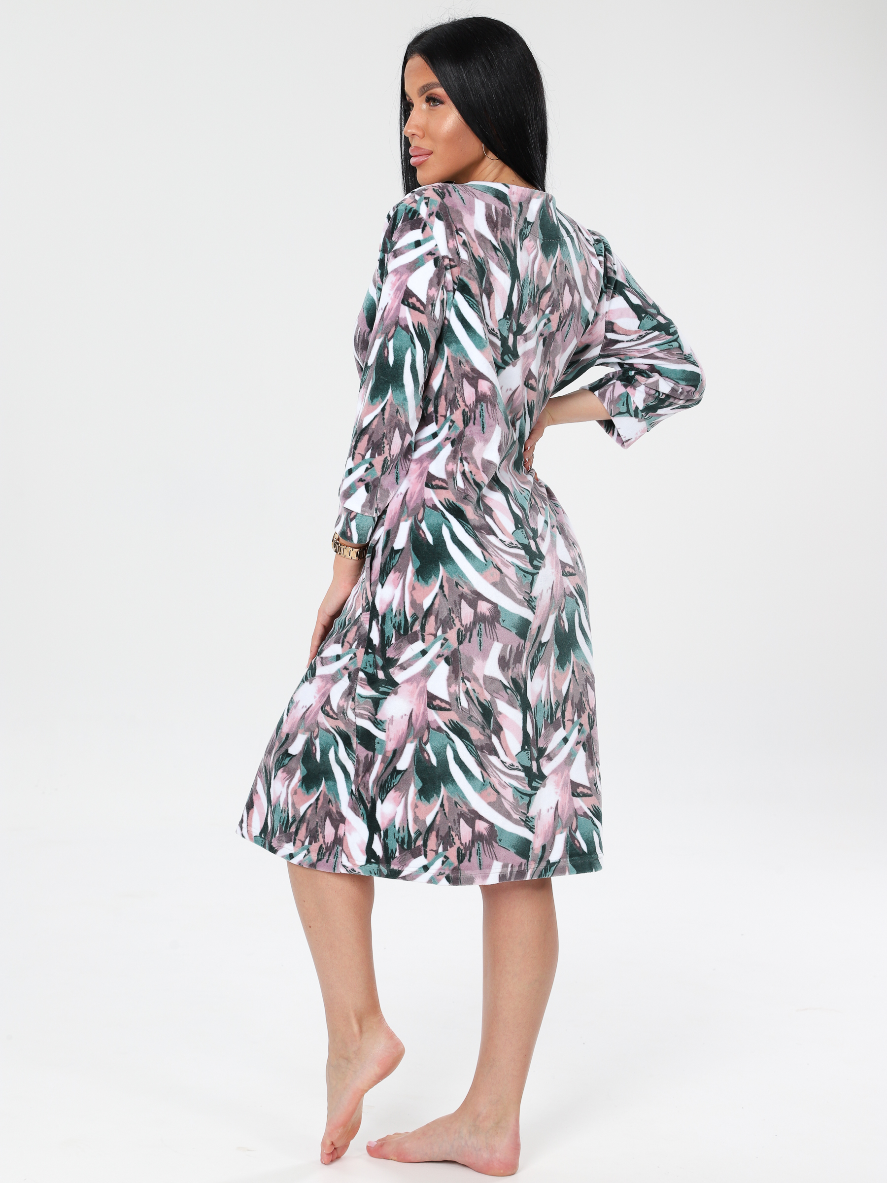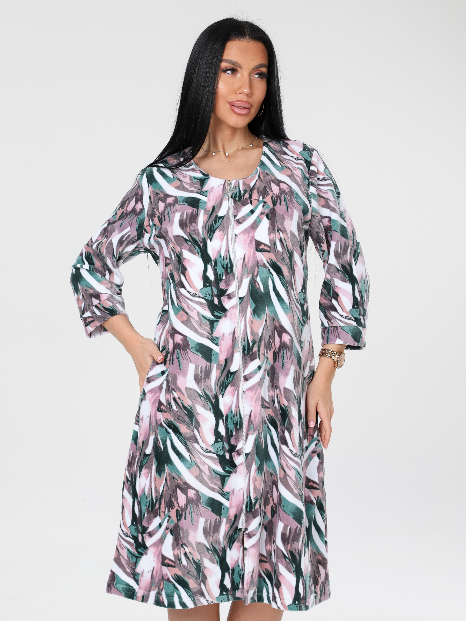 Женский халат Х-80(В) из велюра на молнии. Женский велюровый халат имеет удобную застежку на молнии, рукав 3/4 с манжетами. Хлопковая ткань халата подарит тепло и уют прохладными днями.