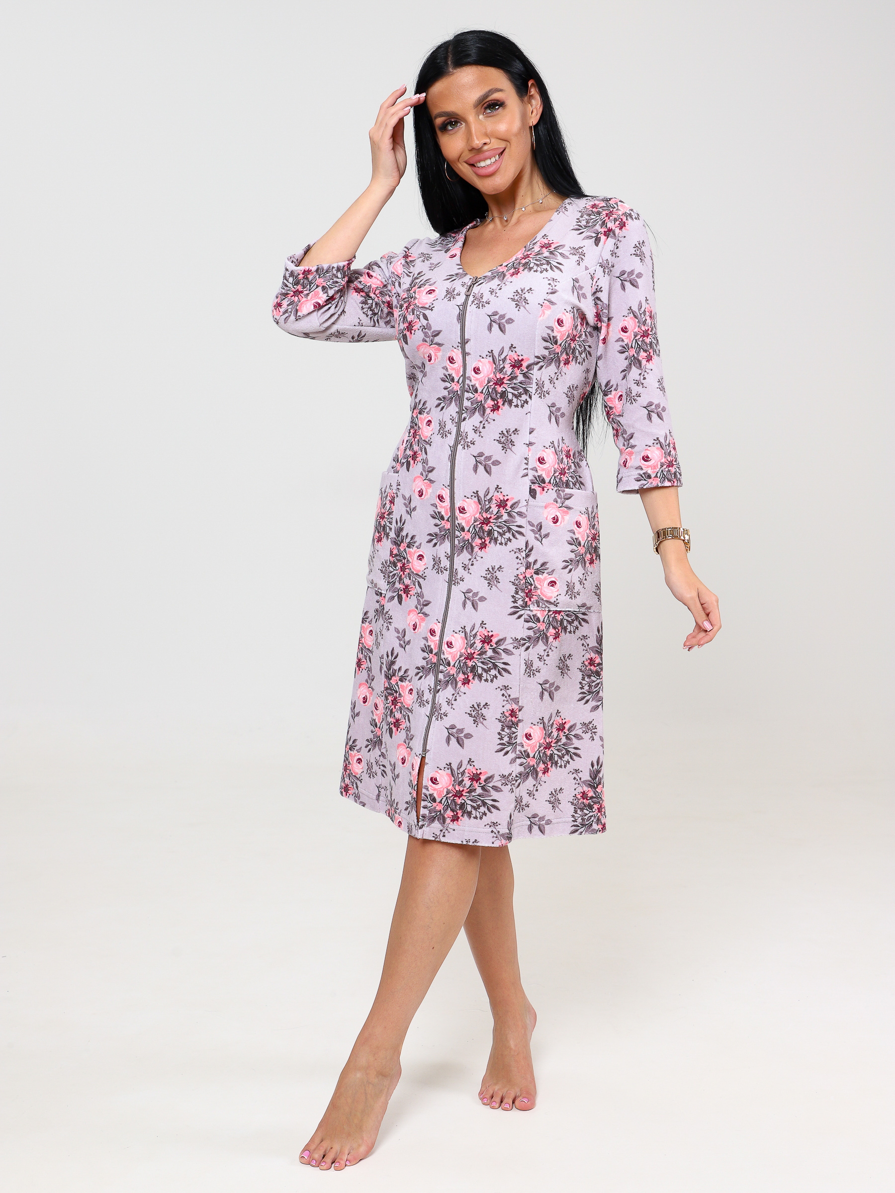 Халат женский махровый на молнии с рукавами 3/4, с вместительными и практичными накладными карманами, в боковых швах 2 хляста. Домашний махровый халат - вещь незаменимая для тех, кто ценит комфорт и привык к уюту в доме. Обладает прекрасными влагопоглощающими и согревающими свойствами. Такой халат отлично подойдет для дома и отдыха, приятно порадует женщин больших размеров. Полуприлегающий силуэт и рельефы, обеспечивают идеальную посадку по фигуре даже больших размеров!