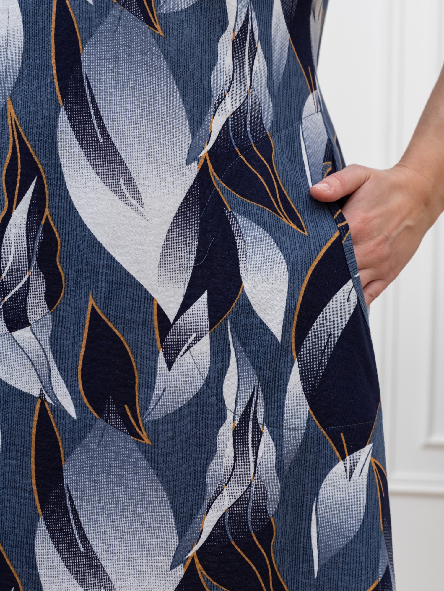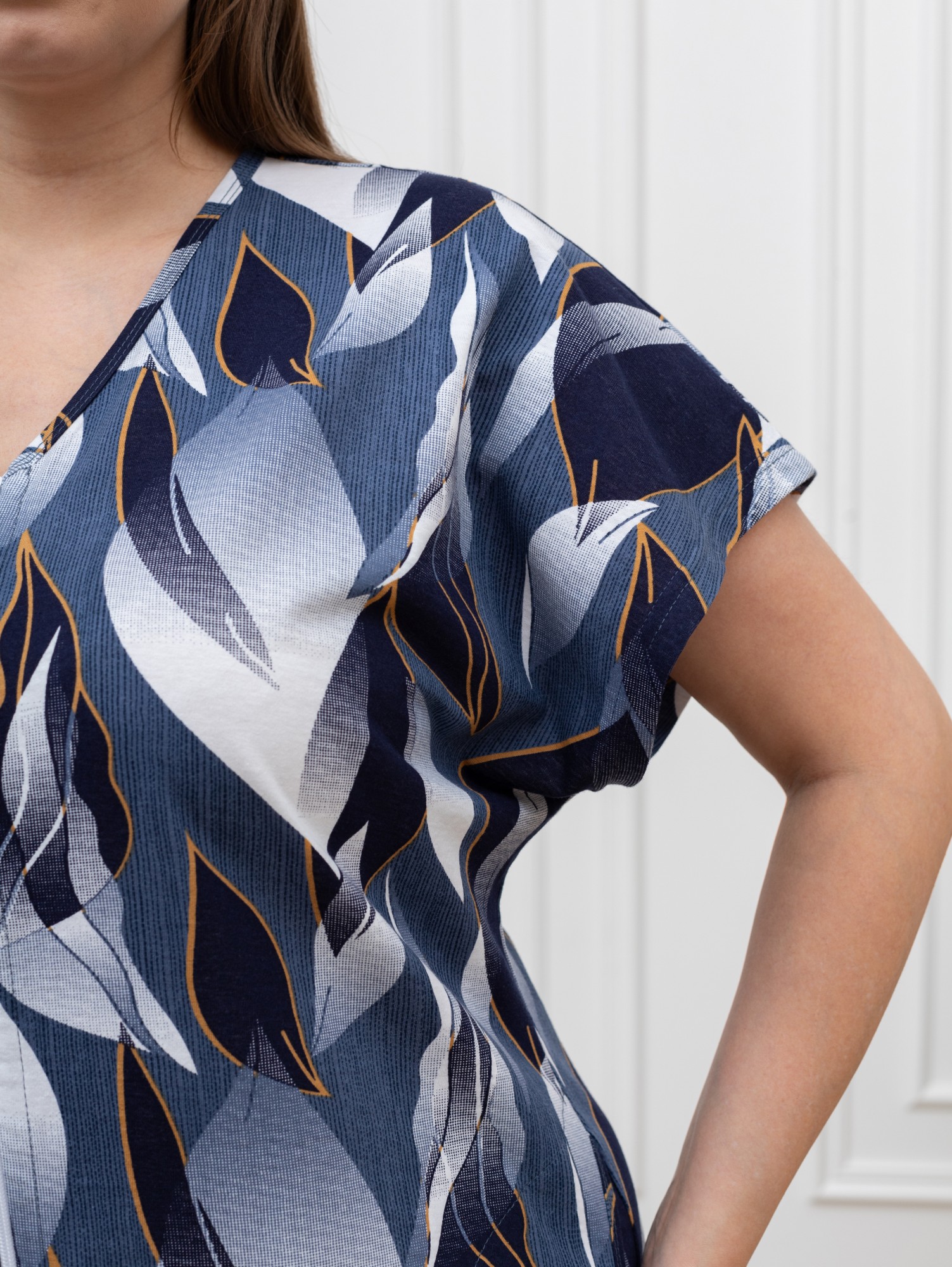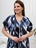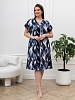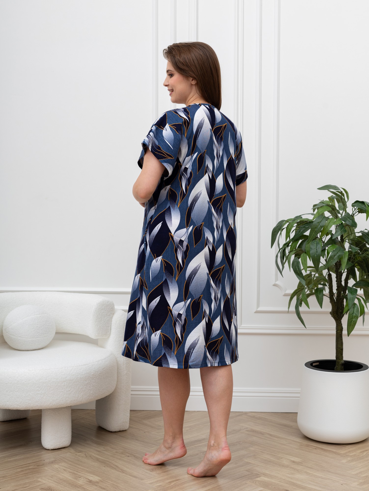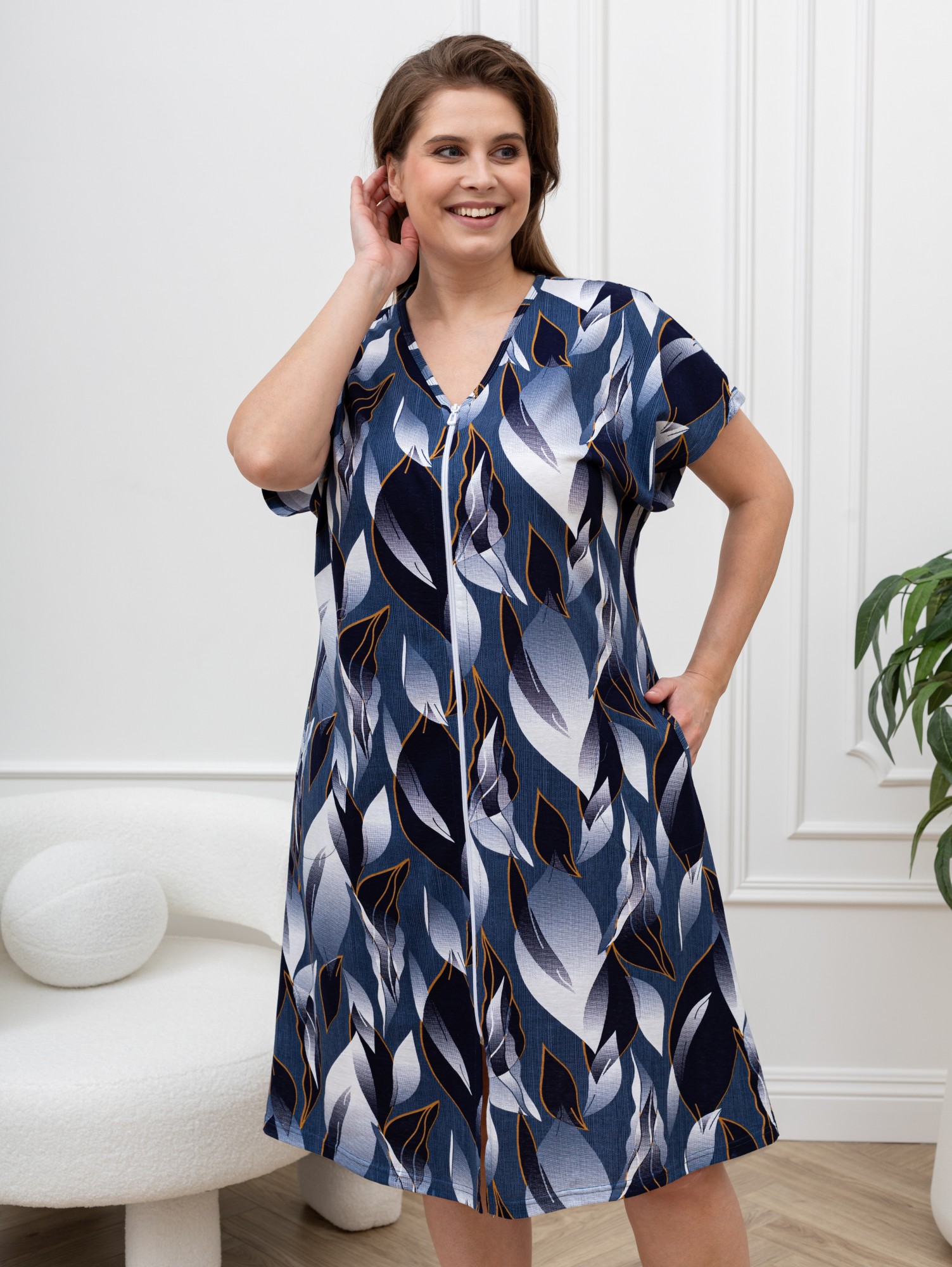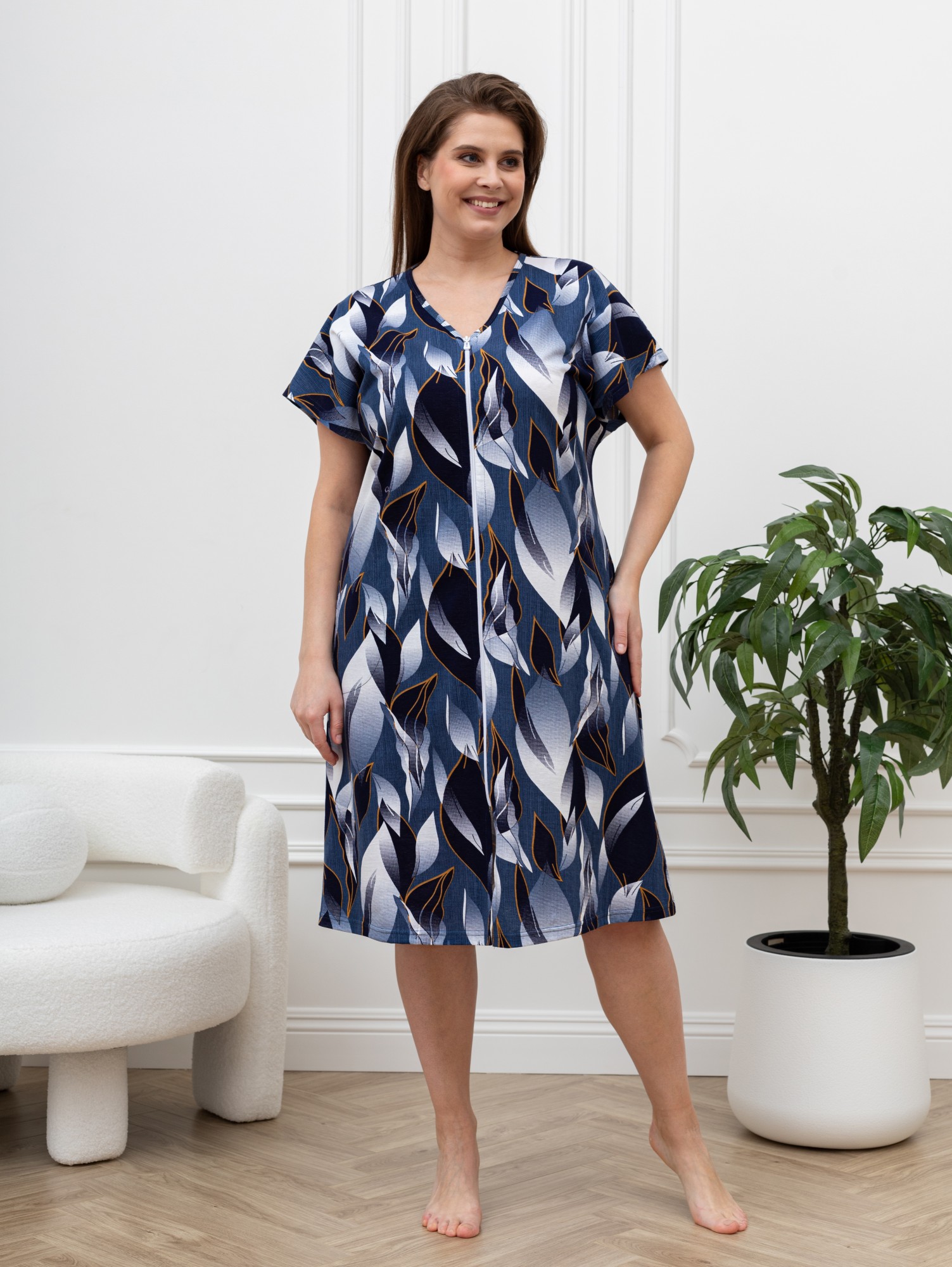 Халат женский из трикотажного полотна «кулирка» с набивным рисунком, слегка расширенный книзу, с короткими цельнокроеными рукавами, V-образной горловиной, карманами в боковых швах и центральной бортовой застежкой на тесьму «молния». Горловина и входы в карманы окантованы основным материалом.