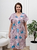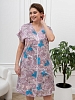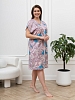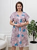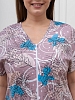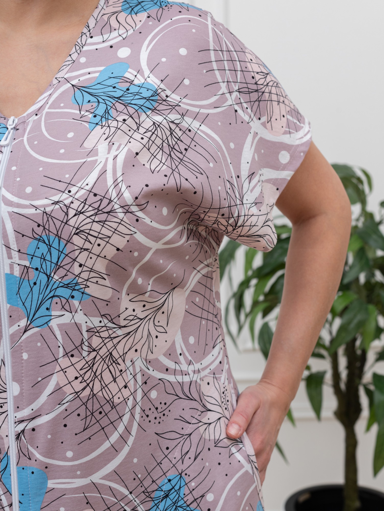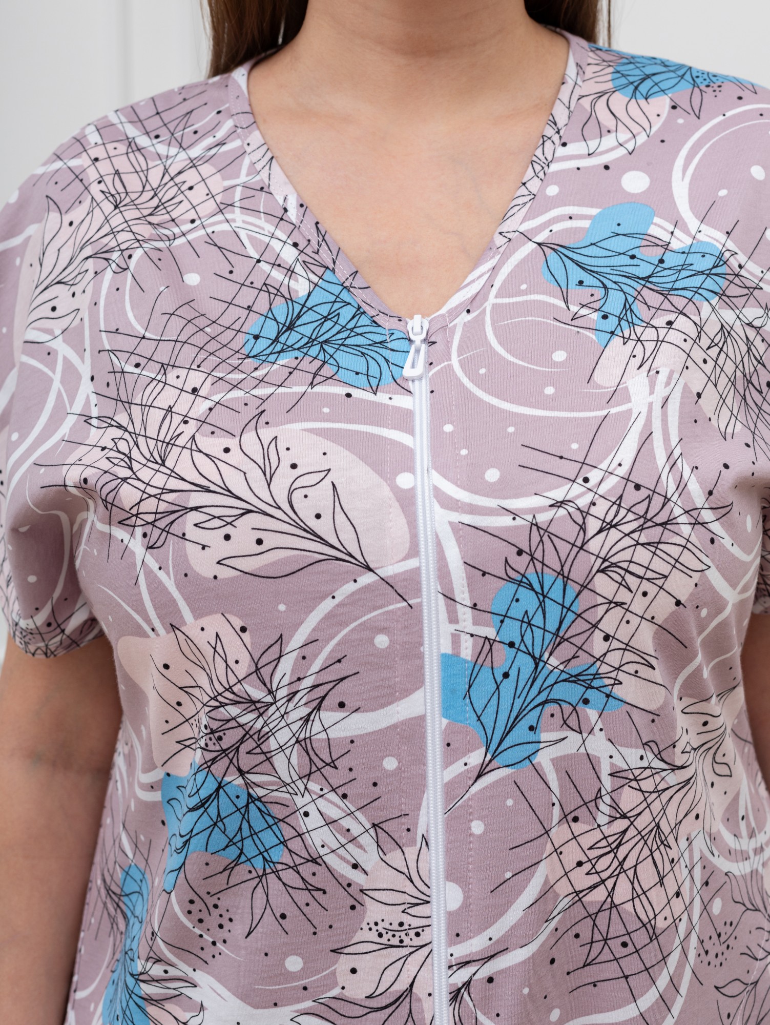 Халат женский из трикотажного полотна «кулирка» с набивным рисунком, слегка расширенный книзу, с короткими цельнокроеными рукавами, V-образной горловиной, карманами в боковых швах и центральной бортовой застежкой на тесьму «молния». Горловина и входы в карманы окантованы основным материалом.
