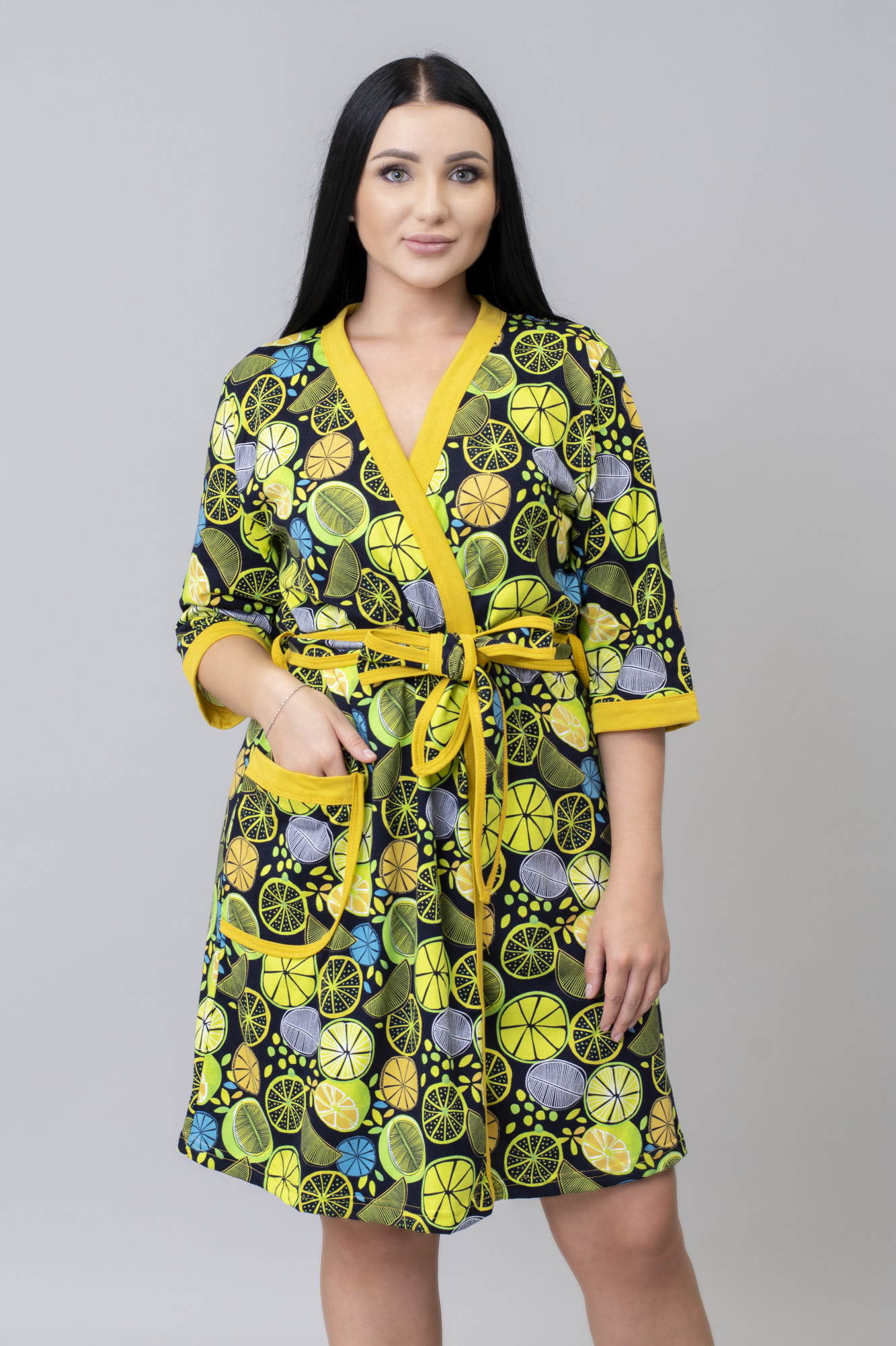 Классический халат-кимоно с запахом, завязывается на талии поясом.