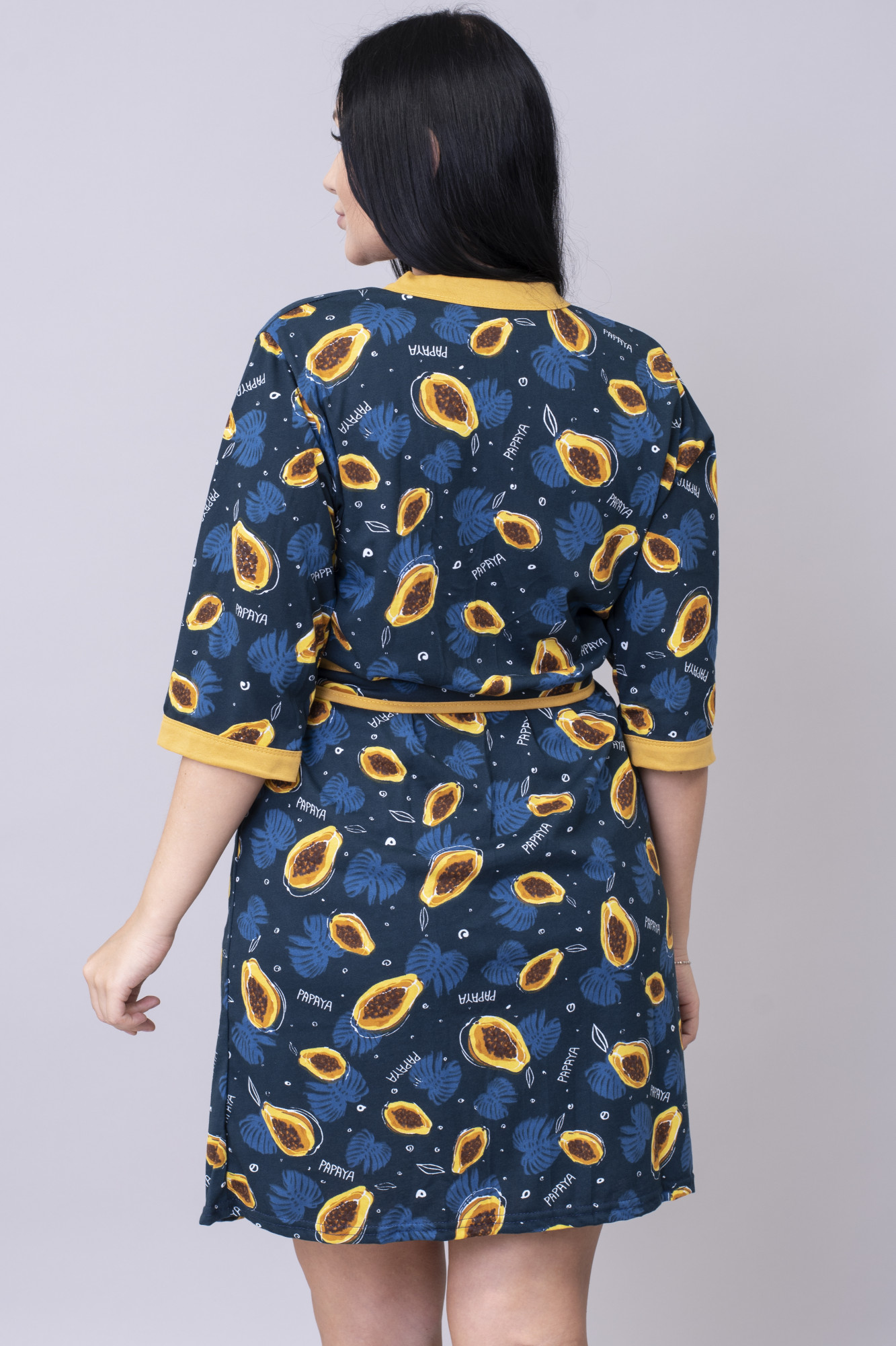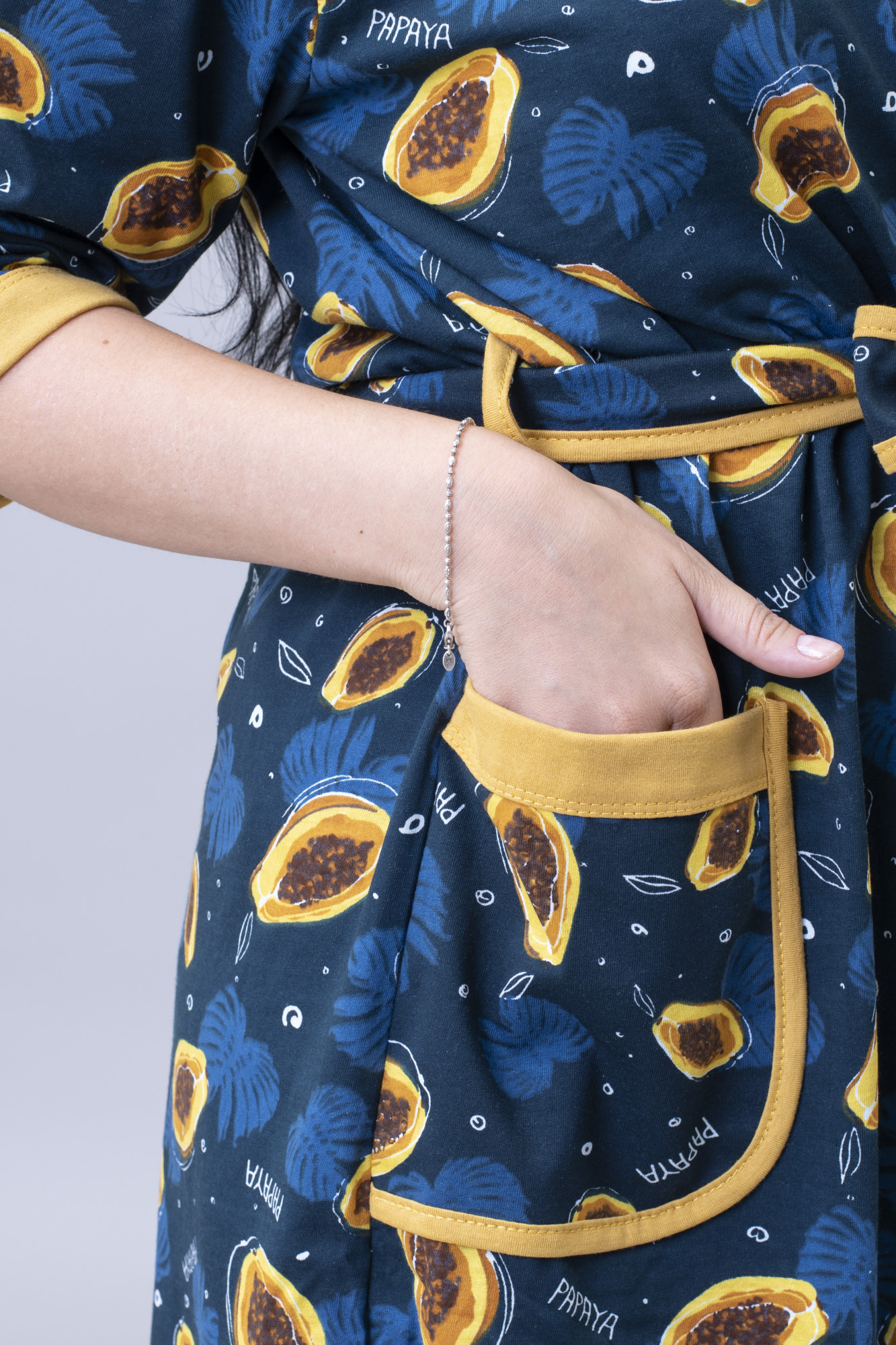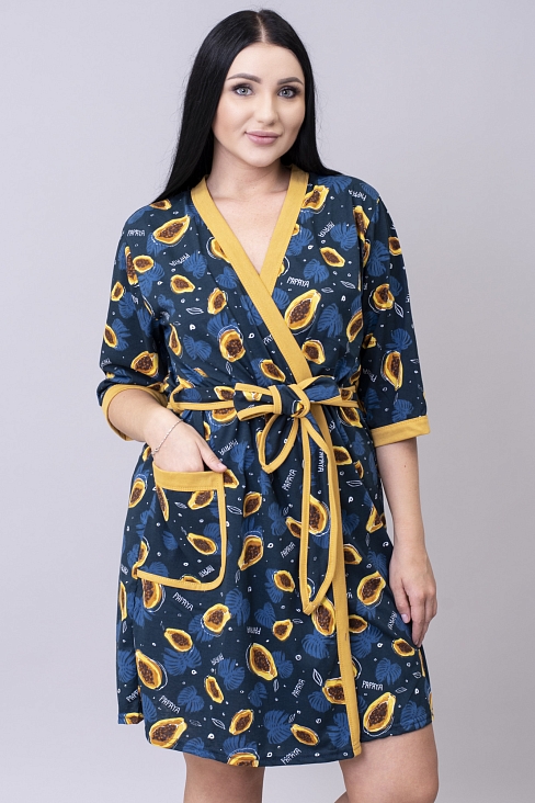 Классический халат-кимоно с запахом, завязывается на талии поясом.