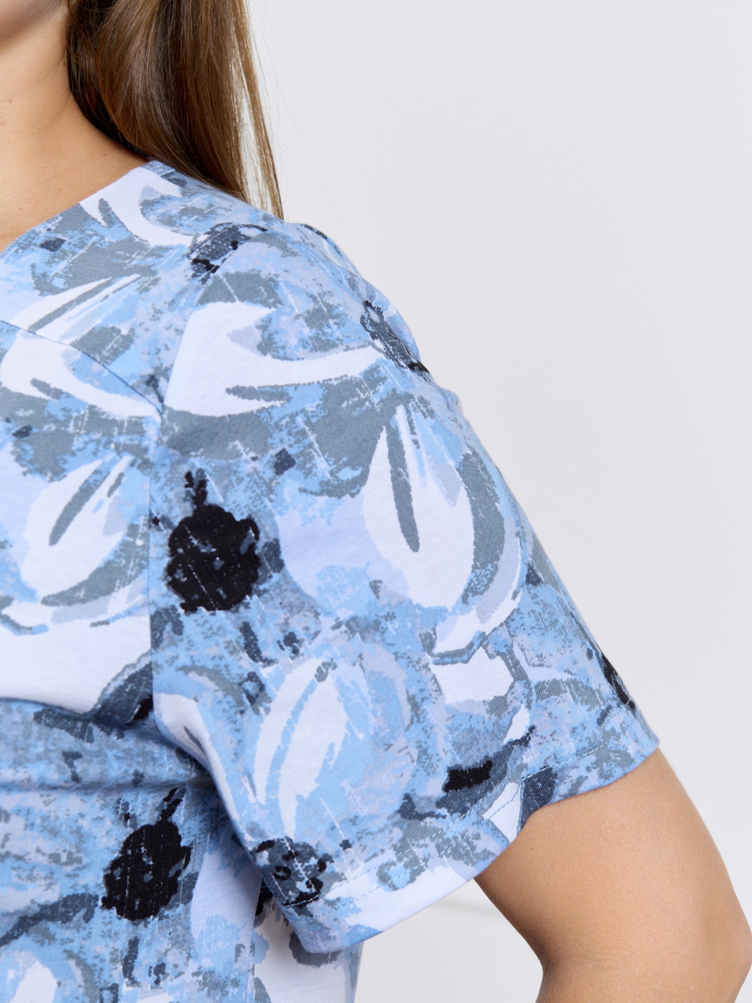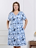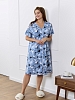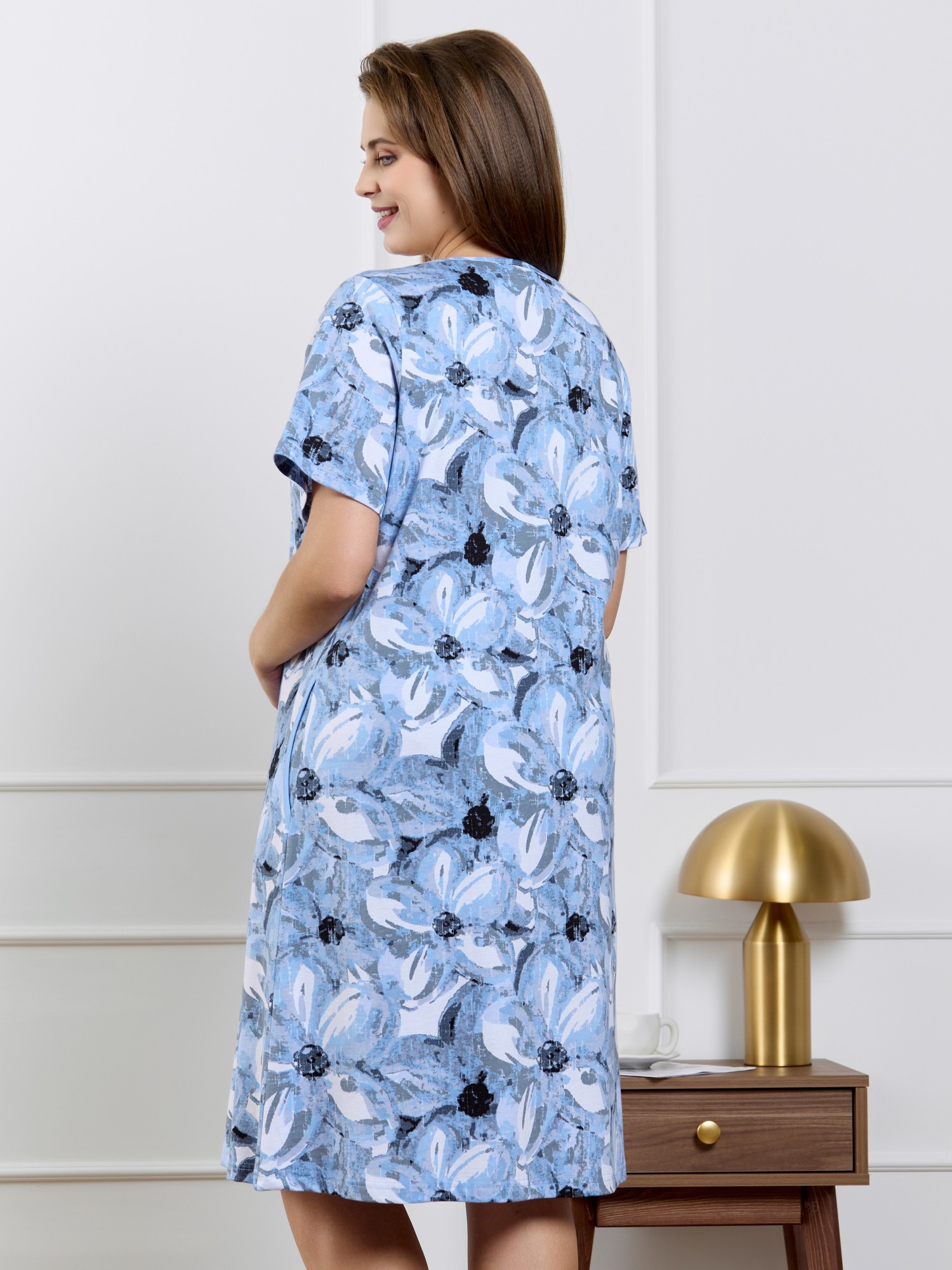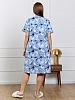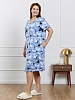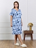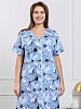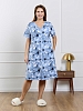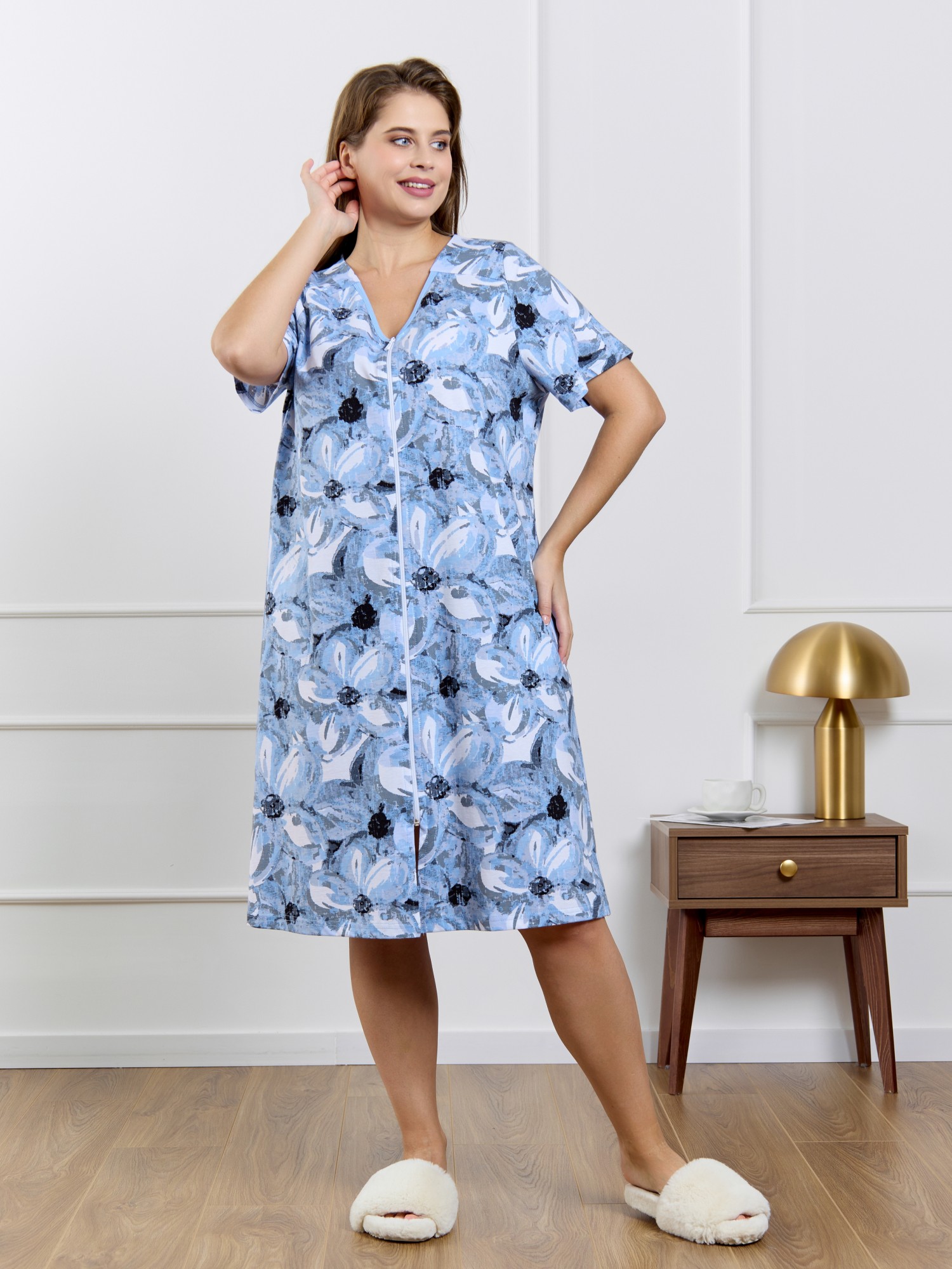 Халат женский из трикотажного полотна «кулирка» с набивным рисунком, прямого силуэта, с короткими втачными рукавами, горловиной V- образной формы, карманами в боковых швах и центральной бортовой застежкой на тесьму «молния». Полочка – с двумя небольшими двойными кокетками, выполненными по косой линии. Горловина переда, входы в карманы окантованы контрастным материалом.