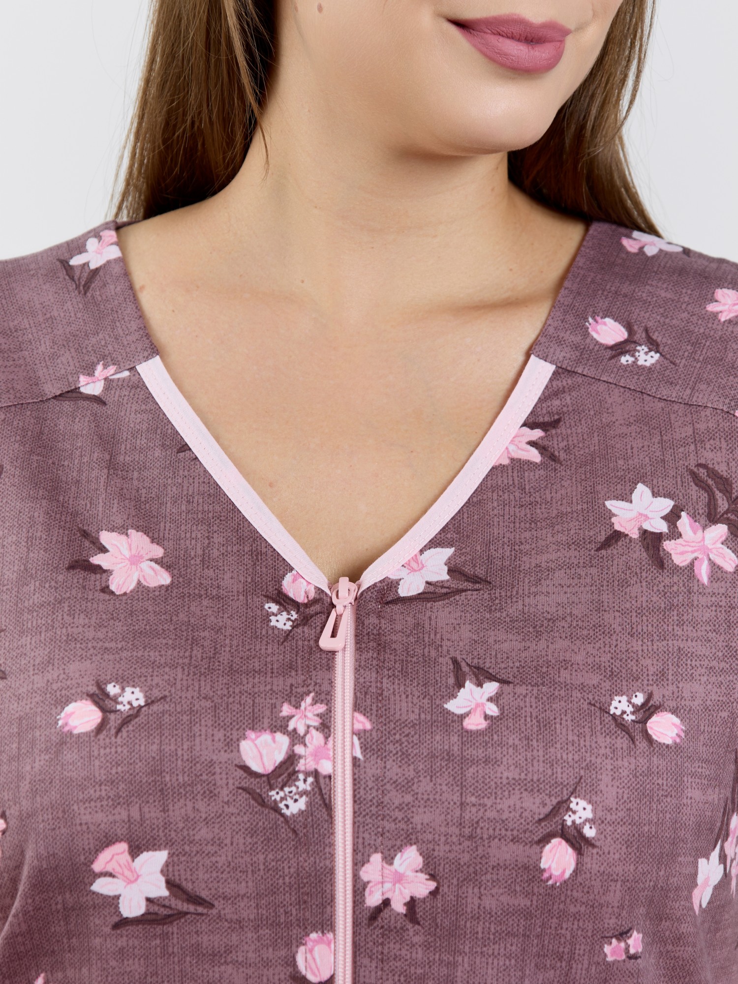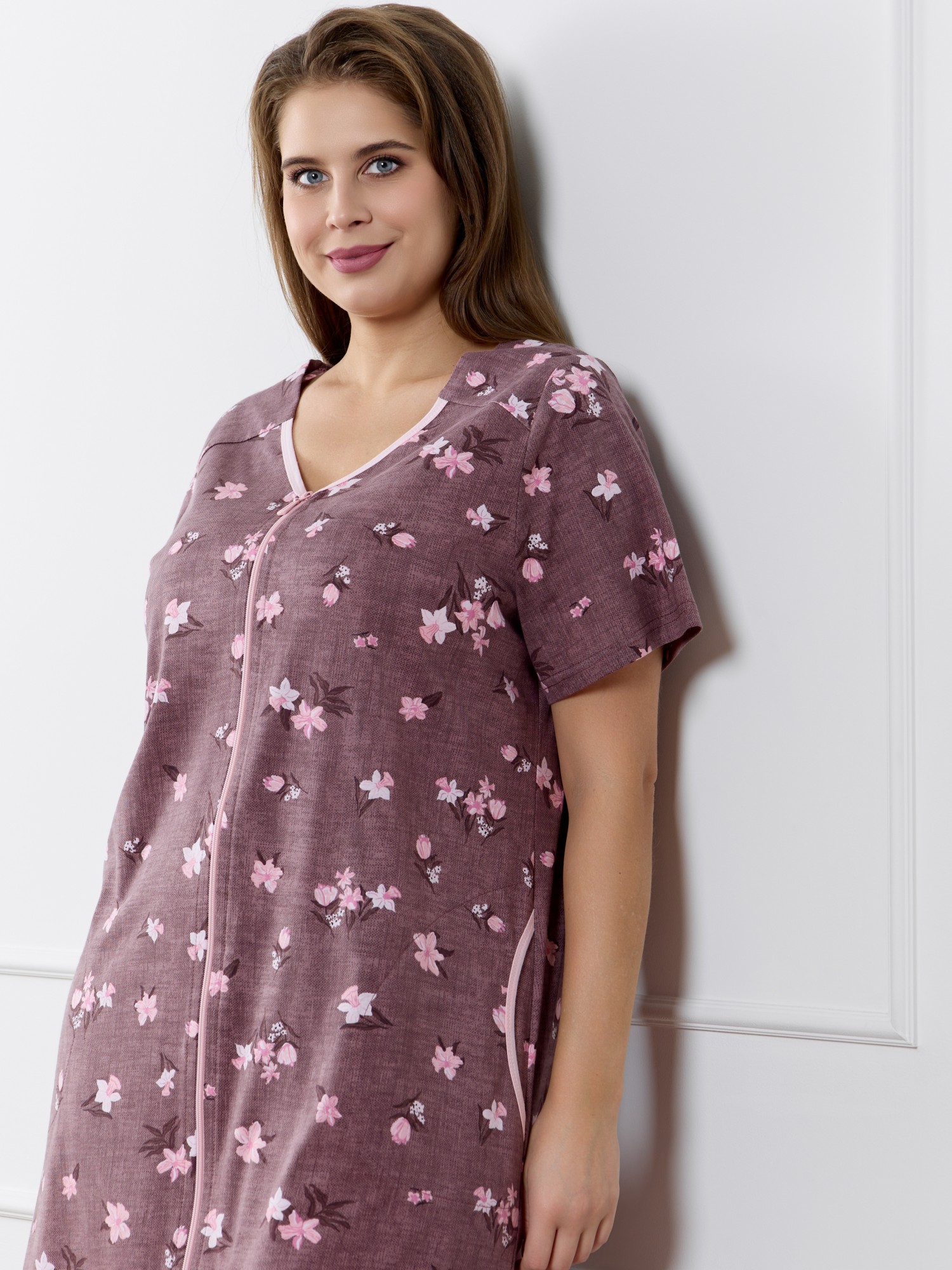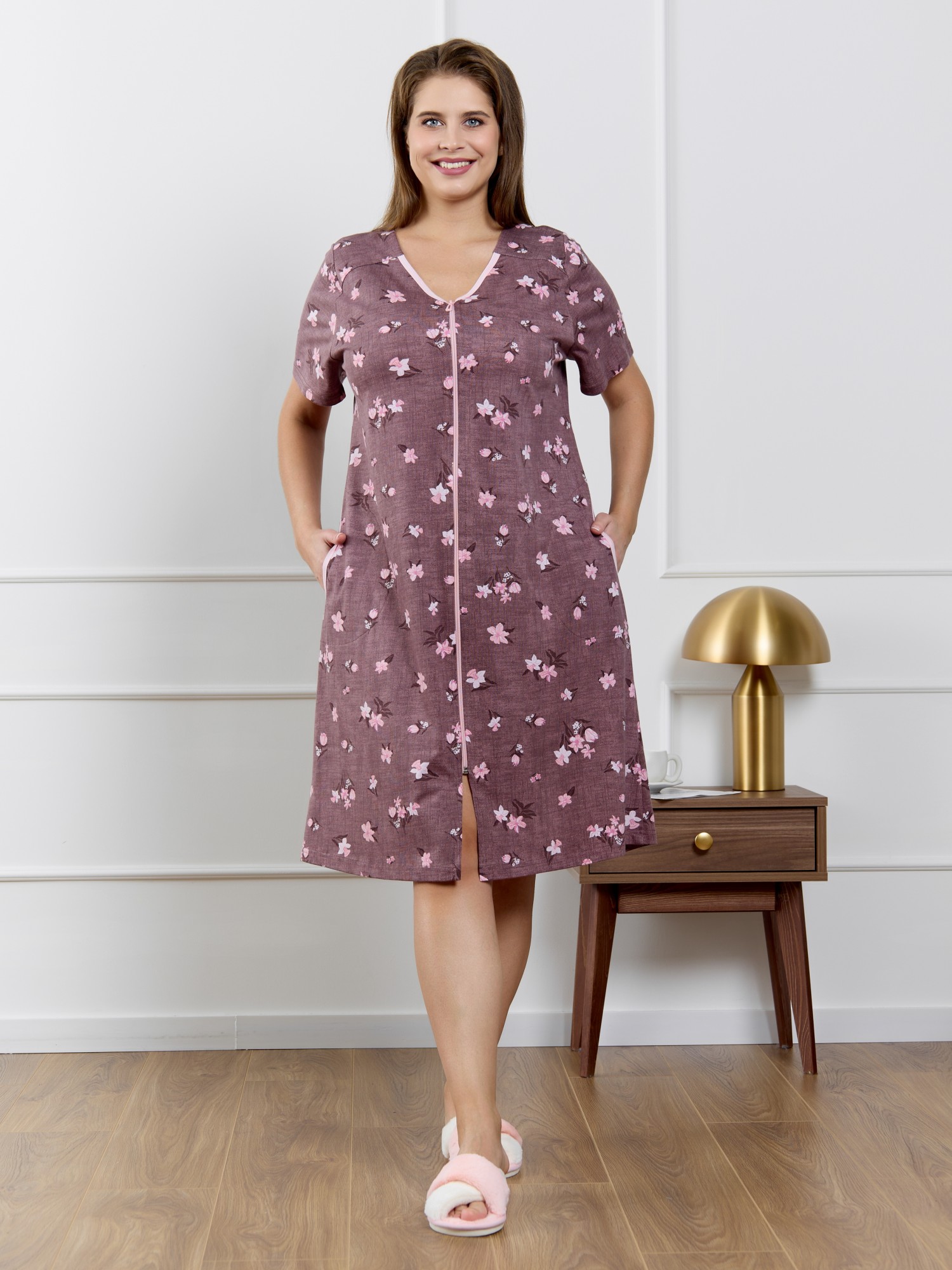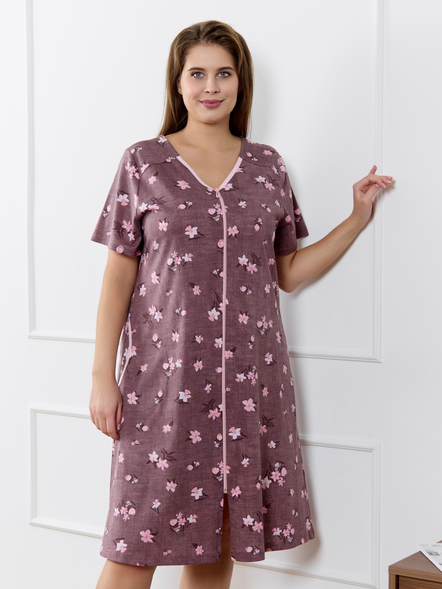 Халат женский из трикотажного полотна «кулирка» с набивным рисунком, прямого силуэта, с короткими втачными рукавами, горловиной V- образной формы, карманами в боковых швах и центральной бортовой застежкой на тесьму «молния». Полочка – с двумя небольшими двойными кокетками, выполненными по косой линии. Горловина переда, входы в карманы окантованы контрастным материалом.
