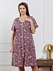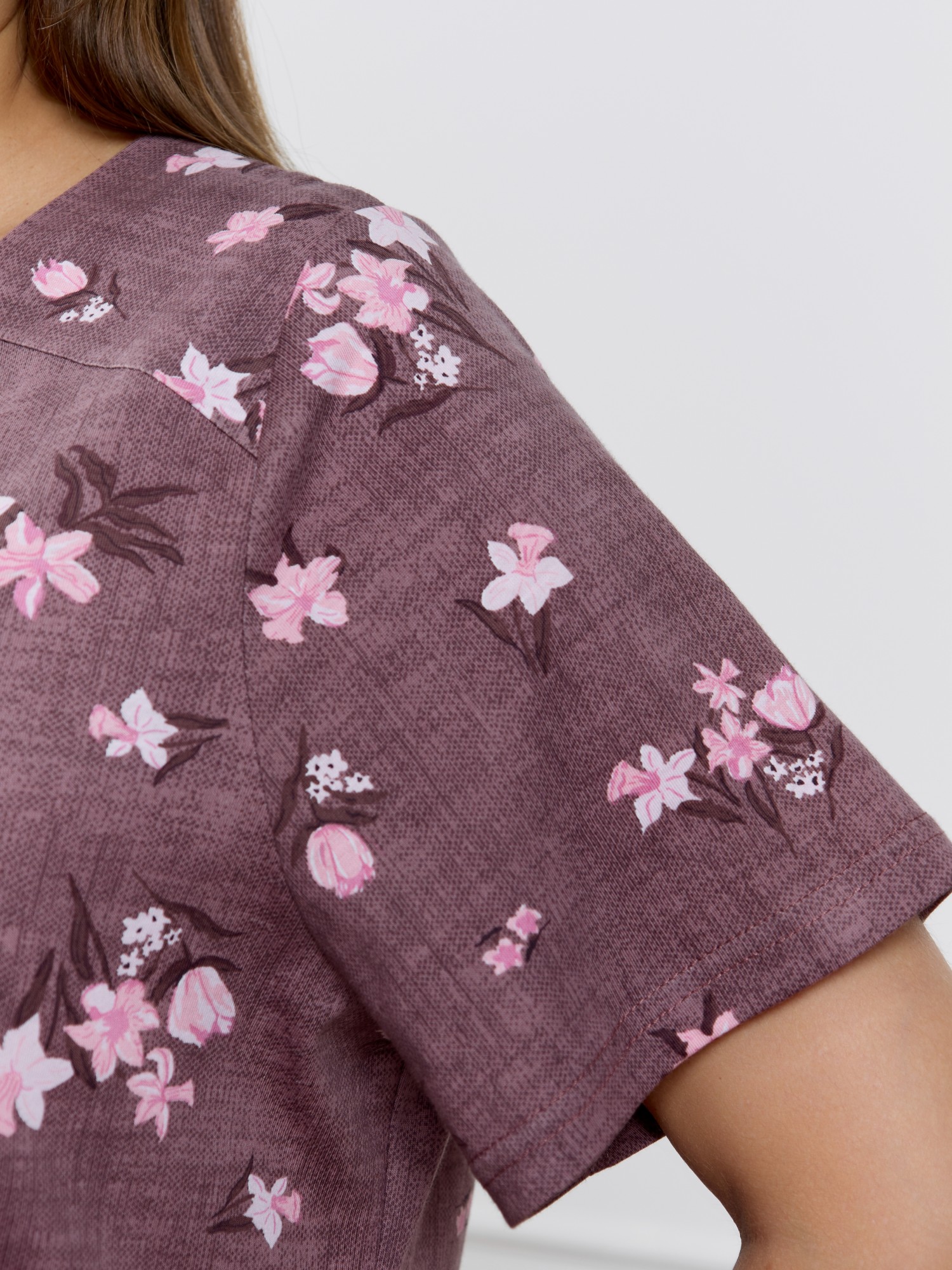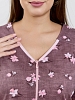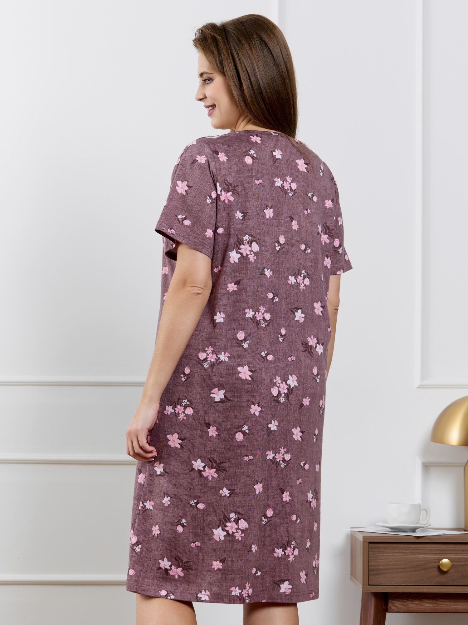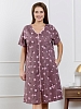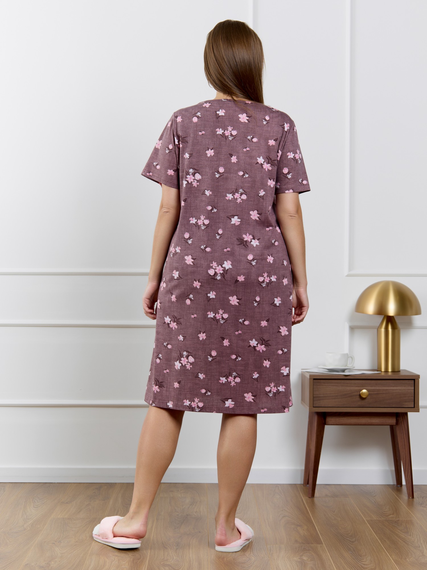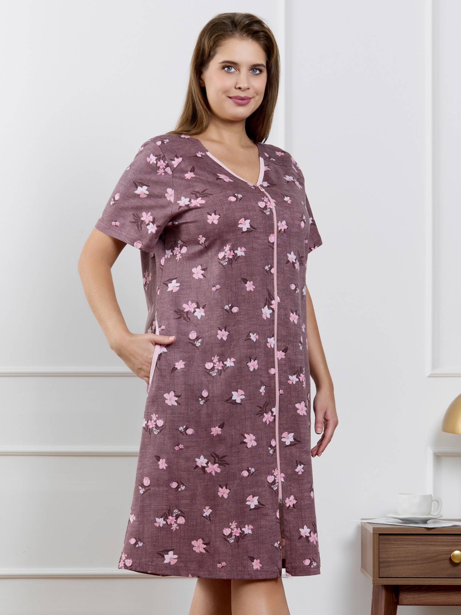 Халат женский из трикотажного полотна «кулирка» с набивным рисунком, прямого силуэта, с короткими втачными рукавами, горловиной V- образной формы, карманами в боковых швах и центральной бортовой застежкой на тесьму «молния». Полочка – с двумя небольшими двойными кокетками, выполненными по косой линии. Горловина переда, входы в карманы окантованы контрастным материалом.