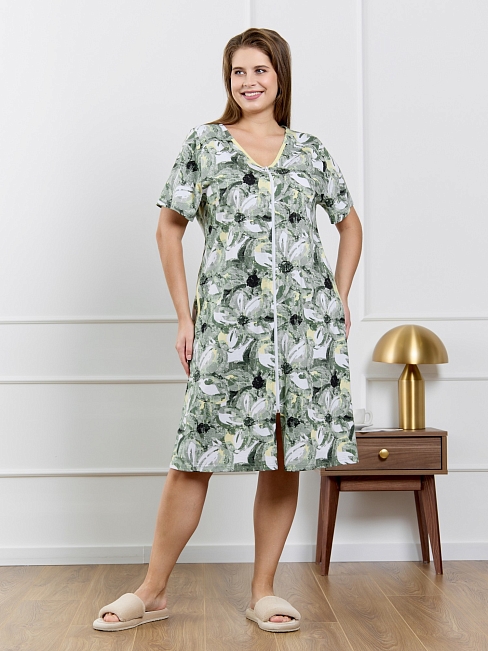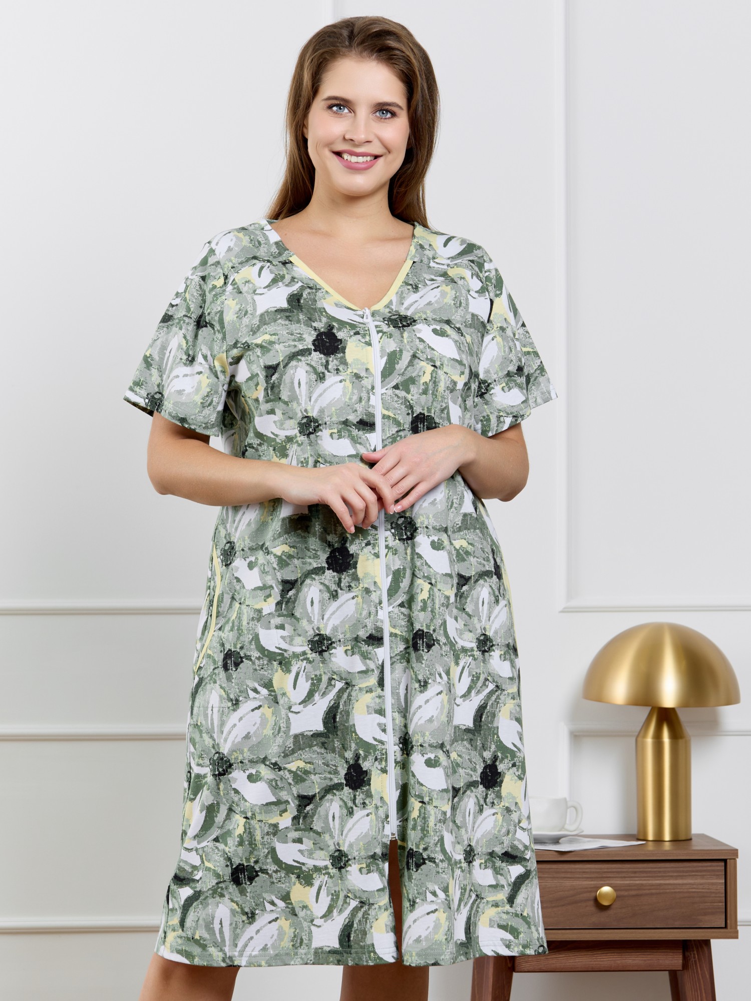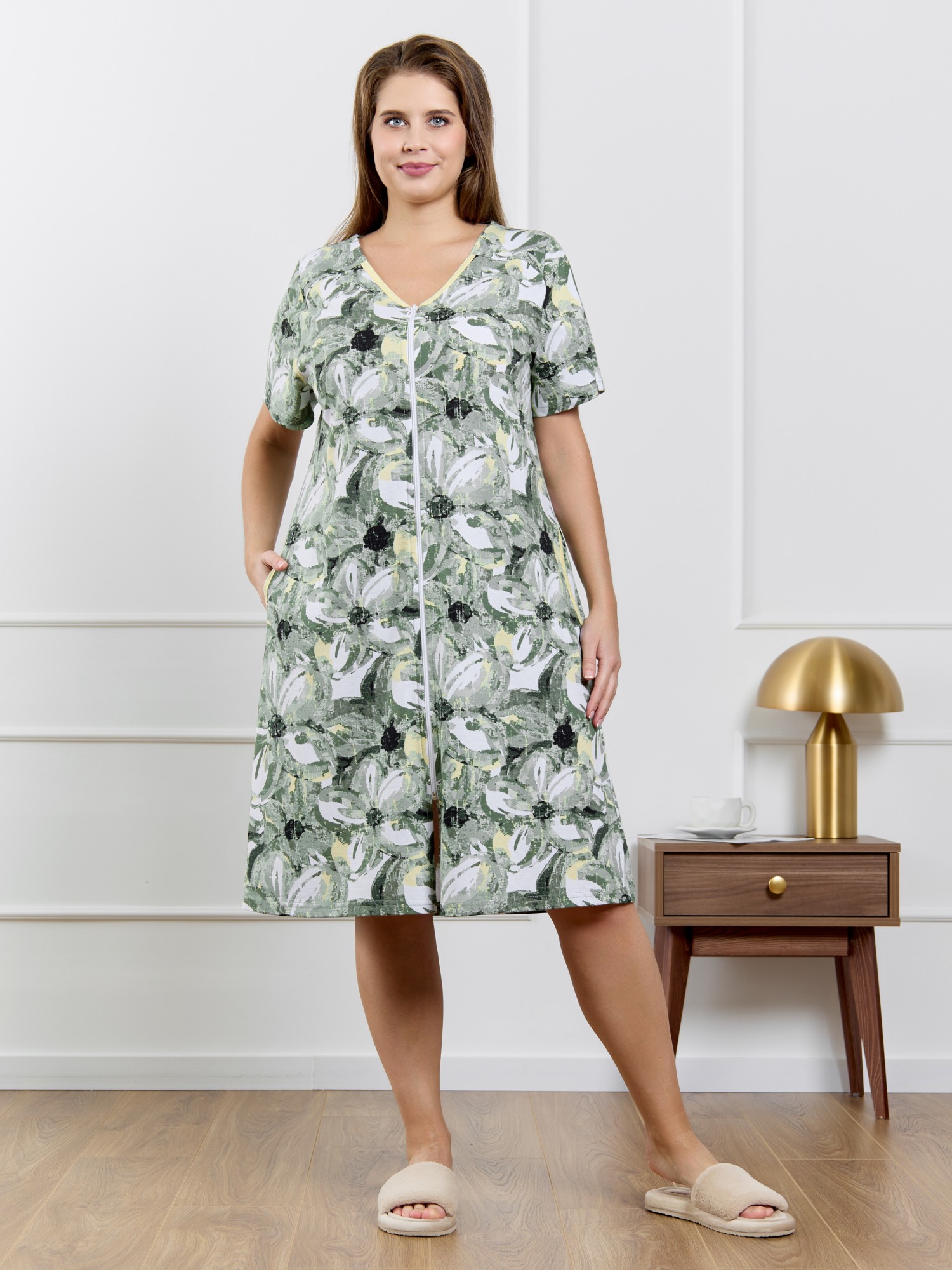 Халат женский из трикотажного полотна «кулирка» с набивным рисунком, прямого силуэта, с короткими втачными рукавами, горловиной V- образной формы, карманами в боковых швах и центральной бортовой застежкой на тесьму «молния». Полочка – с двумя небольшими двойными кокетками, выполненными по косой линии. Горловина переда, входы в карманы окантованы контрастным материалом.