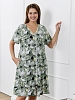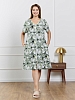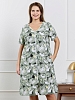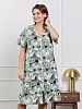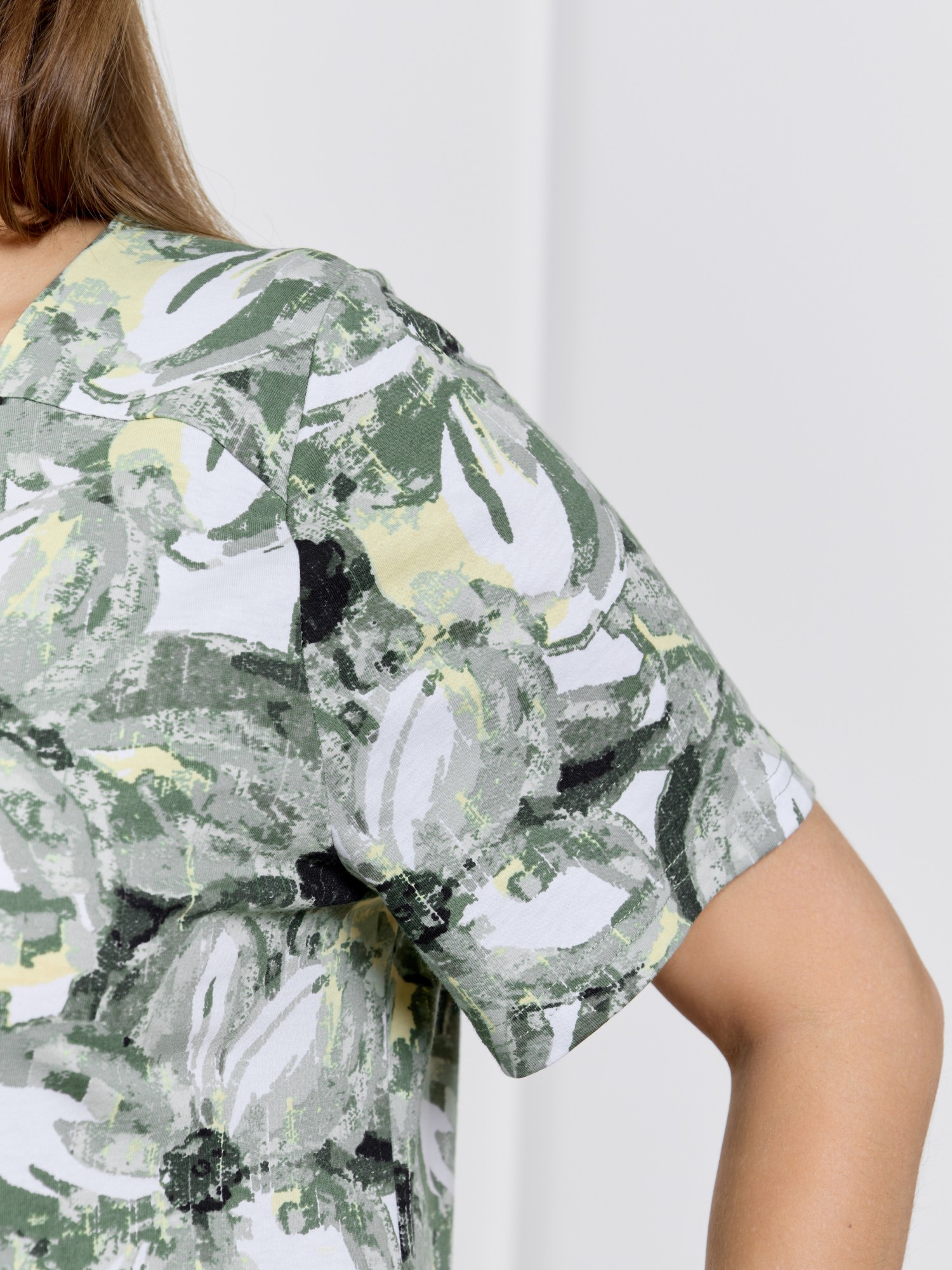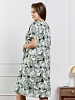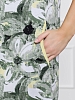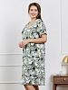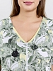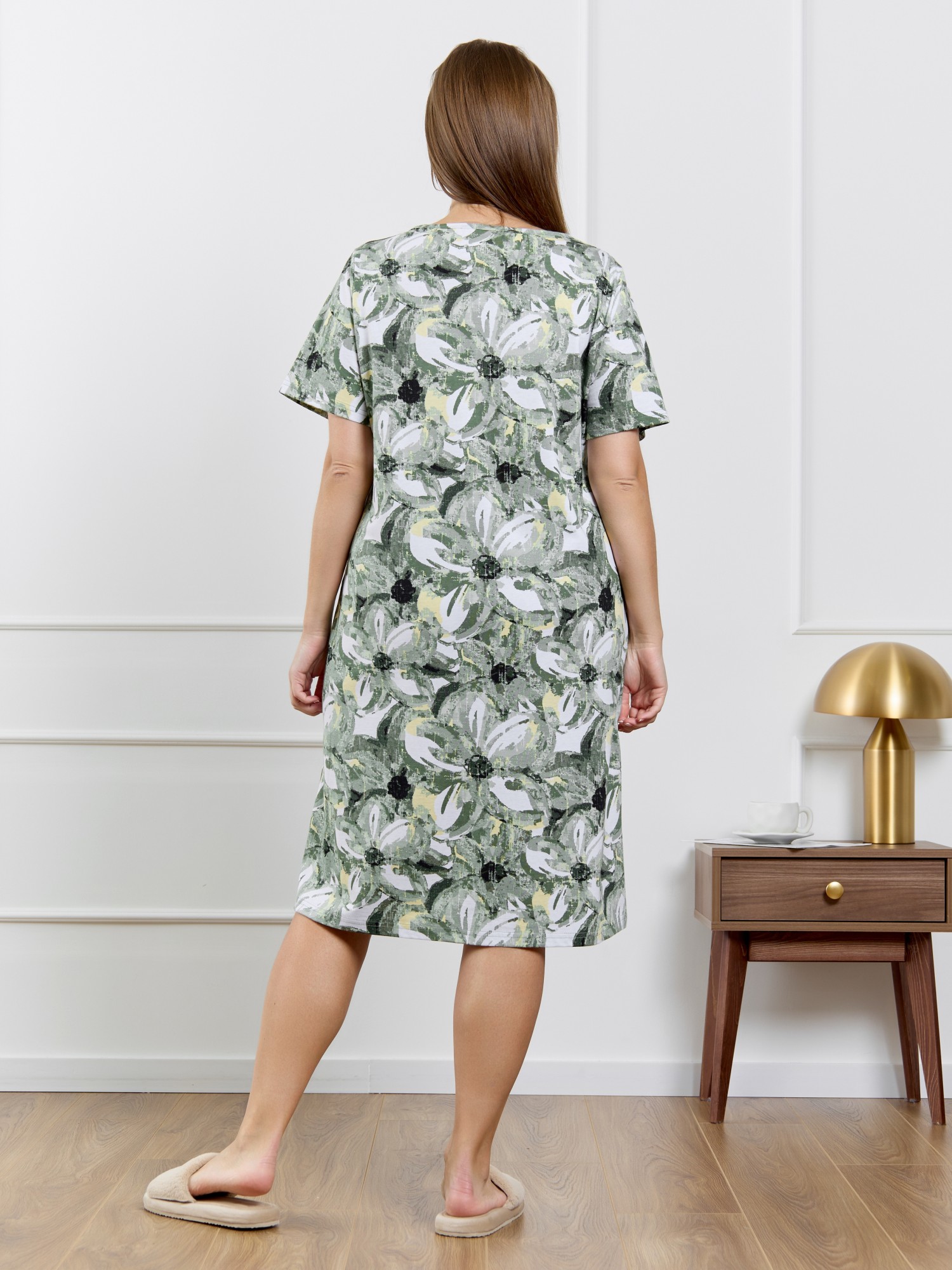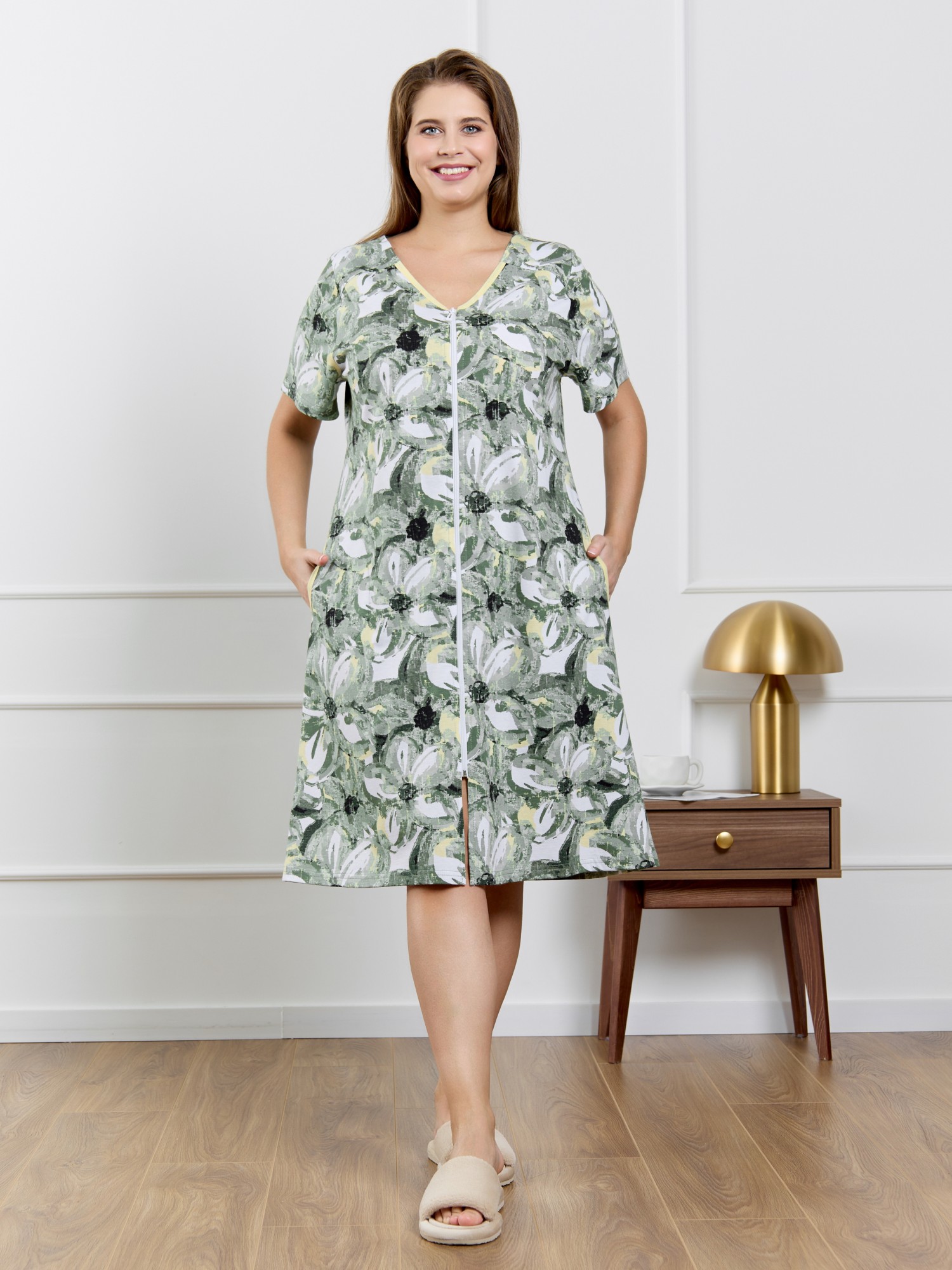Халат женский из трикотажного полотна «кулирка» с набивным рисунком, прямого силуэта, с короткими втачными рукавами, горловиной V- образной формы, карманами в боковых швах и центральной бортовой застежкой на тесьму «молния». Полочка – с двумя небольшими двойными кокетками, выполненными по косой линии. Горловина переда, входы в карманы окантованы контрастным материалом.