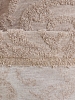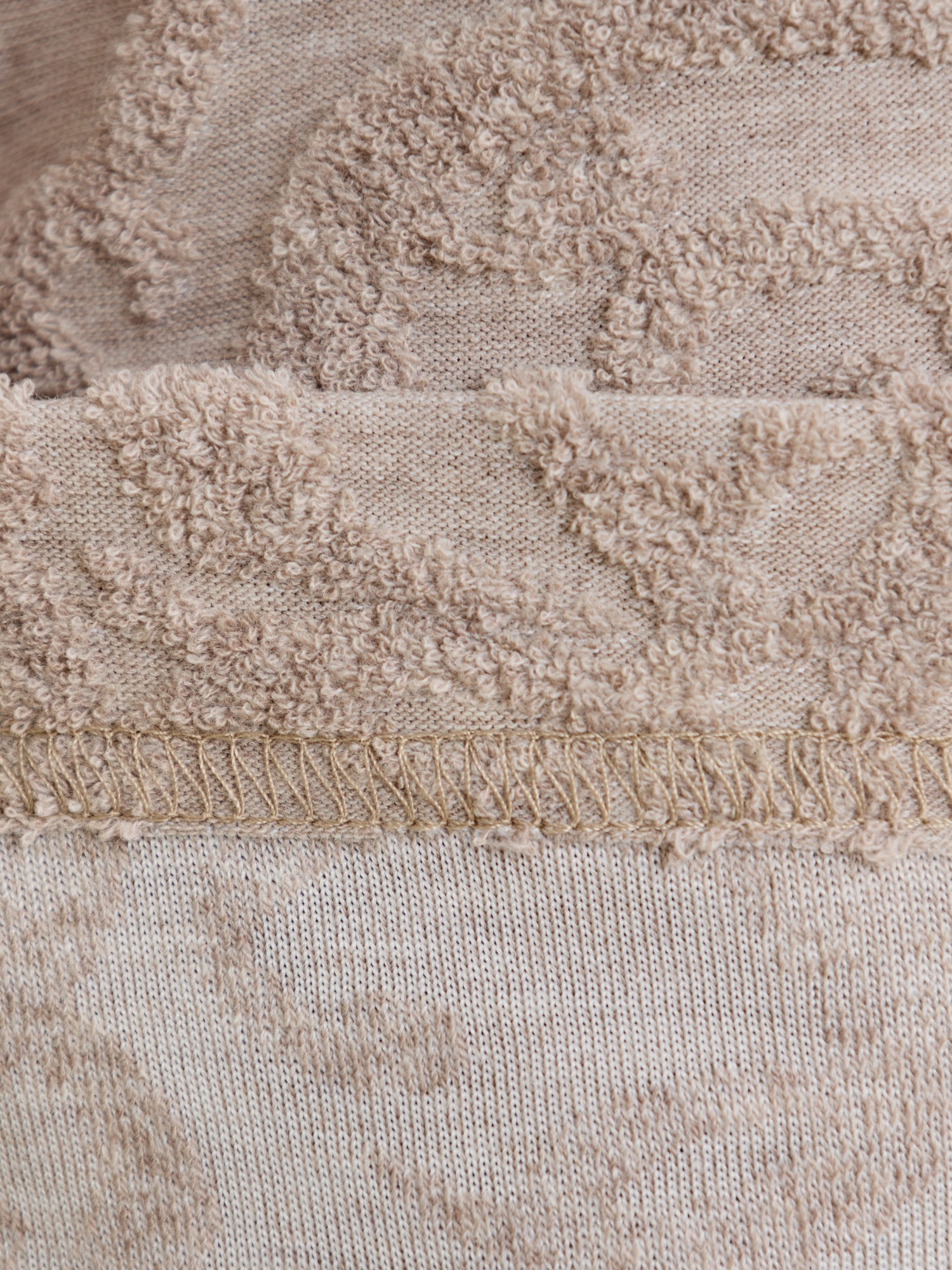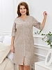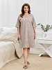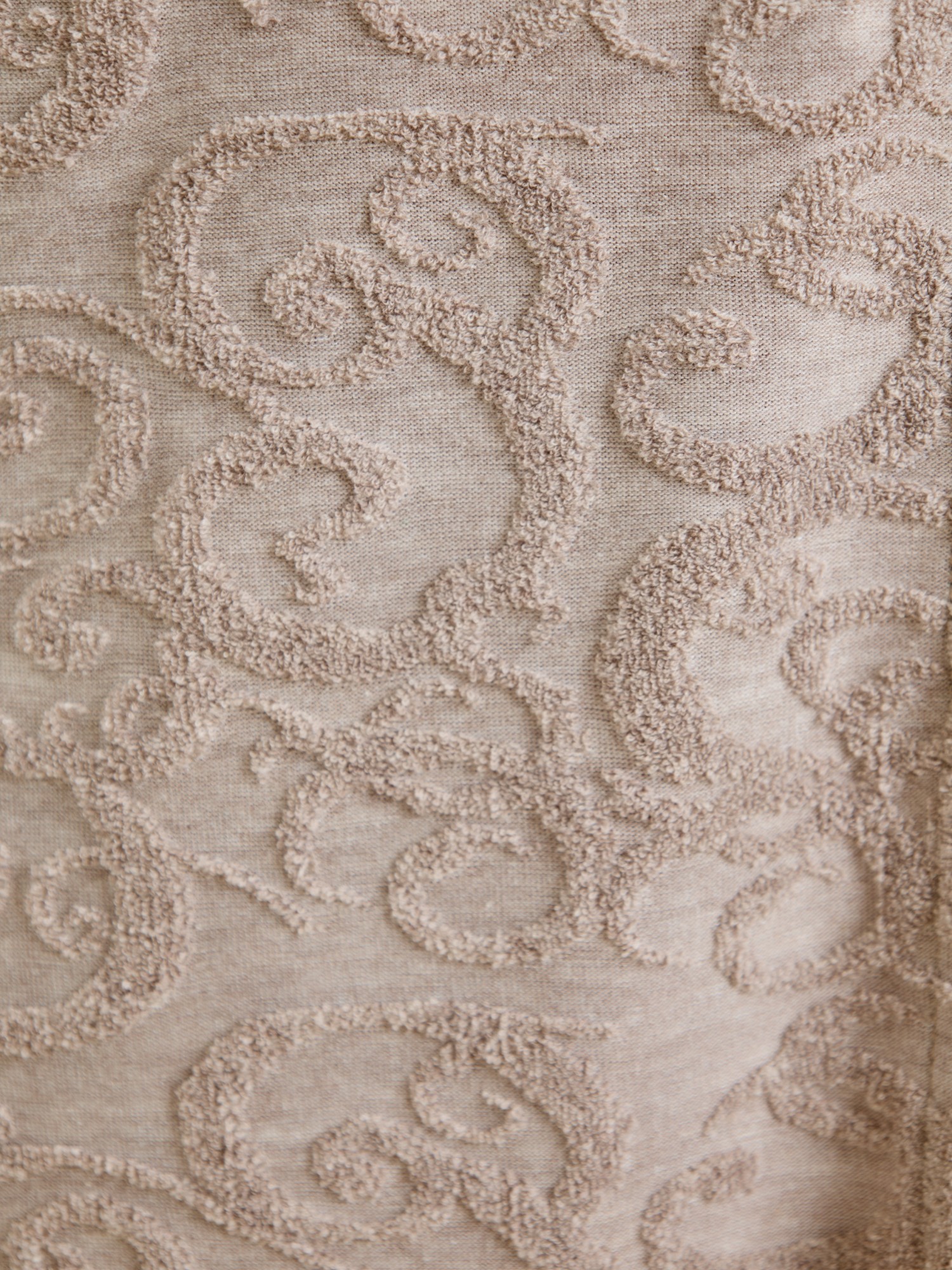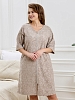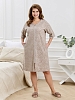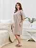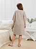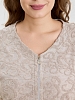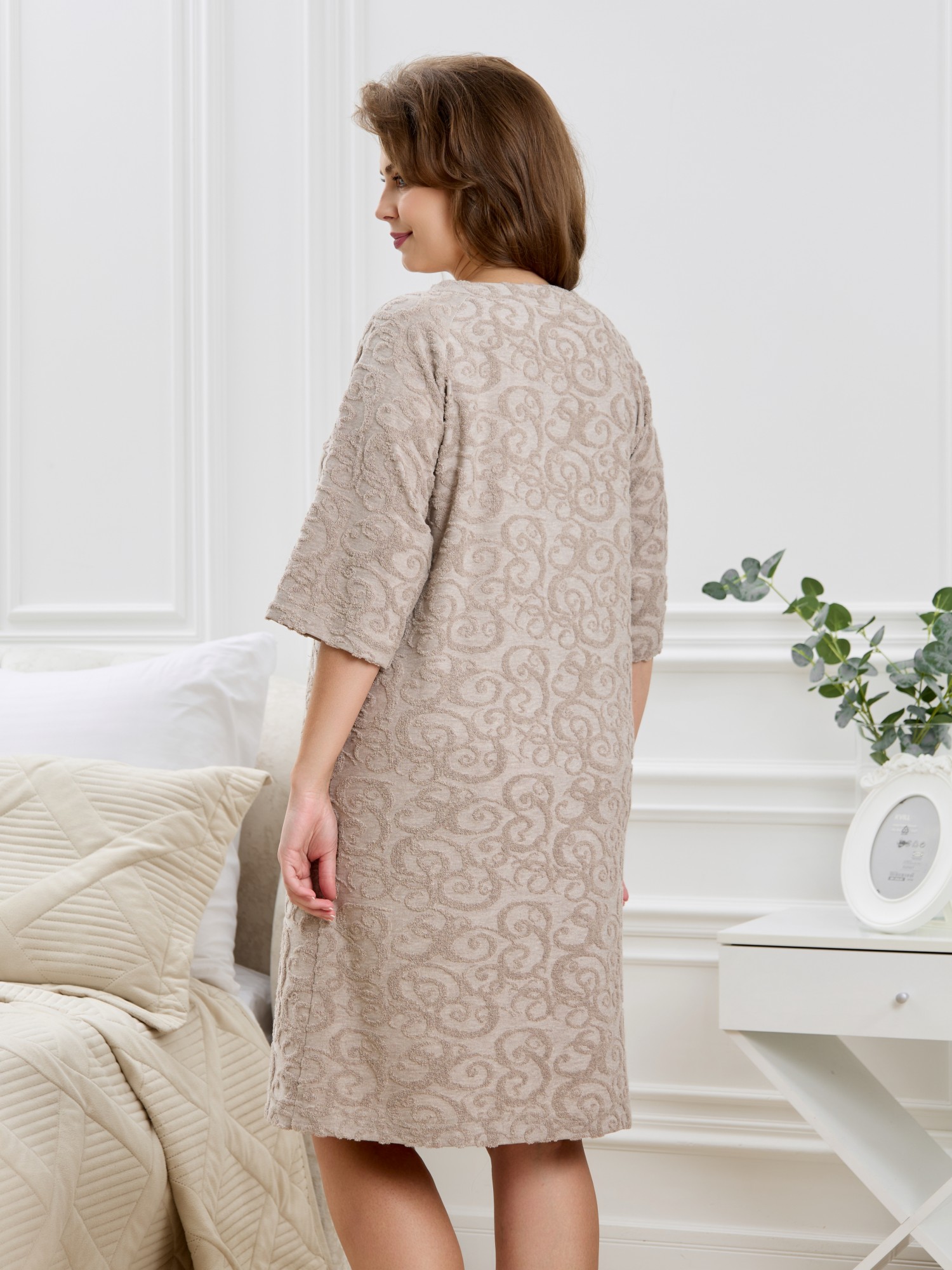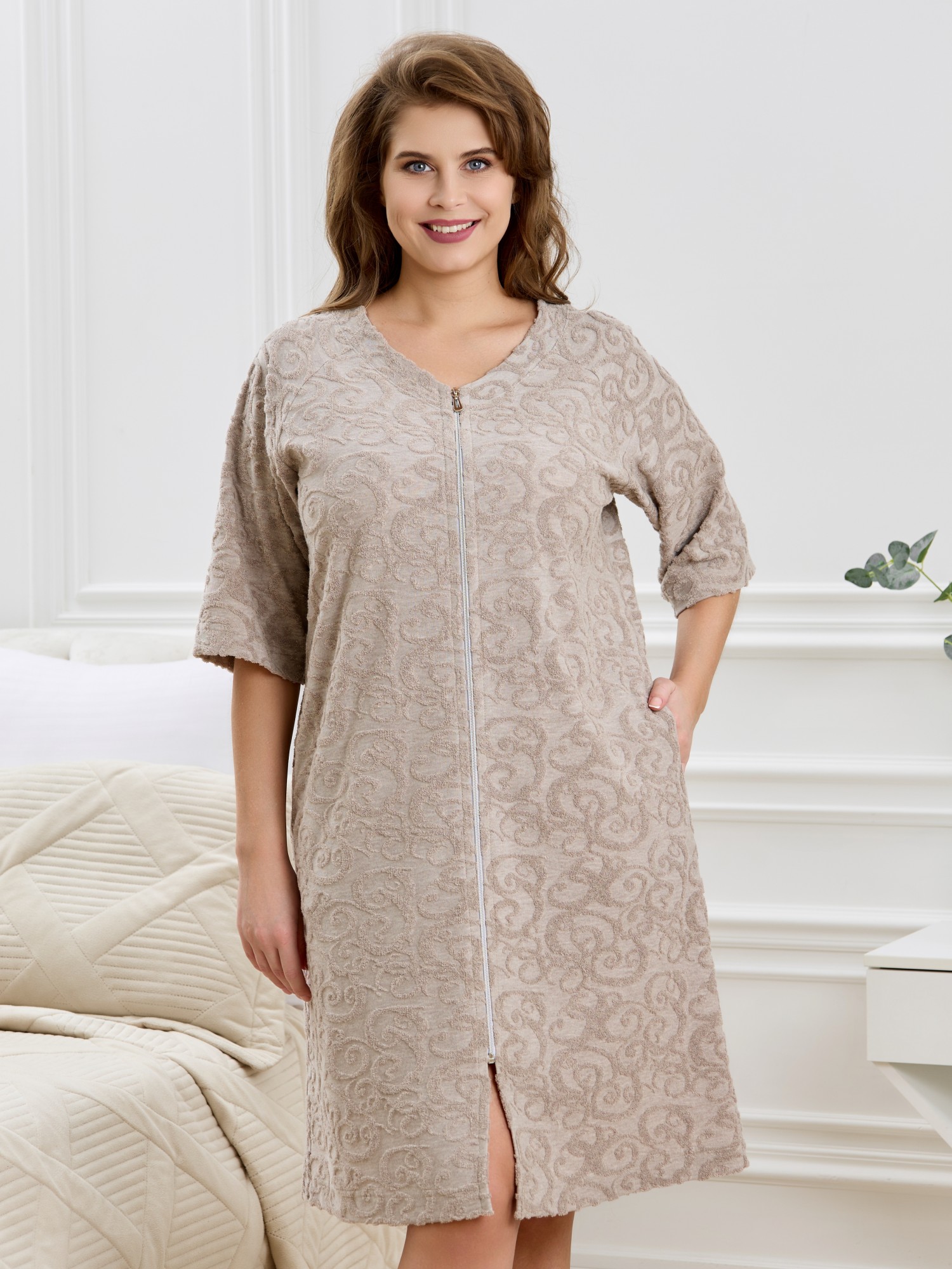 Халат женский из гладкокрашенного трикотажного полотна «махра» со стриженым рисунком. Изделие прямого силуэта, с втачными рукавами – «реглан» длиной до локтя, горловиной V-образной формы, карманами в боковых швах и центральной бортовой застежкой на тесьму «молния». Горловина обработана широкими втачными планками фигурной формы. По нижним срезам рукавов и изделия выполнена широкая подгибка.