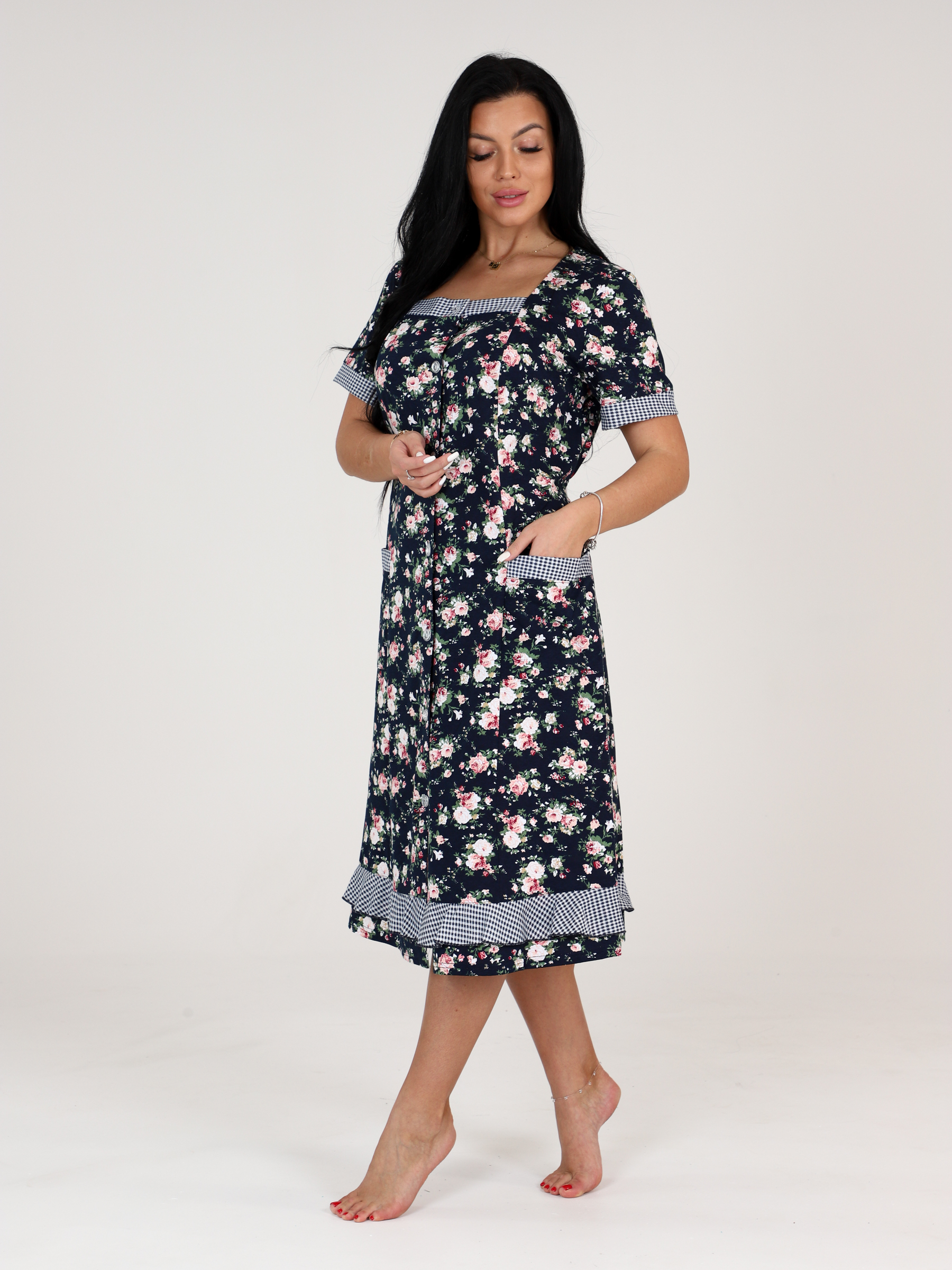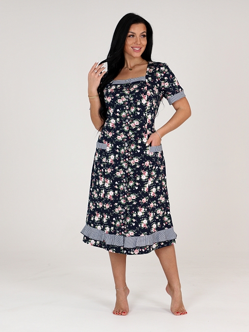 Халат летний удлиненный из хлопкового трикотажного полотна - кулирка. Халат с коротким рукавом на пуговицах. Халат представлен в больших размерах. Халат женский на пуговицах не будет расстегиваться при домашних хлопотах. Халат женский легкий ниже колена. Халат женский домашний больших размеров имеет удобные накладные карманы.