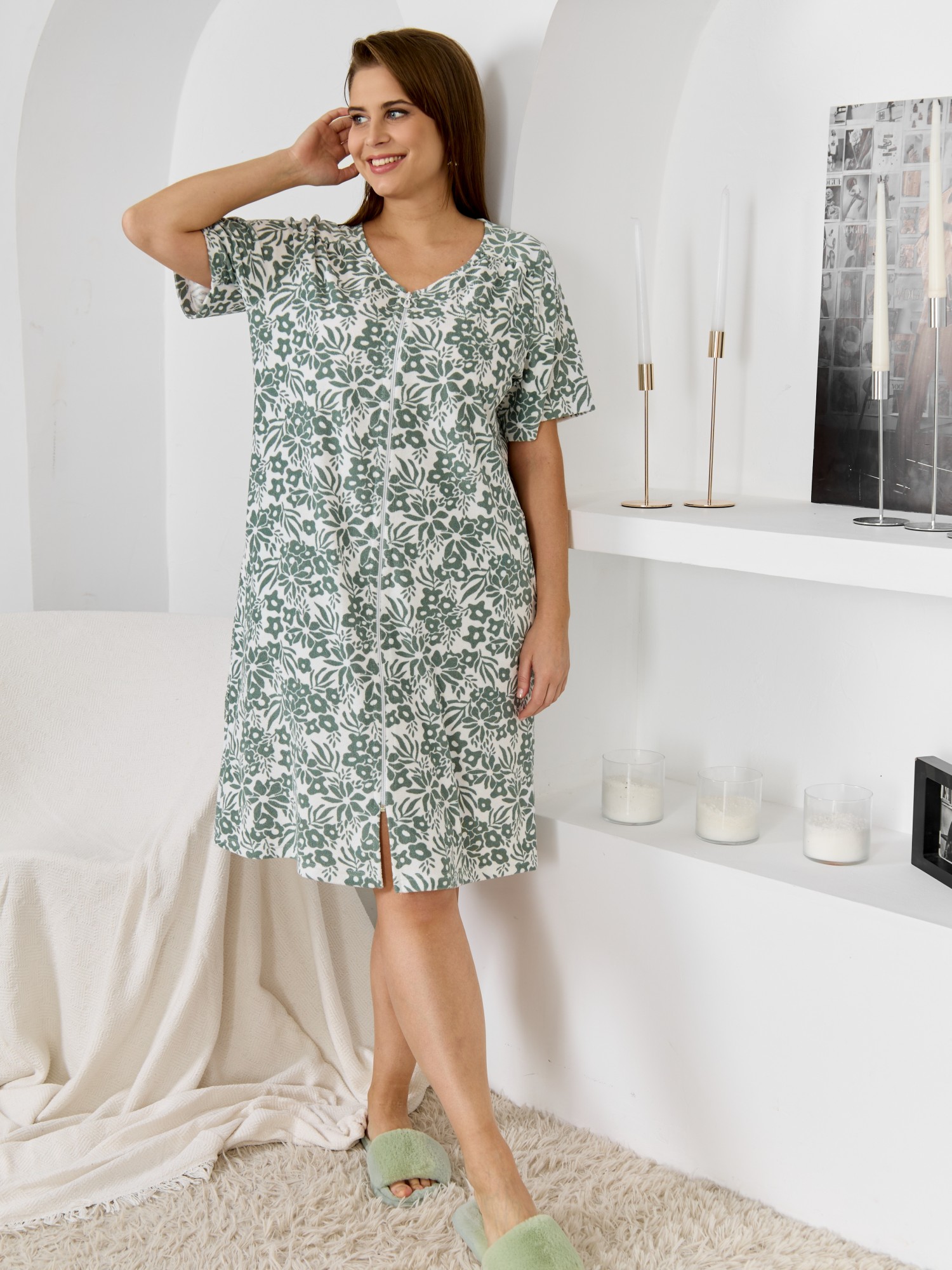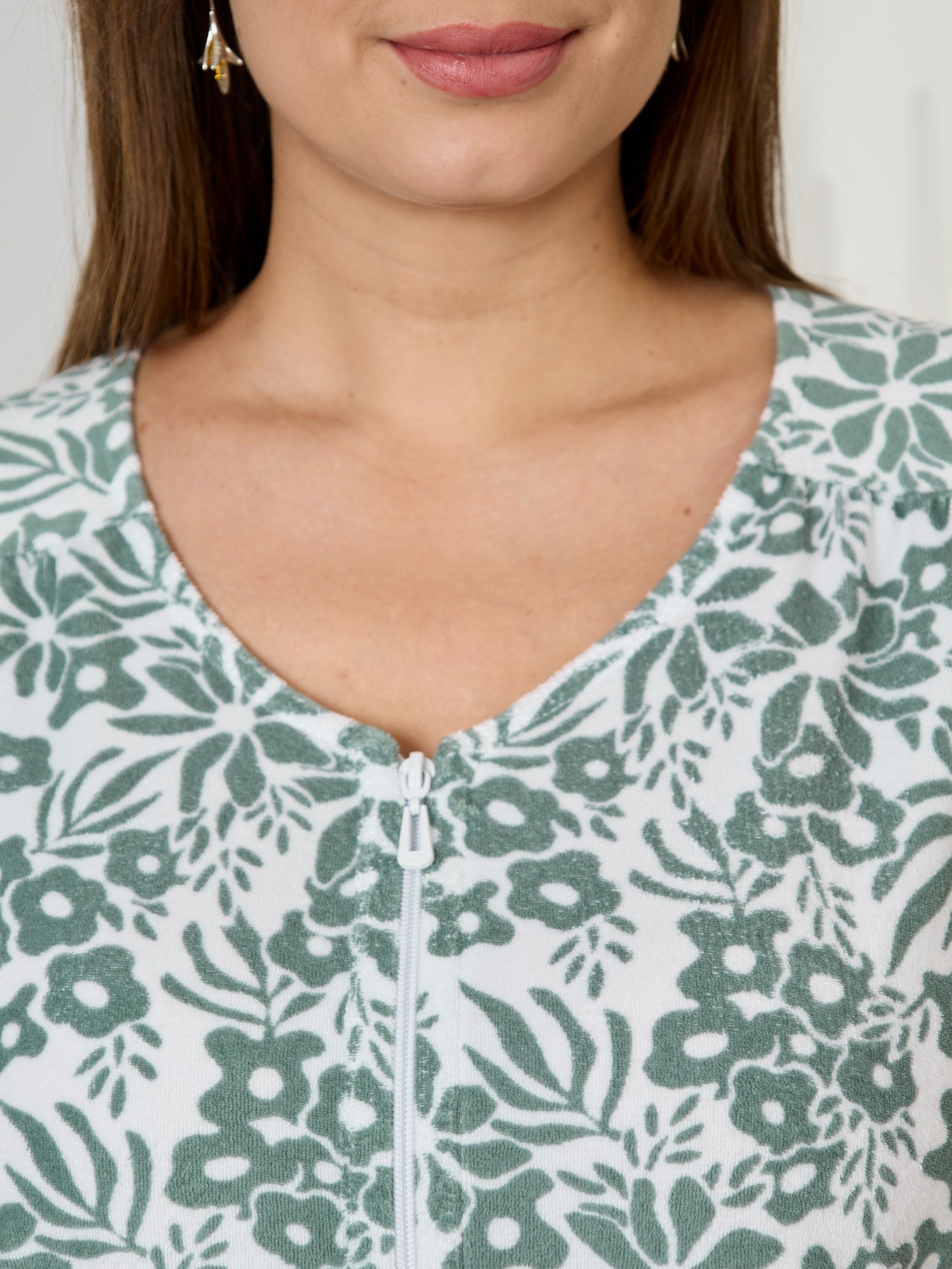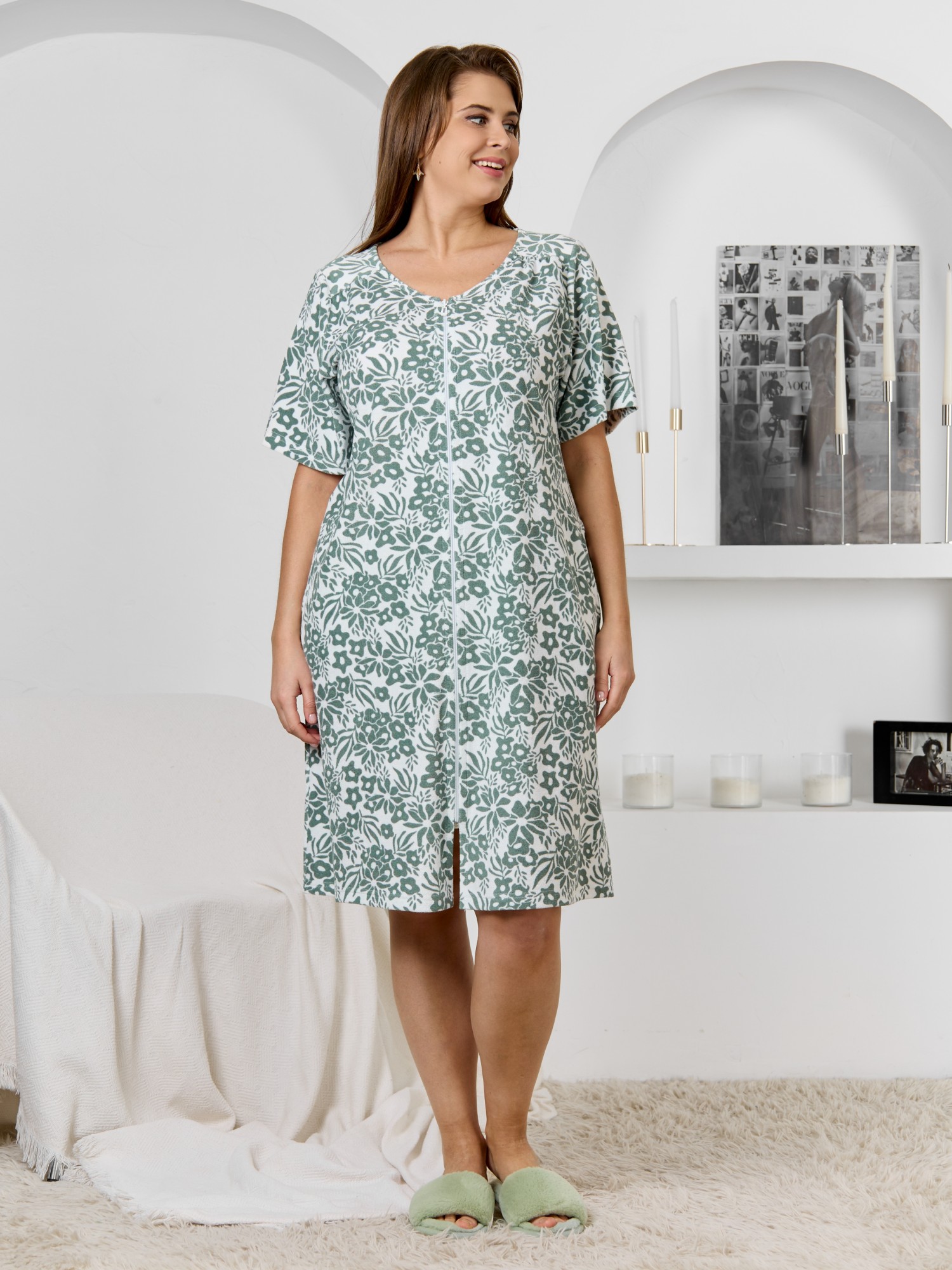 Халат женский из трикотажного полотна «махра» с набивным рисунком, слегка расширенный книзу, с короткими втачными рукавами, карманами в боковых швах, горловиной V-образной формы, центральной бортовой застежкой на тесьму «молния». Плечевые швы изделия переходят на деталь переда, имитируя притачные кокетки со сборкой.