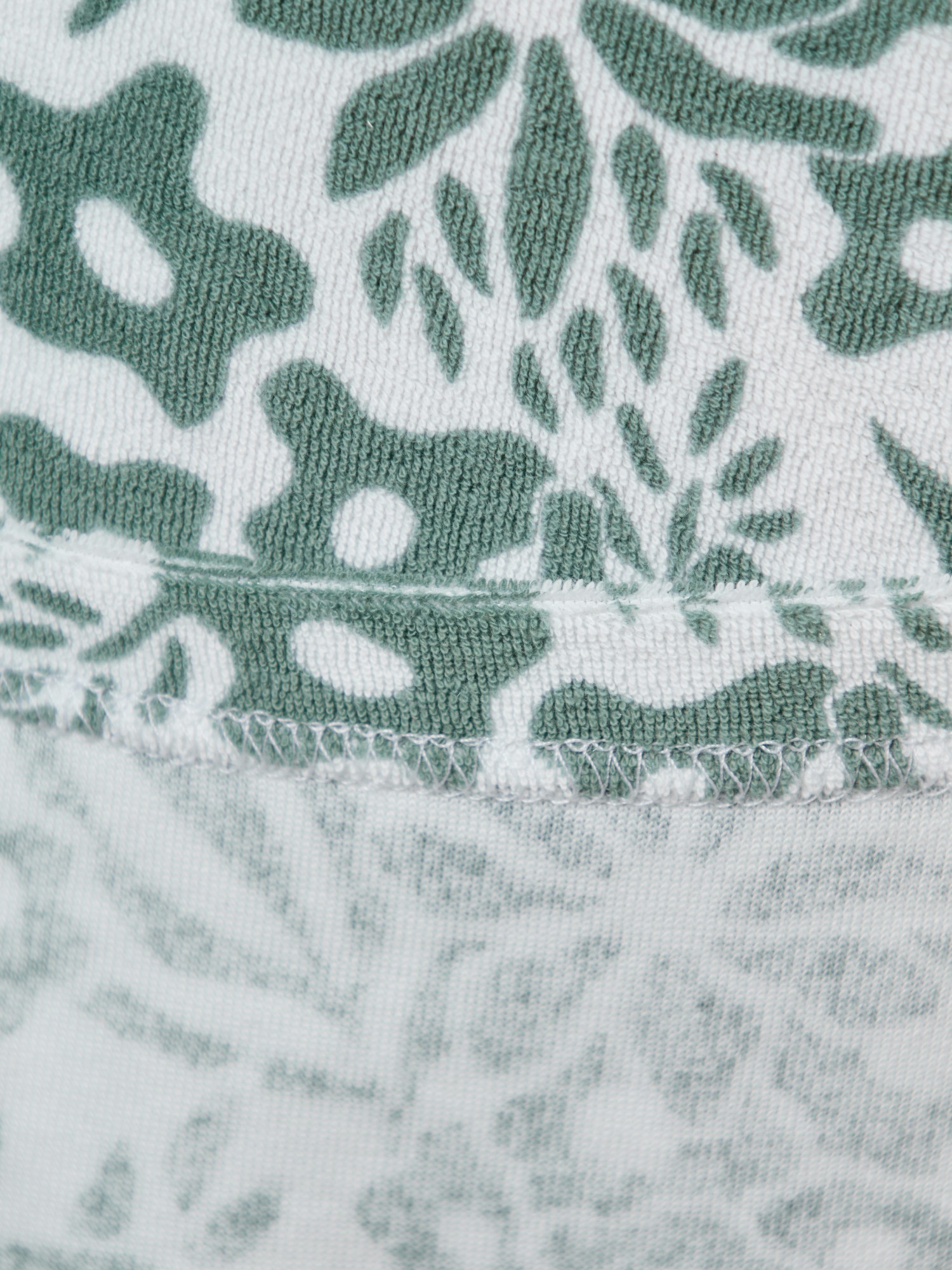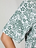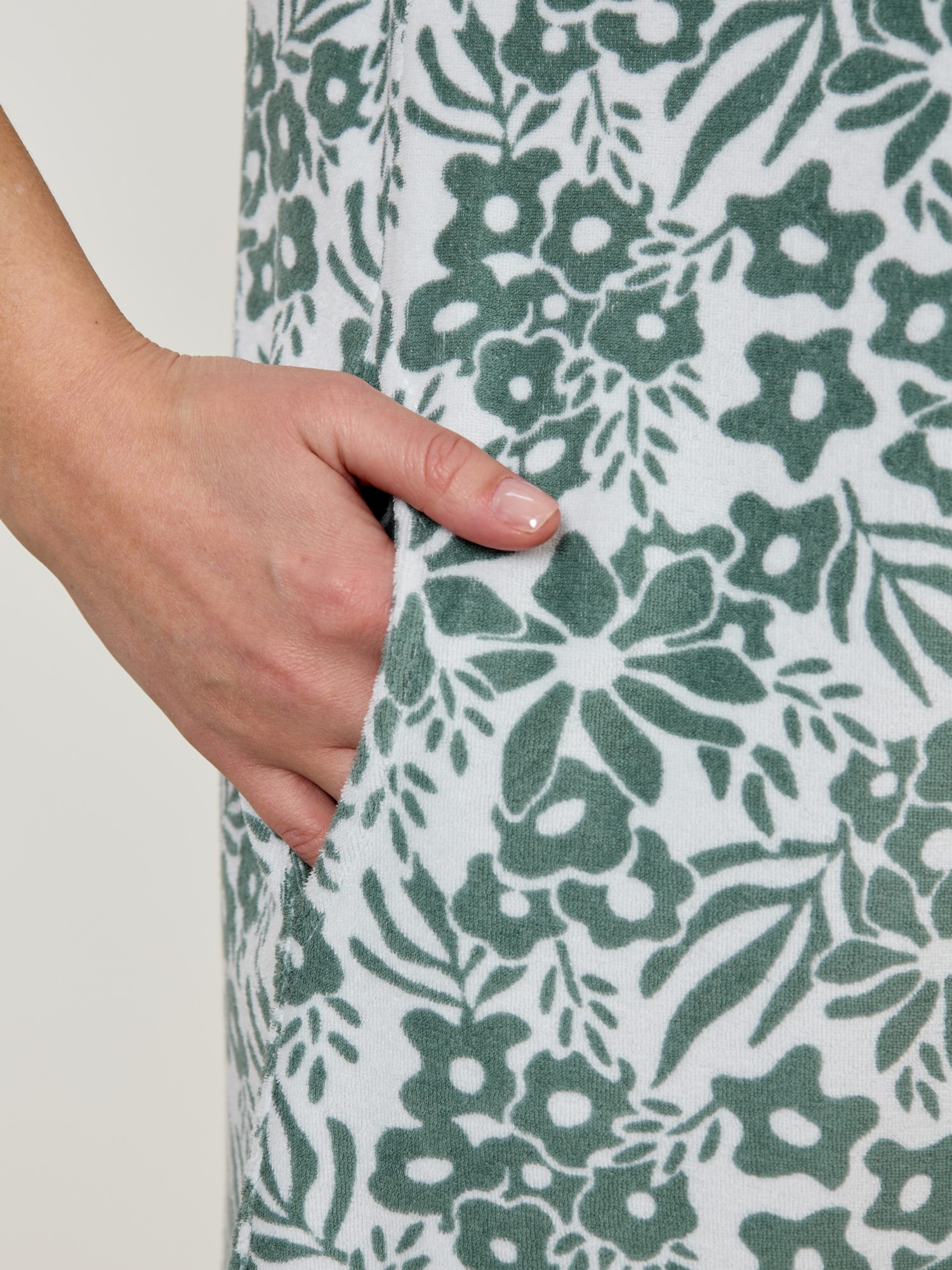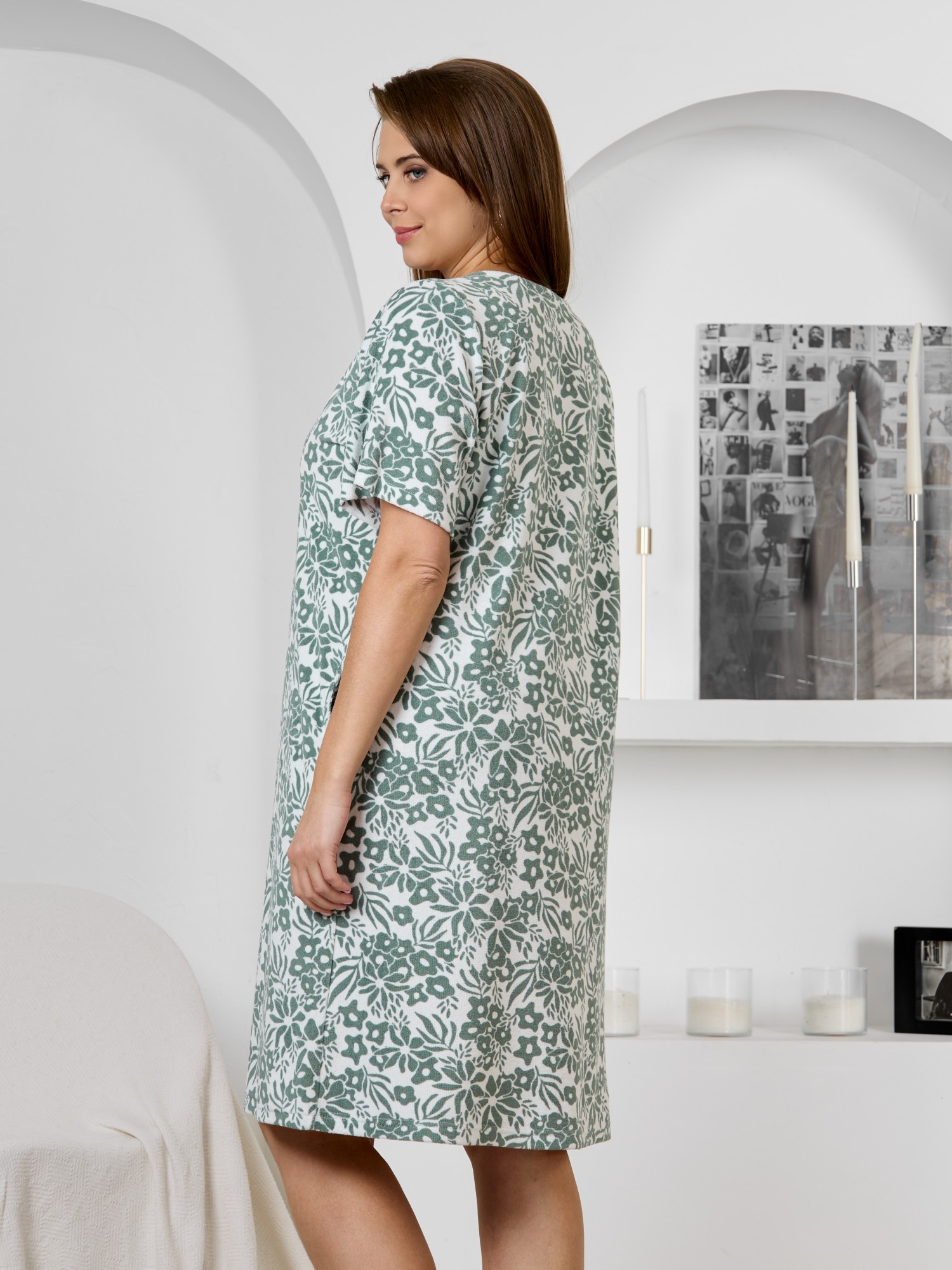 Халат женский из трикотажного полотна «махра» с набивным рисунком, слегка расширенный книзу, с короткими втачными рукавами, карманами в боковых швах, горловиной V-образной формы, центральной бортовой застежкой на тесьму «молния». Плечевые швы изделия переходят на деталь переда, имитируя притачные кокетки со сборкой.