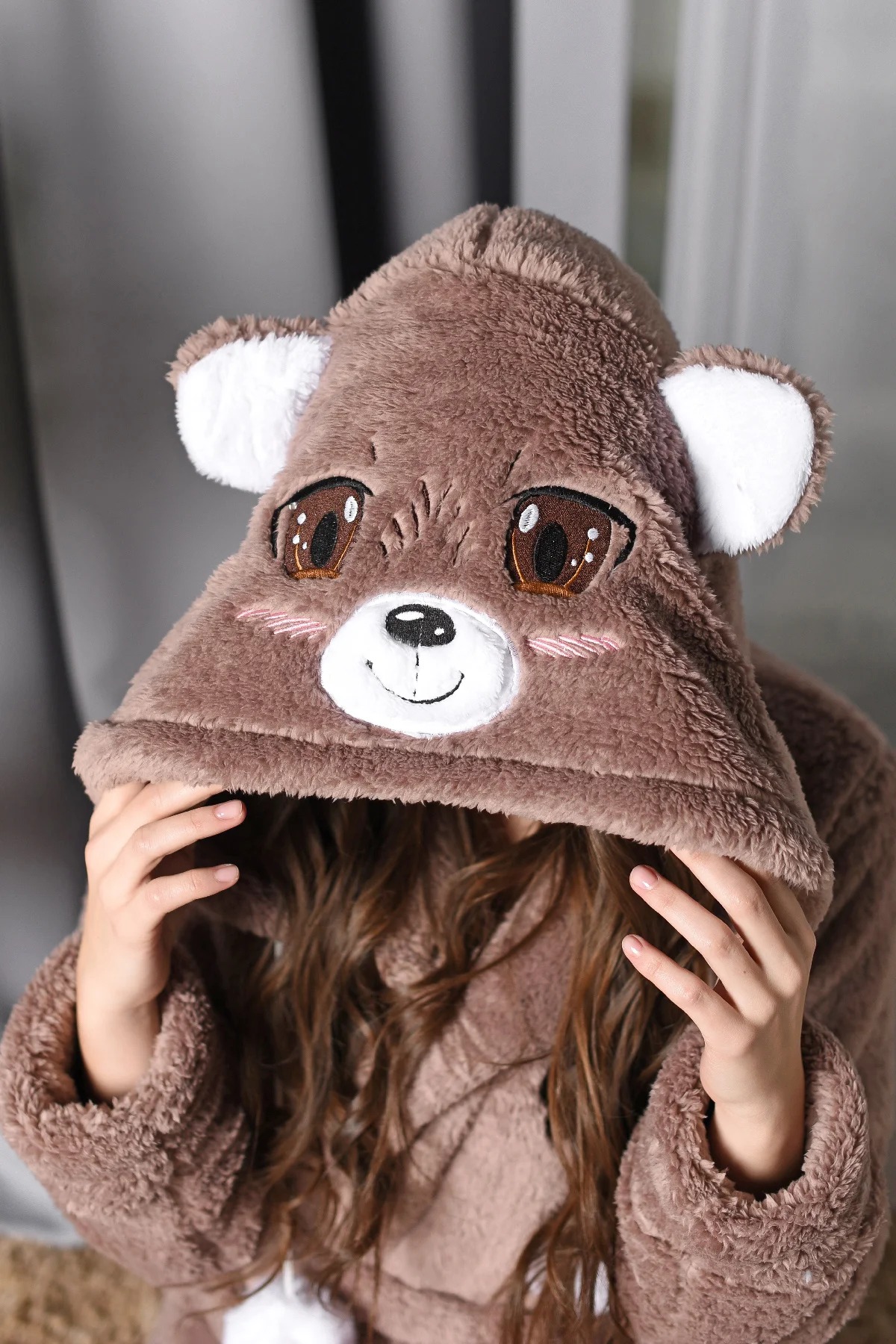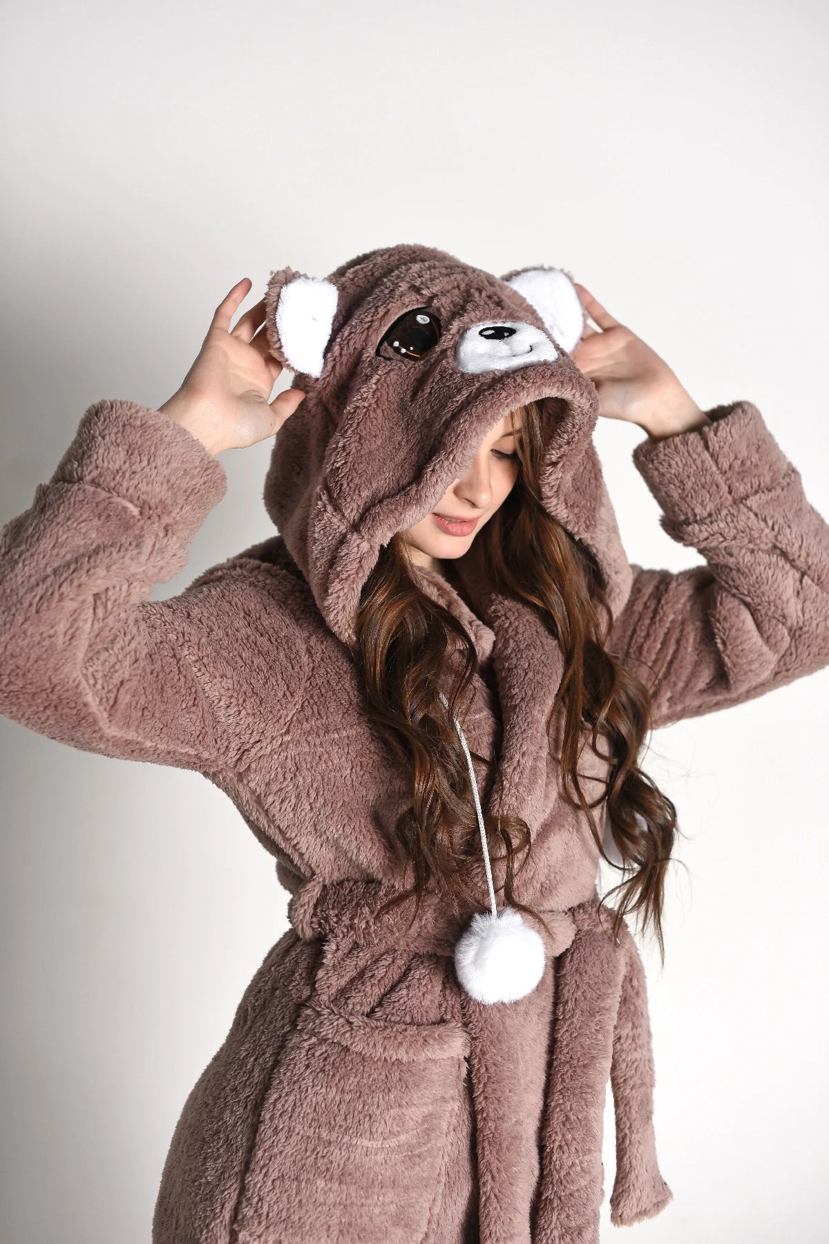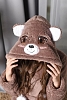 Халат Мишка Топтыжка запашной с поясом длиной выше колена с капюшоном, двумя накладными карманами, длинным втачным рукавом на манжете. На капюшоне вставка с тематической вышивкой, шнур с бомбошками. Низ изделия обработан швом «в подгибку».