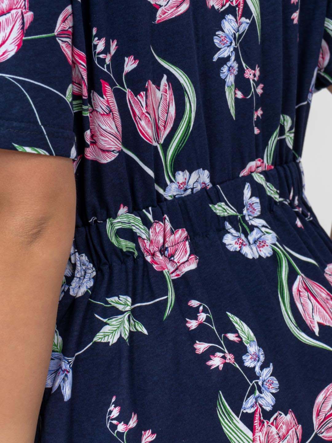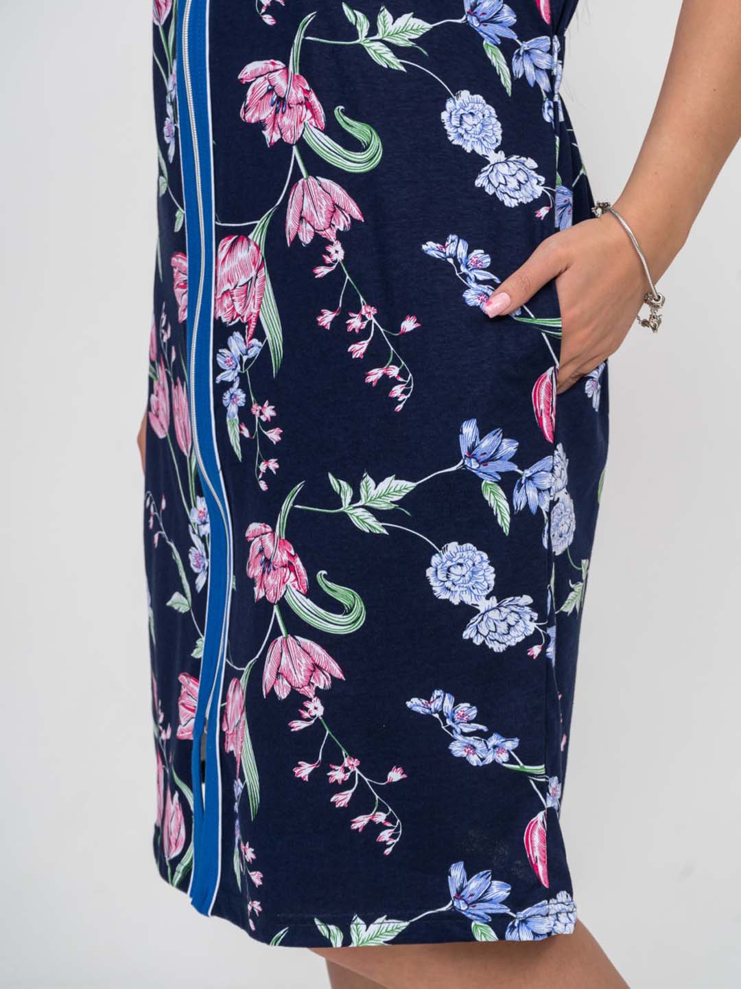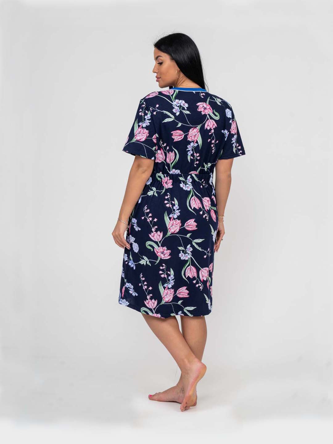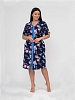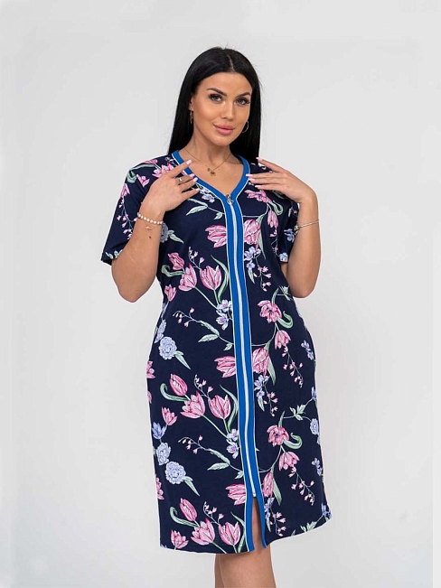 Халат женский на молнии, полуприлегающего силуэта, с V-образной горловиной, рукав короткий прямой, на полочке карманы в боковых швах, спинка с резинкой по талии, длиной до колен.