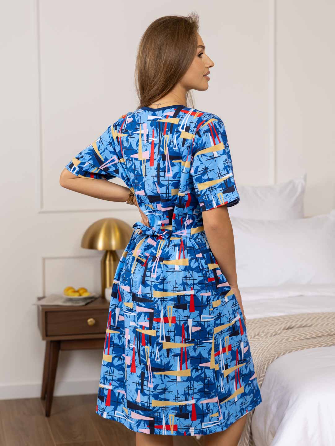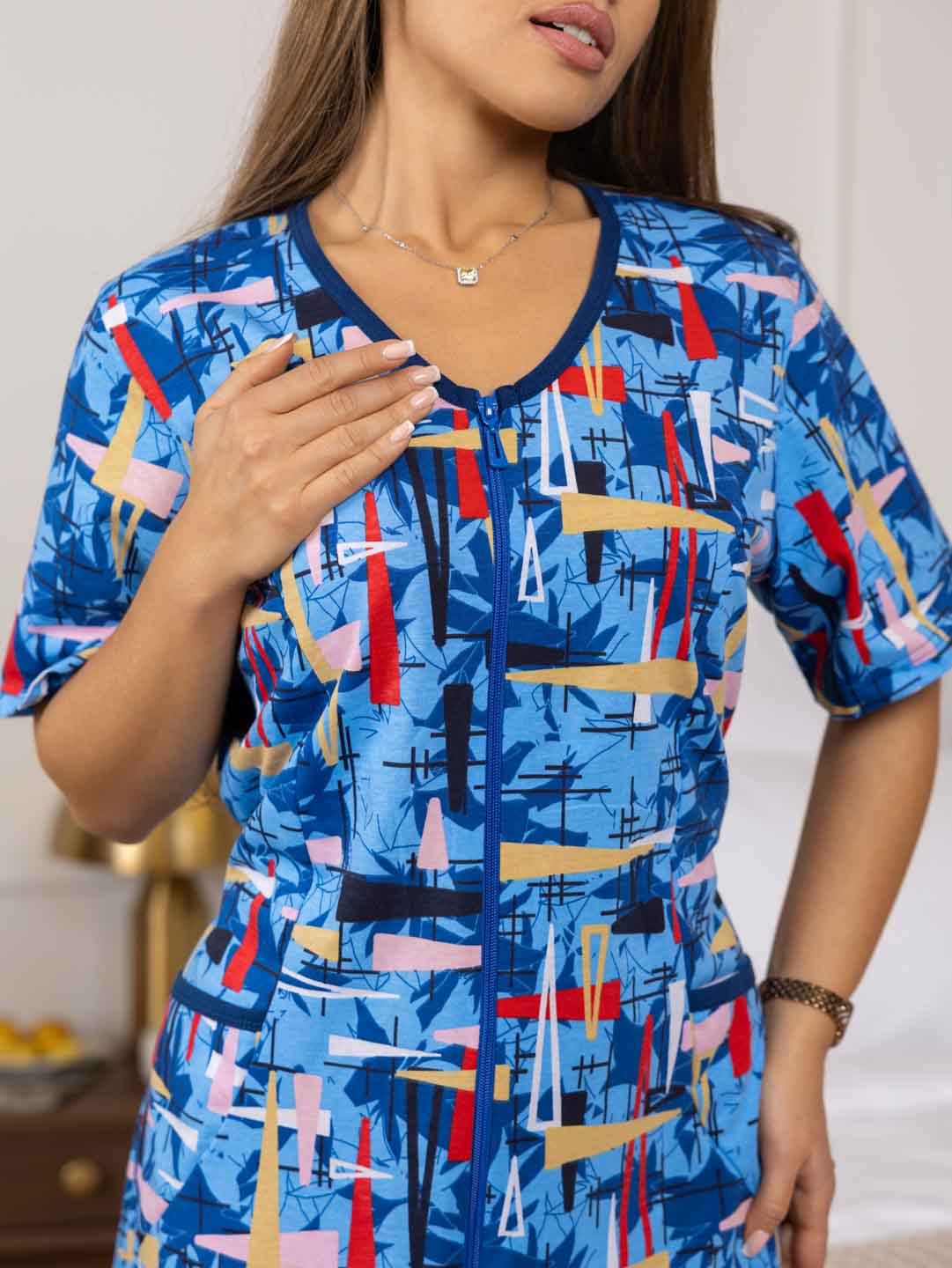 Халат женский из 100% хлопка, полуприлегающего силуэта длиной чуть выше уровня колена. Халат выполнен из яркой ткани, с застежкой на молнию. На полочке присутствуют накладные карманы с отделкой в верхней части. Вырез горловины V-образный, обработанный окантовкой. Идеально подойдет для дома, в нашем халате вы будете чувствовать себя комфортно пока занимаетесь домашними делами.