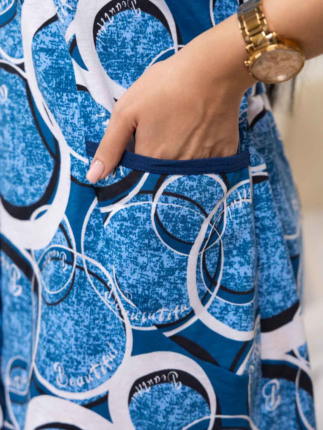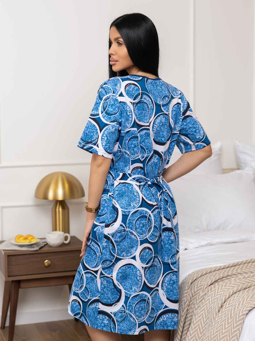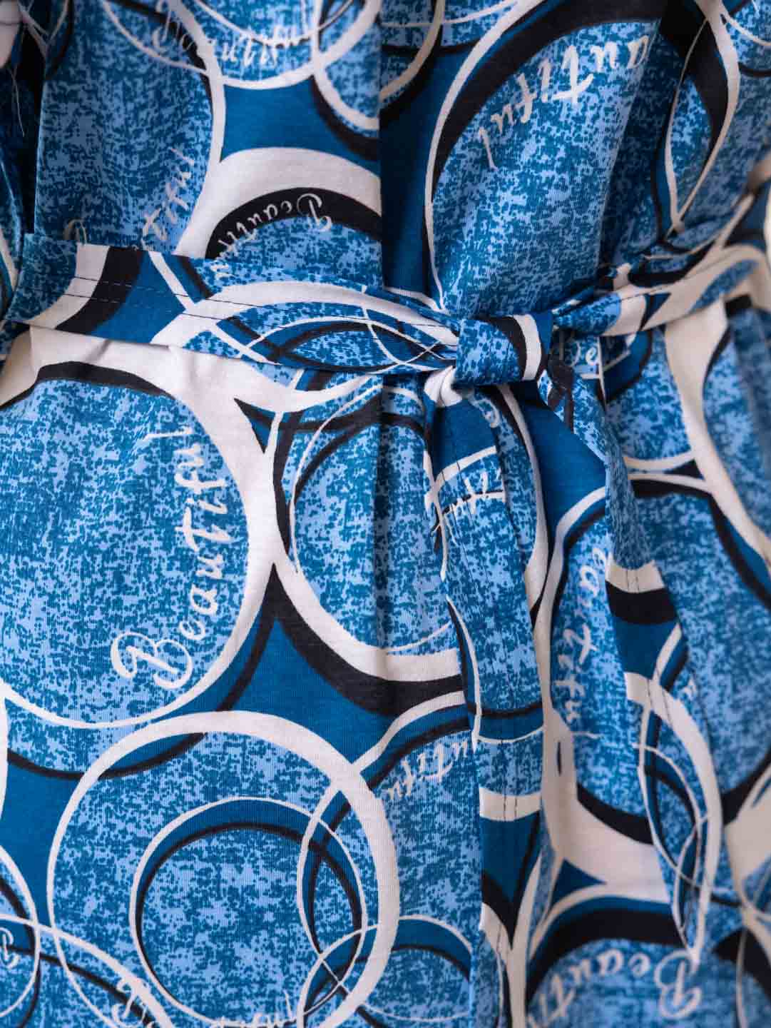 Халат женский из трикотажа, длиной до уровня колена. Рукав - втачной, длиной 1/2. Вырез горловины О-образный. Застежка на пуговицы.