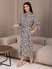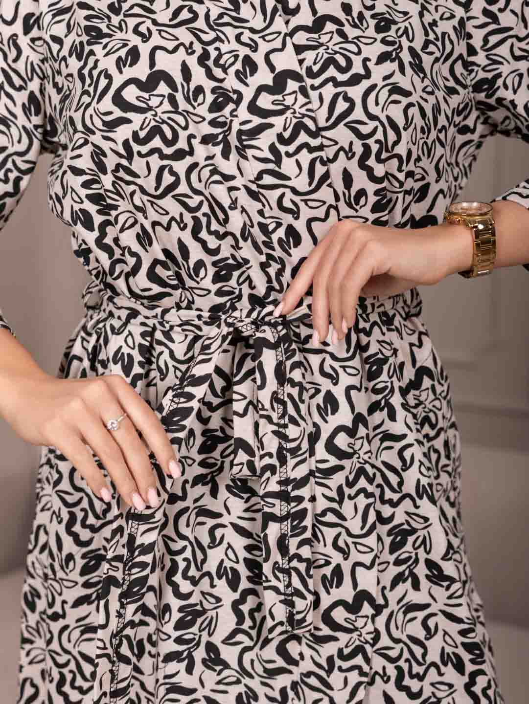 Халат женский из трикотажа. На полочке присутствуют два кармана. Рукав втачной базового покроя, длиной 3/4.