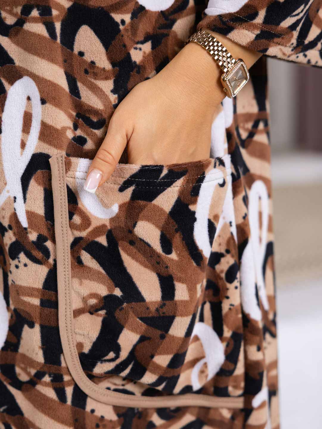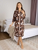 Халат женский трикотажный, длиной ниже колена. Данная модель имеет отложной воротник и застежку на молнию. Рукав - втачной, длиной 3/4. Большие удобные накладные карманы.