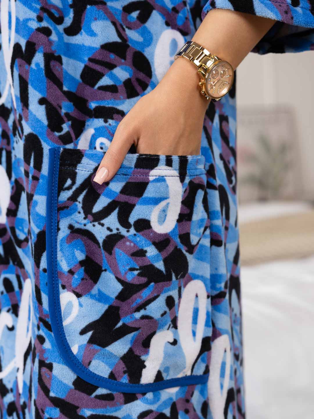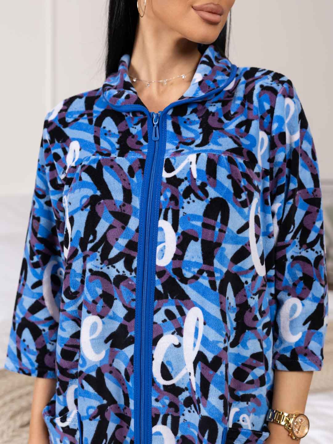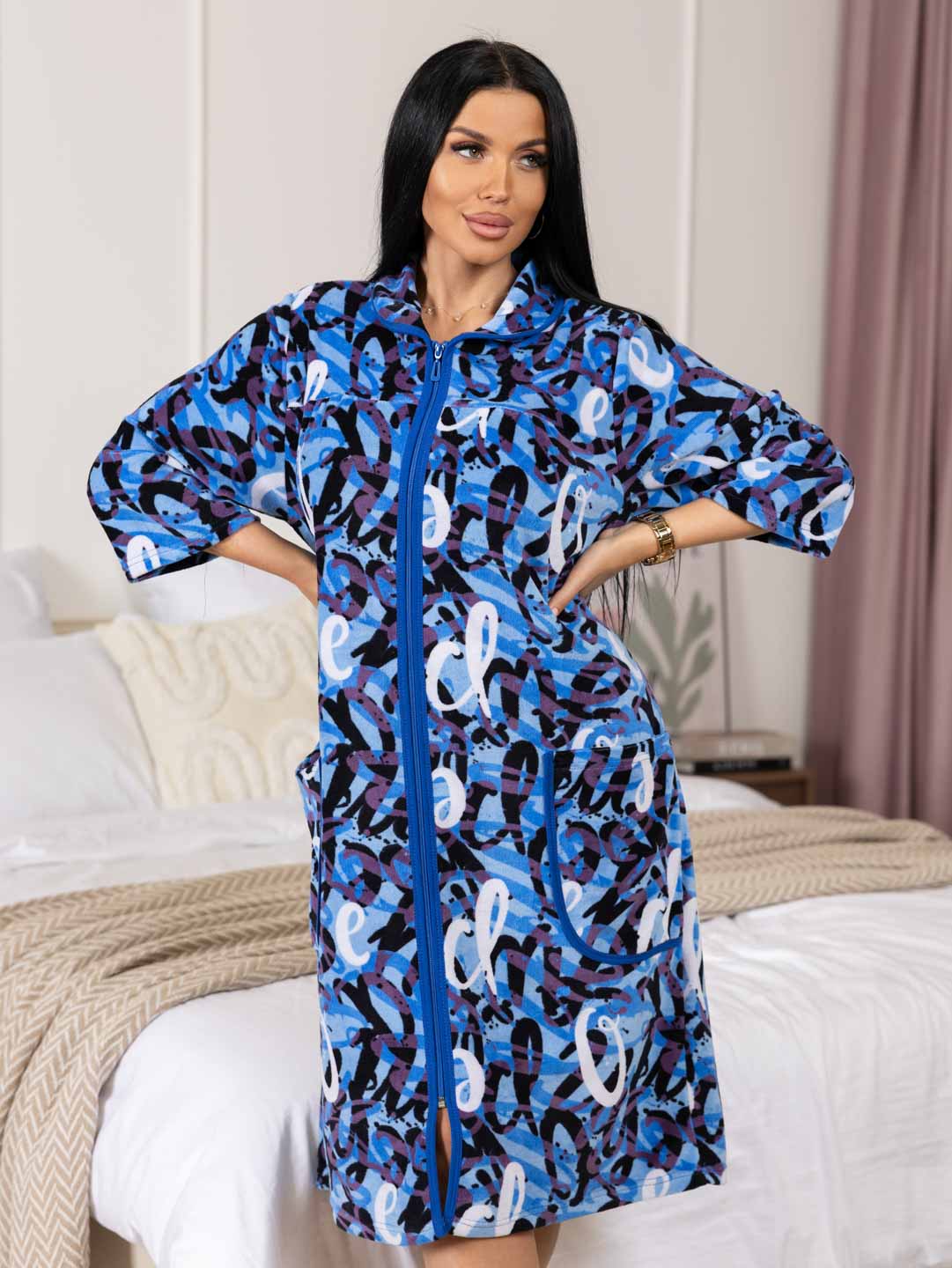 Халат женский трикотажный, длиной ниже колена. Данная модель имеет отложной воротник и застежку на молнию. Рукав - втачной, длиной 3/4. Большие удобные накладные карманы.