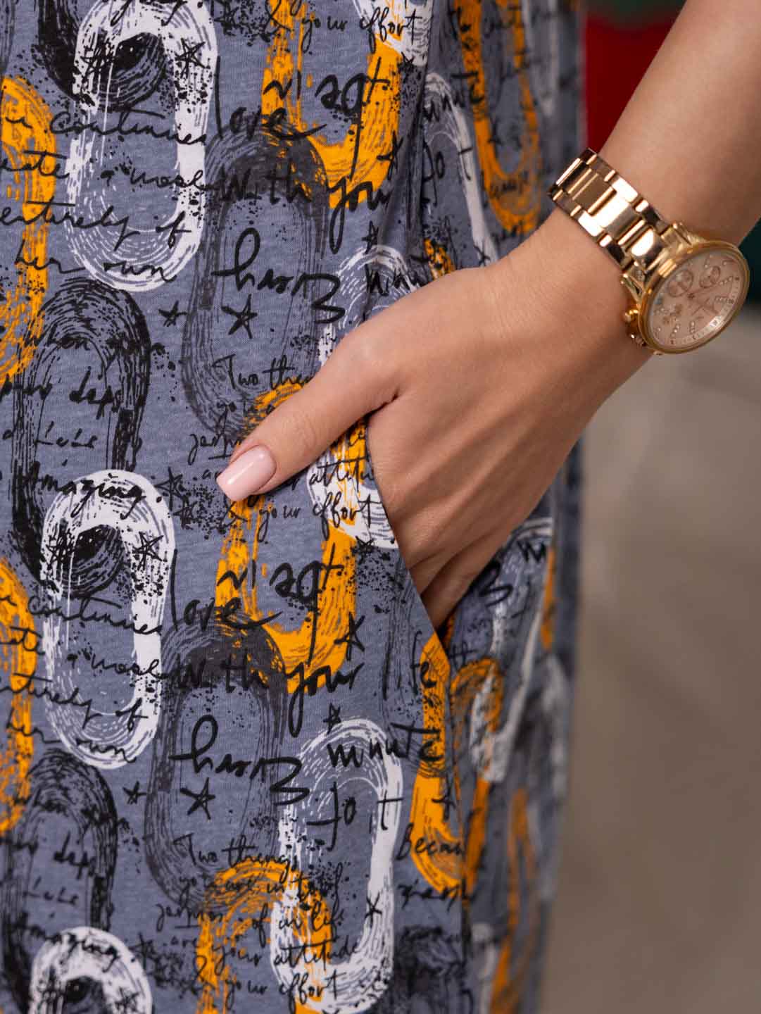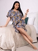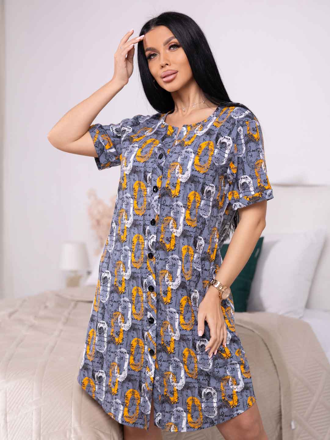 Халат женский трикотажный, длиной до уровня колена. Изделие имеет классический округлый вырез, с застежкой на пуговицы. Рукав - короткий, на манжетах. Удобные карманы с отрезным бочком.