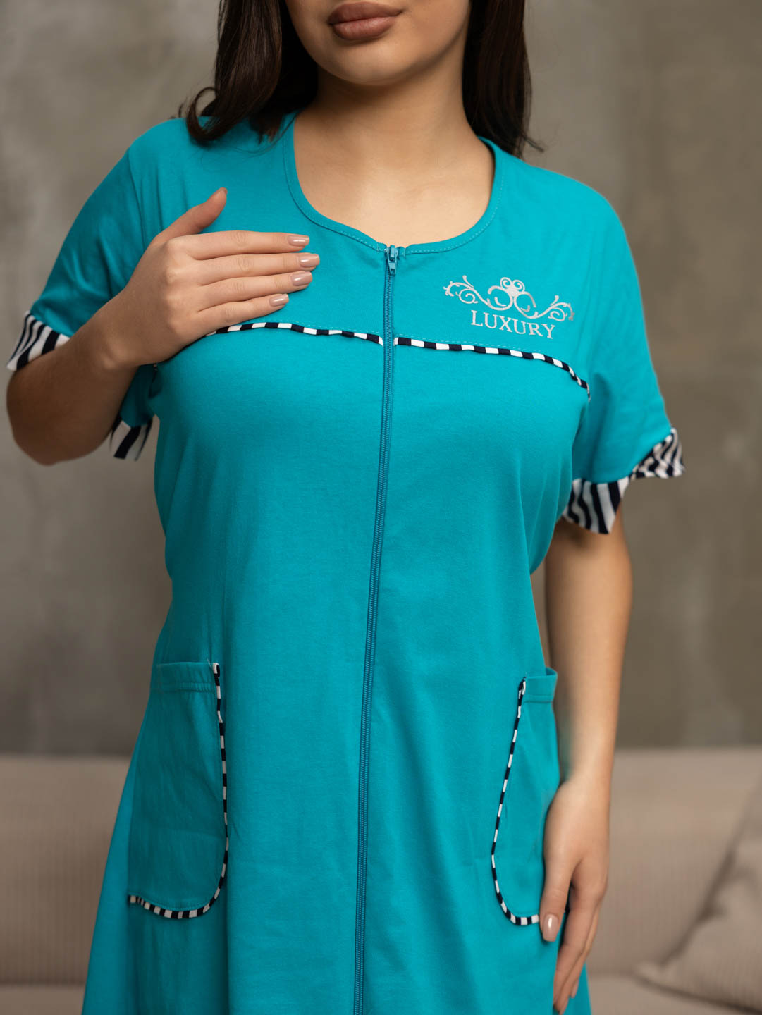 Женский халат из хлопка, на молнии, длиной чуть ниже колена, с контрастными вставками по кокетке, рукаву и карману. На кокетке печать с эффектом мерцания. Рост модели 167.