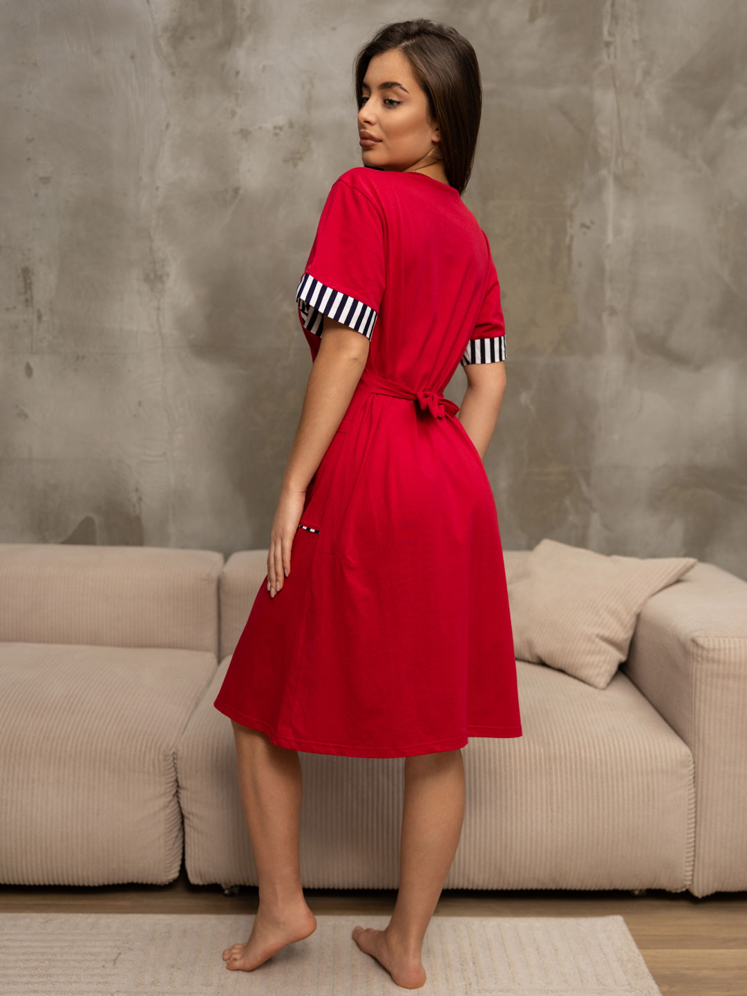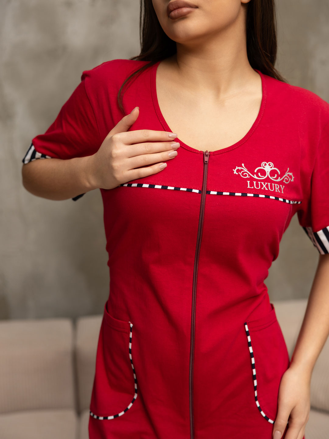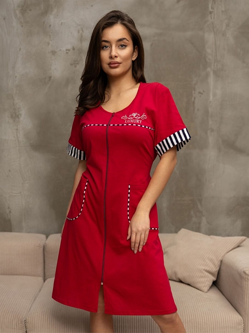Женский халат из хлопка, на молнии, длиной чуть ниже колена, с контрастными вставками по кокетке, рукаву и карману. На кокетке печать с эффектом мерцания. Рост модели 167.