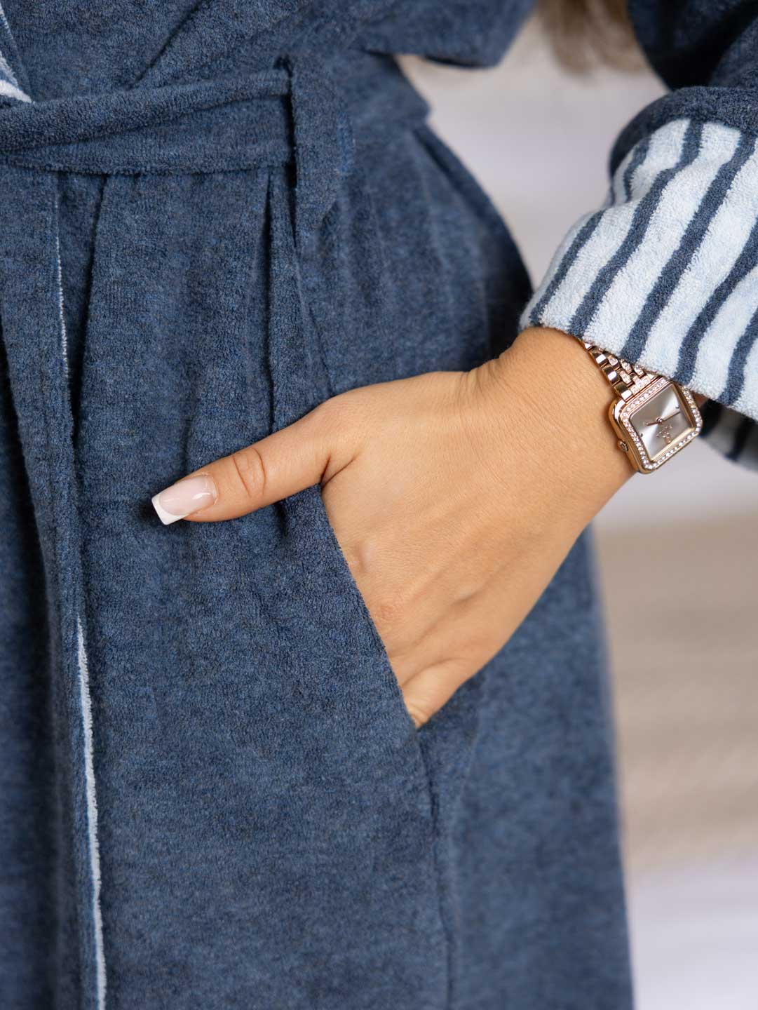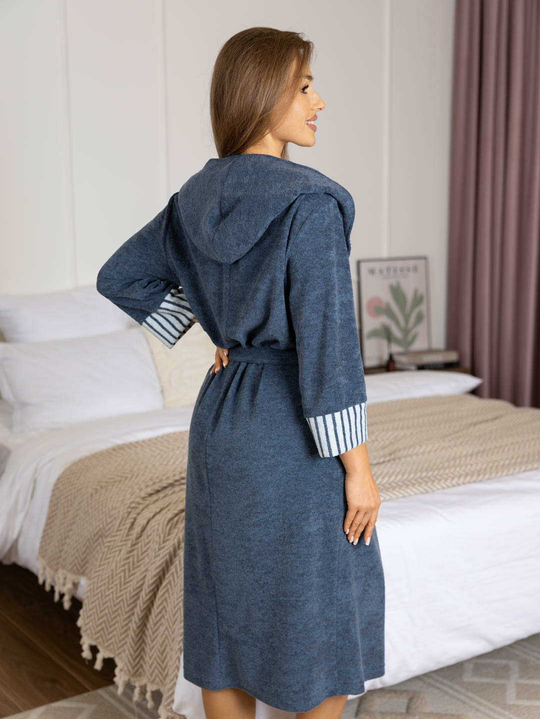 Халат женский на запах из турецкой махры с капюшоном шалью, рукавом 3/4, карманами в боковых швах, длиной ниже колена, внутренними завязками и поясом-кушаком. Внутренний капюшон, подборт и манжеты, скроены из ткани компаньона.